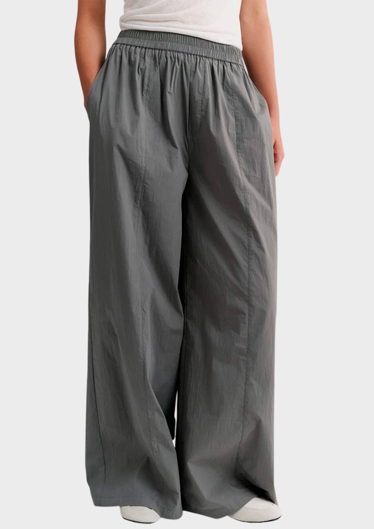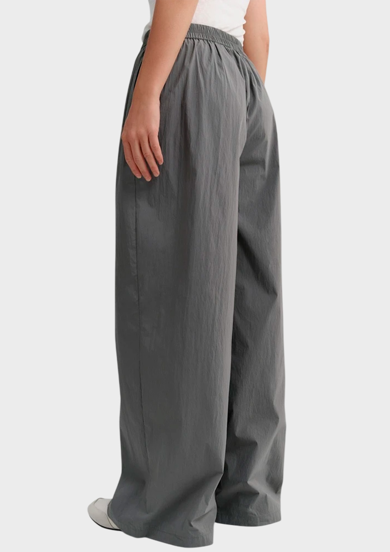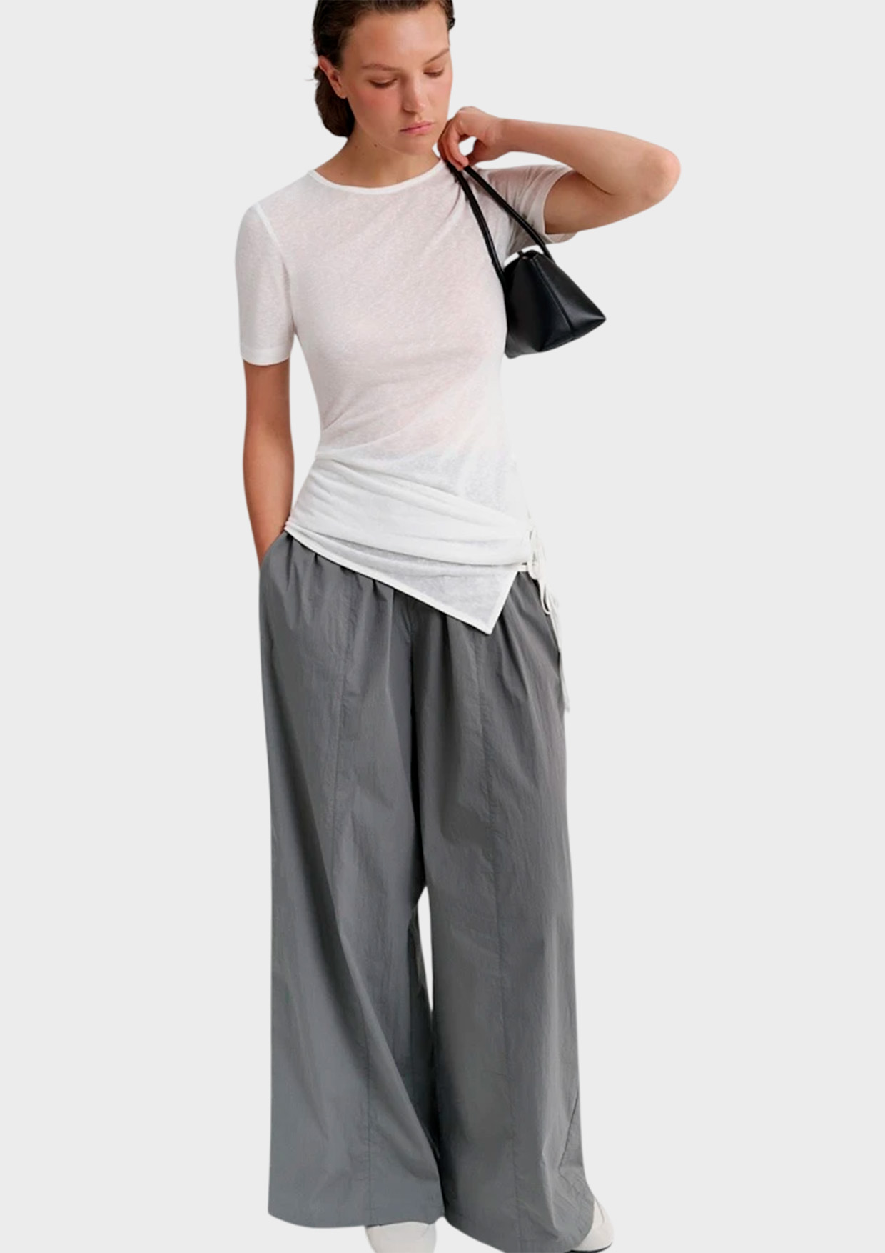 Брюки свободного силуэта из лёгкого, «шелестящего» хлопка с заметной фактурой. Он как будто «помят», но в этом есть его характер и преимущество легкости ухода. Эластичный пояс мягко фиксирует на талии, широкие брючины делают шаг свободнее, а спокойный серый оттенок позволяет им быть чем угодно: основой, акцентом, тихим фоном для рубашки, топа или мягкого трикотажа.