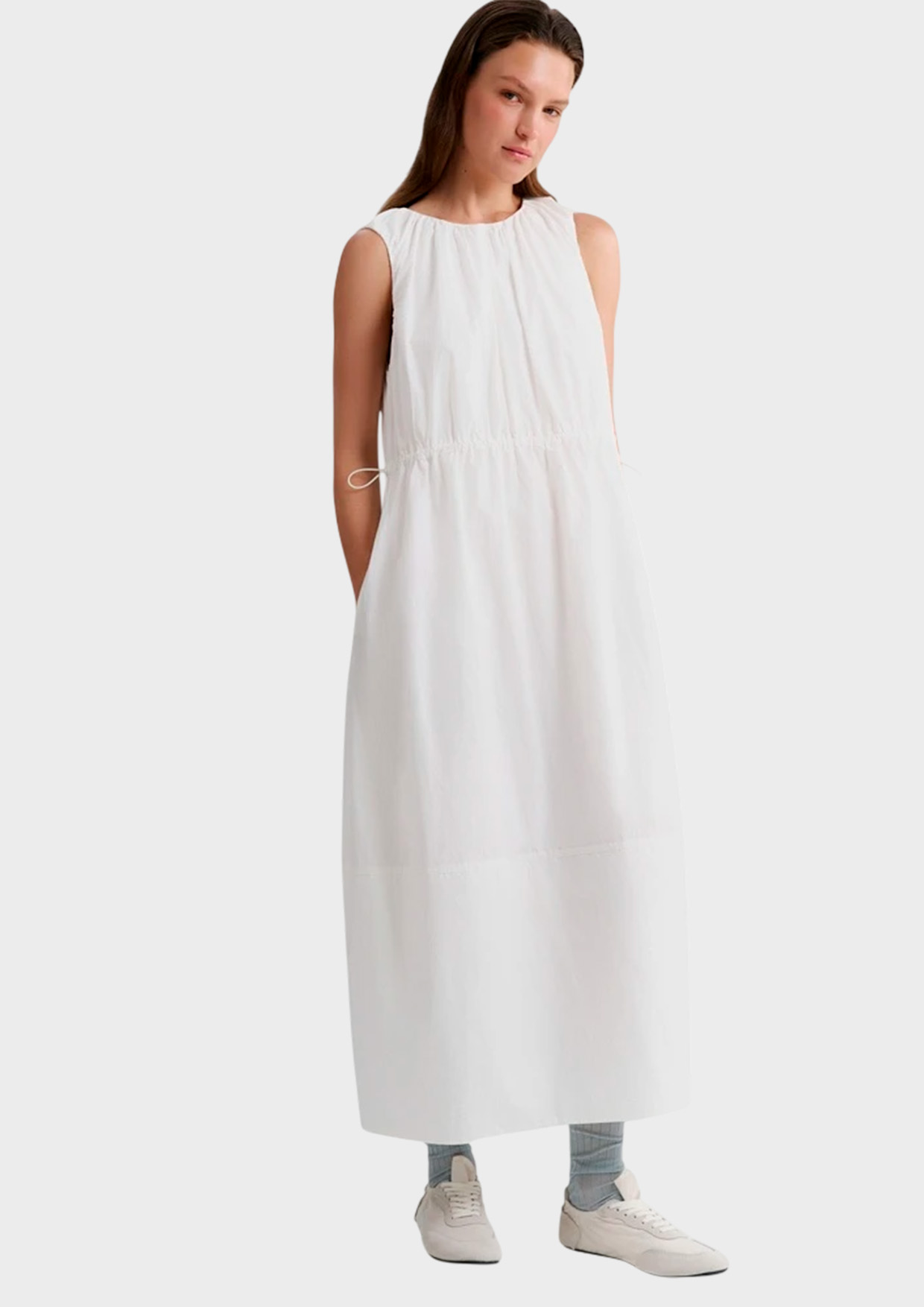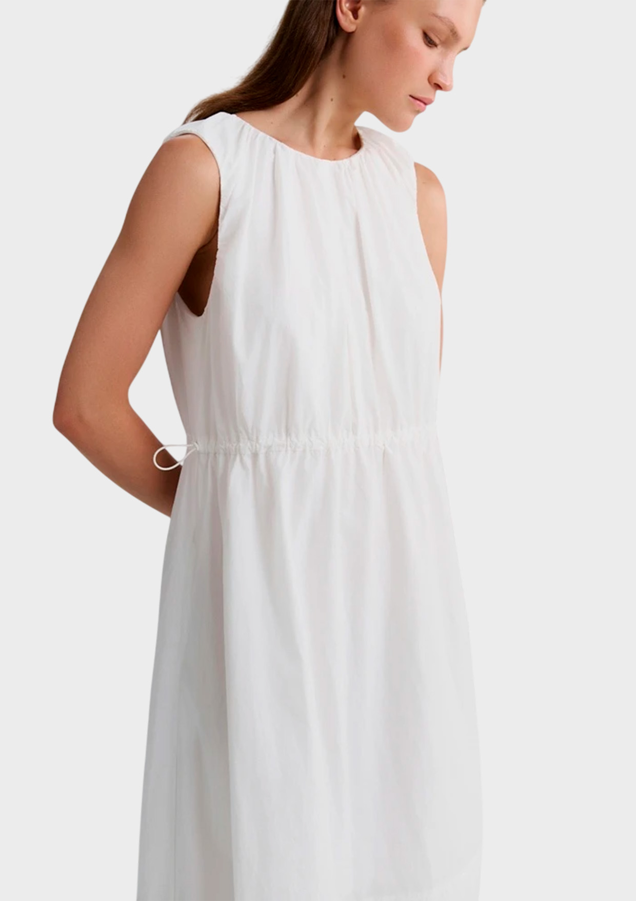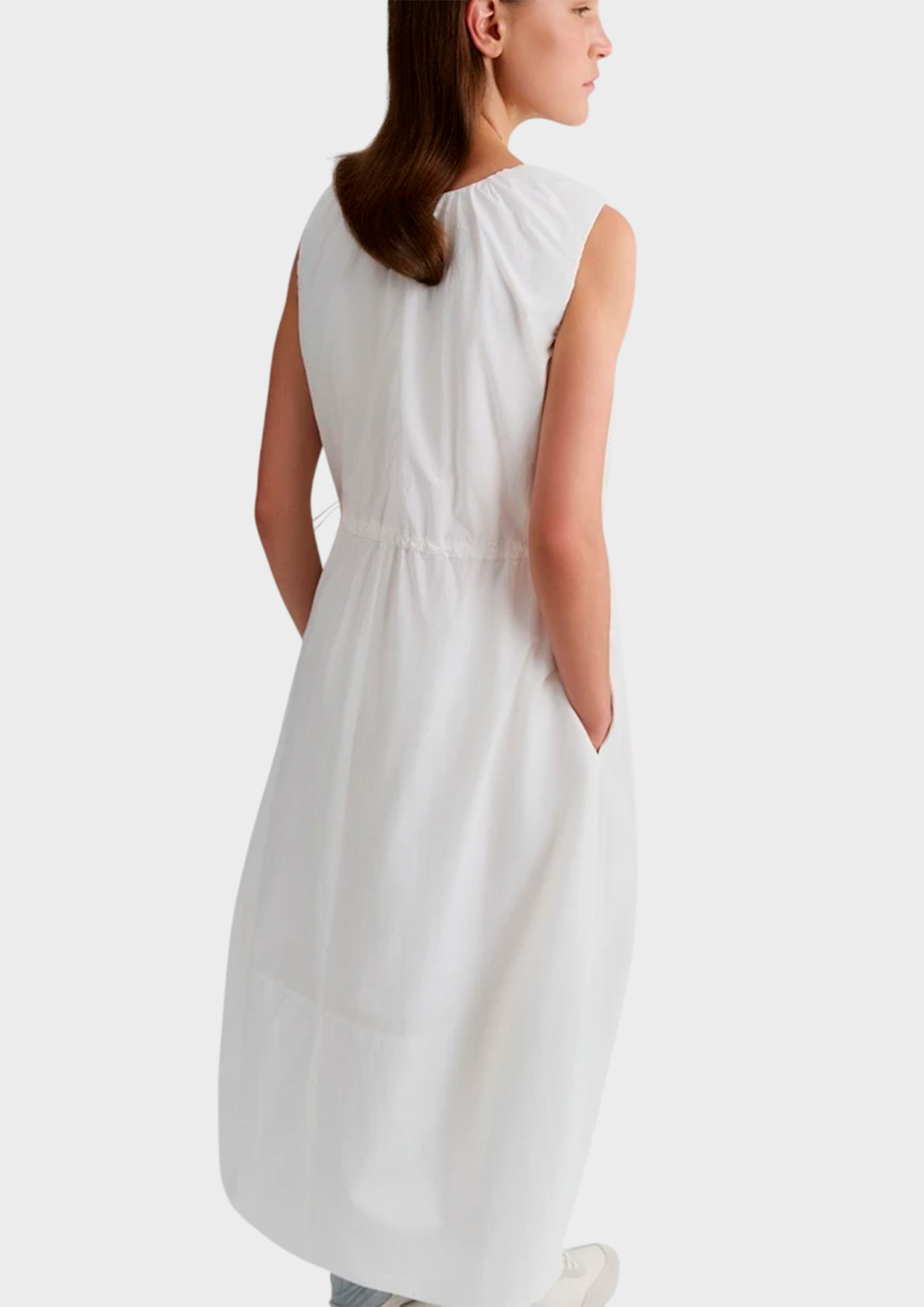 Платье свободного силуэта из хлопка Pima — мягкого и дышащего материала, который приятно ощущается на коже и сохраняет ощущение лёгкости в течение дня. Сборка по линии талии регулируется утяжками, позволяя менять форму силуэта — от более свободной до приталенной.