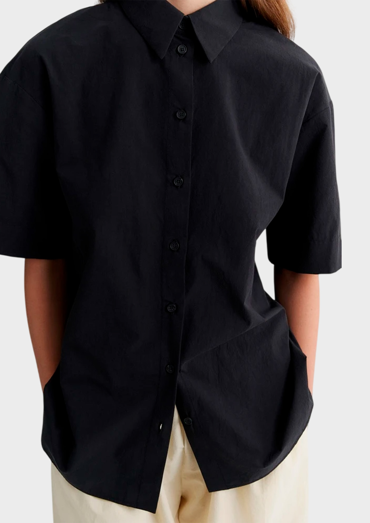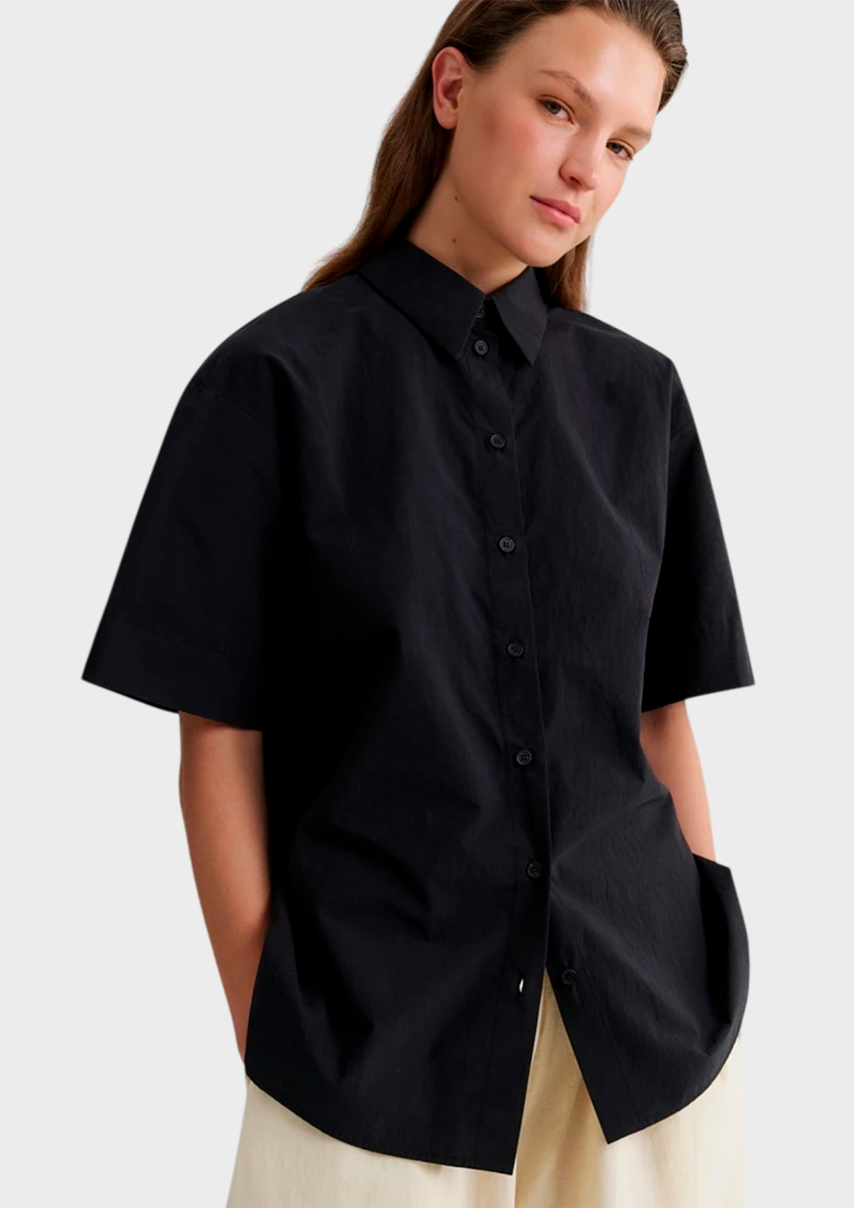 Рубашка свободного силуэта из хлопка Pima — мягкого и дышащего материала, который приятно ощущается на коже. Глубокий тёмный оттенок подчёркивает минималистичность модели и делает её универсальной основой гардероба. Рубашка легко сочетается с брюками, юбками и лёгким трикотажем.