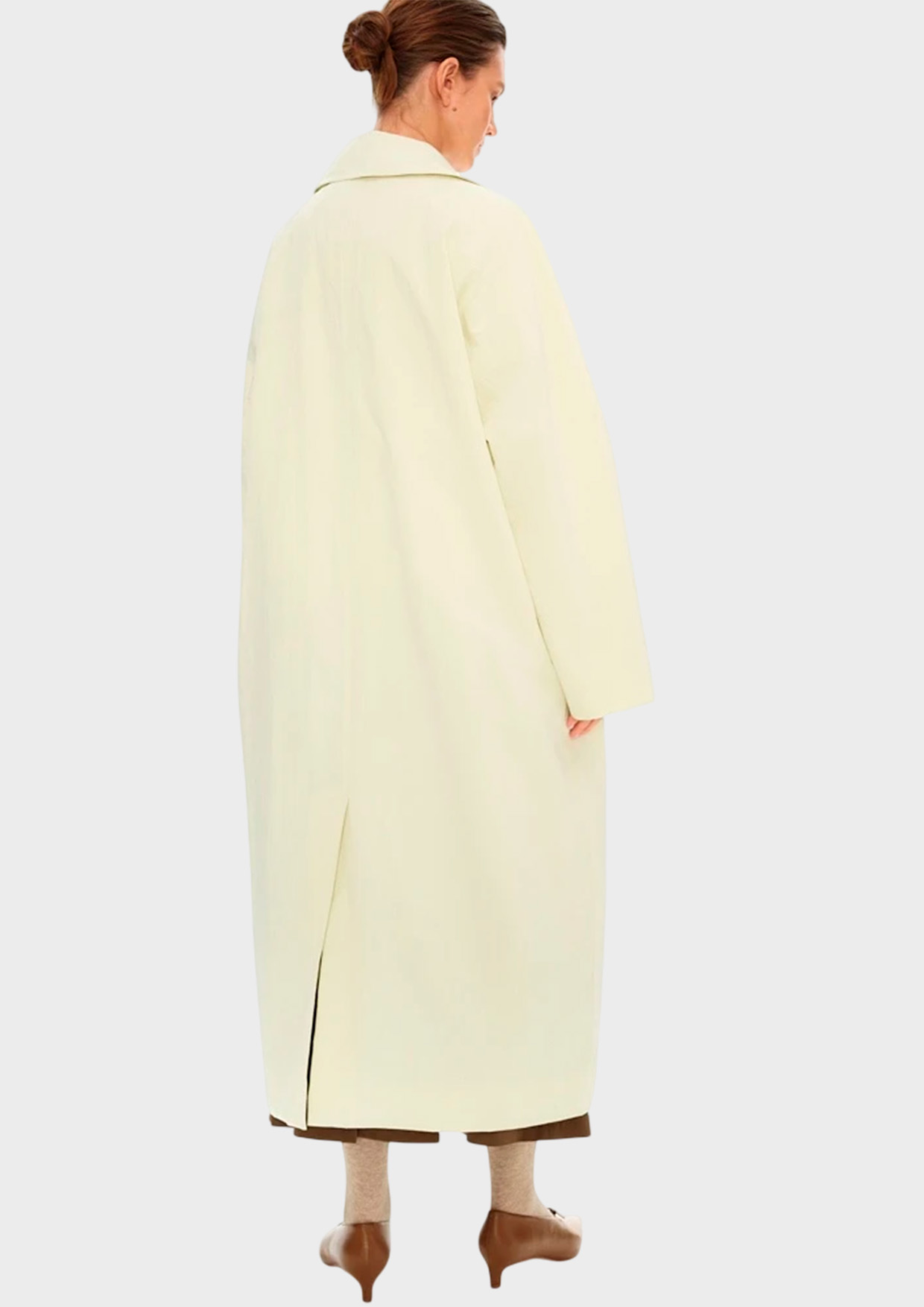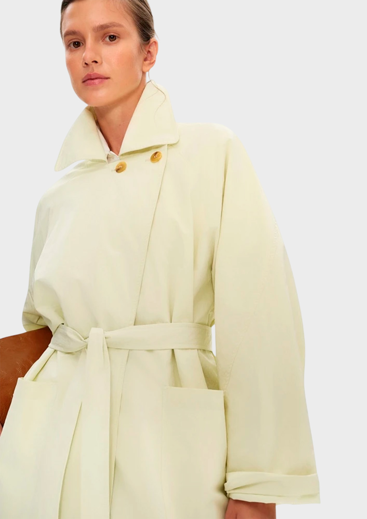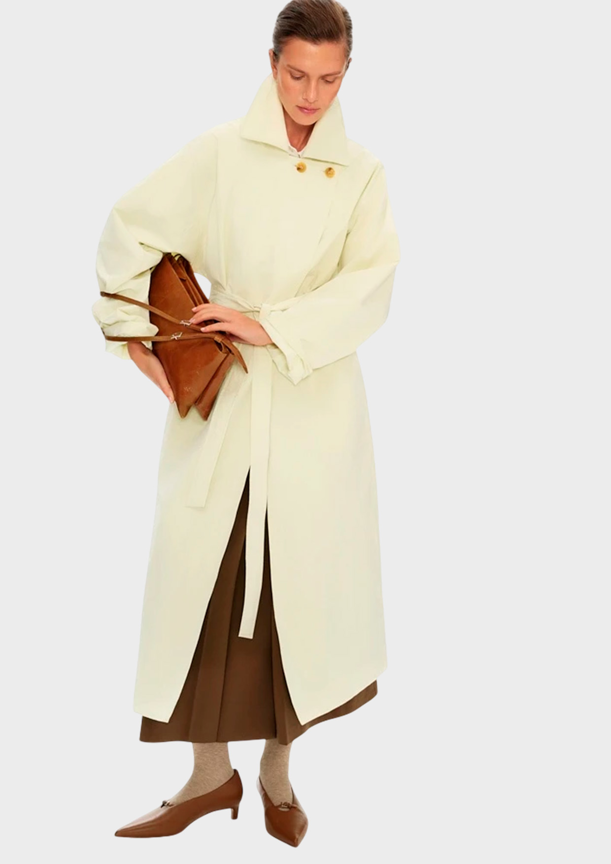 Лёгкий тренч с минималистичным силуэтом — идеальный вариант для тёплого межсезонья. Модель выполнена в светлом оттенке, который освежает образ и легко сочетается с базовым гардеробом. Прямой крой с поясом позволяет носить тренч как свободно, так и подчёркивая талию. Хлопковая подкладка делает изделие особенно комфортным для повседневной носки, обеспечивая мягкость и воздухопроницаемость. Аккуратный воротник, лаконичные линии и продуманная длина создают ощущение лёгкости и непринуждённой элегантности. Этот тренч — про спокойный стиль и ощущение свежего воздуха в образе.
