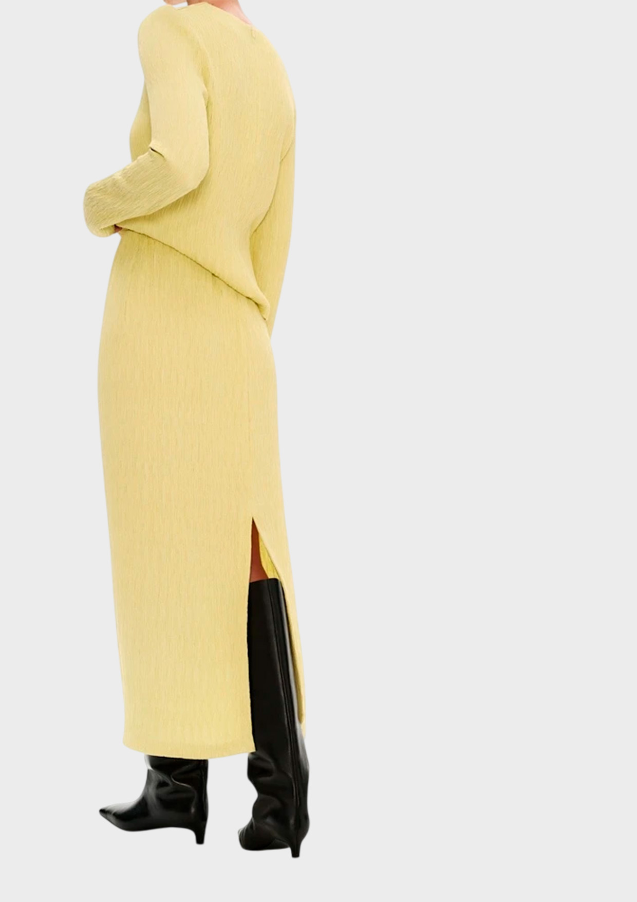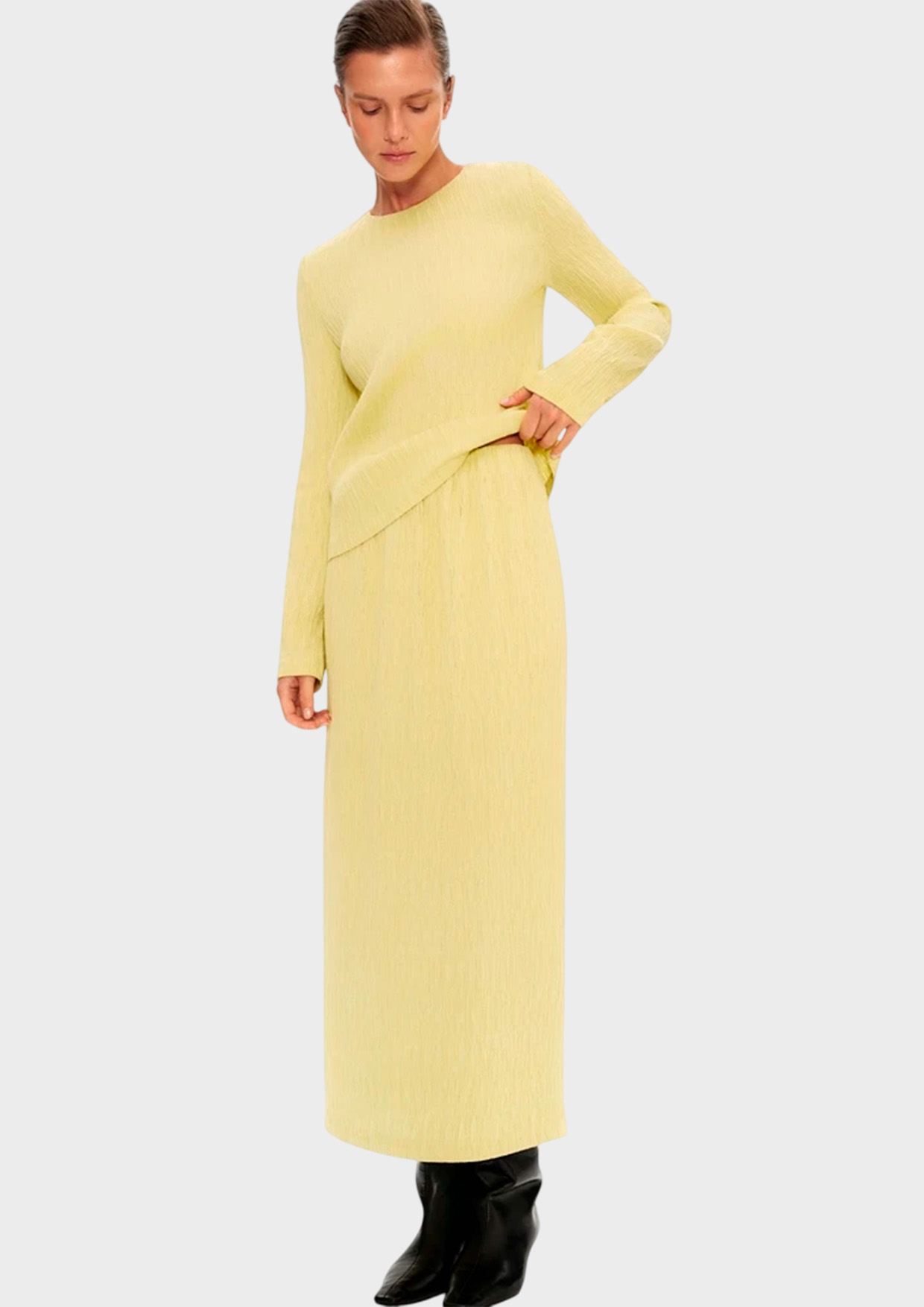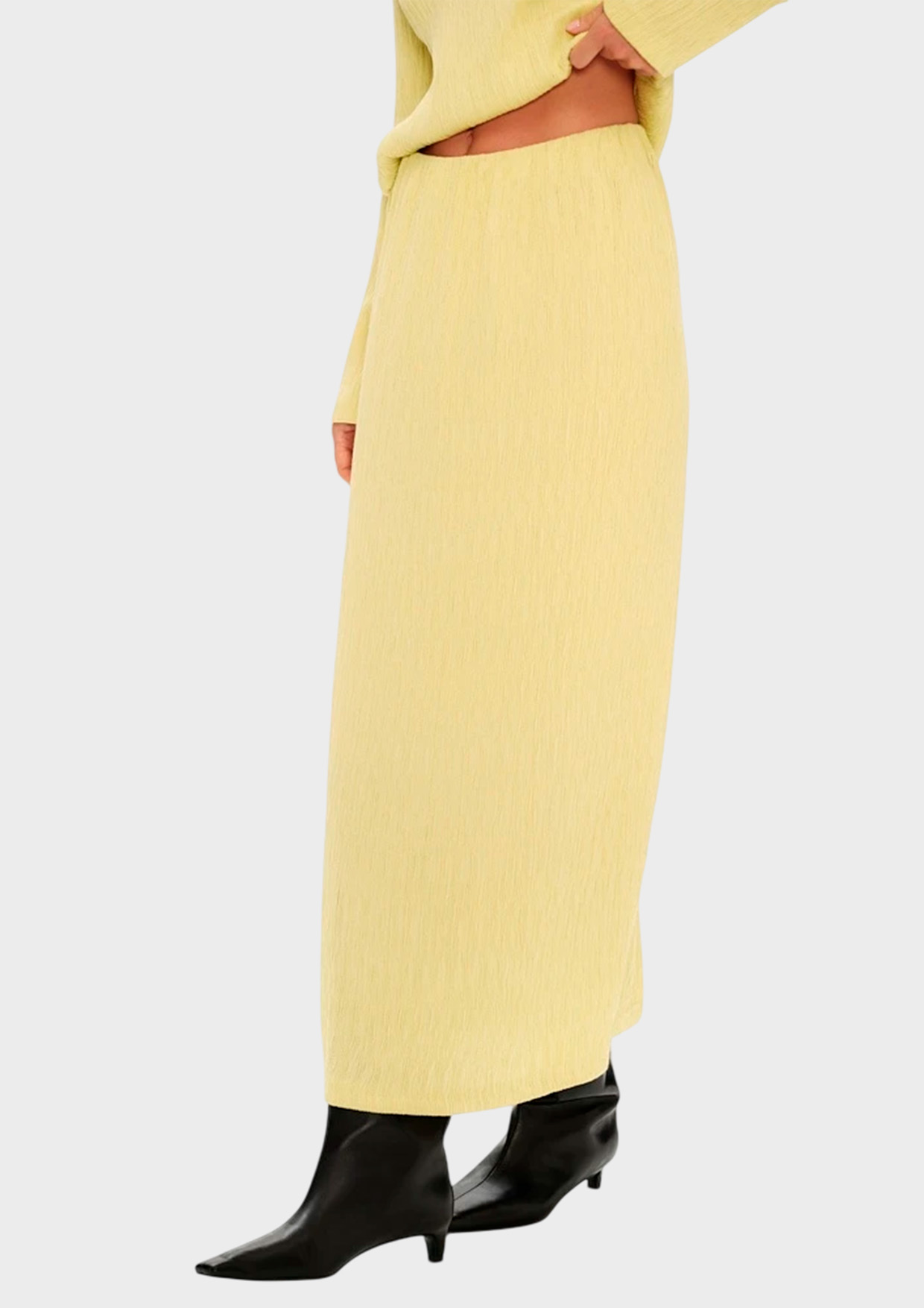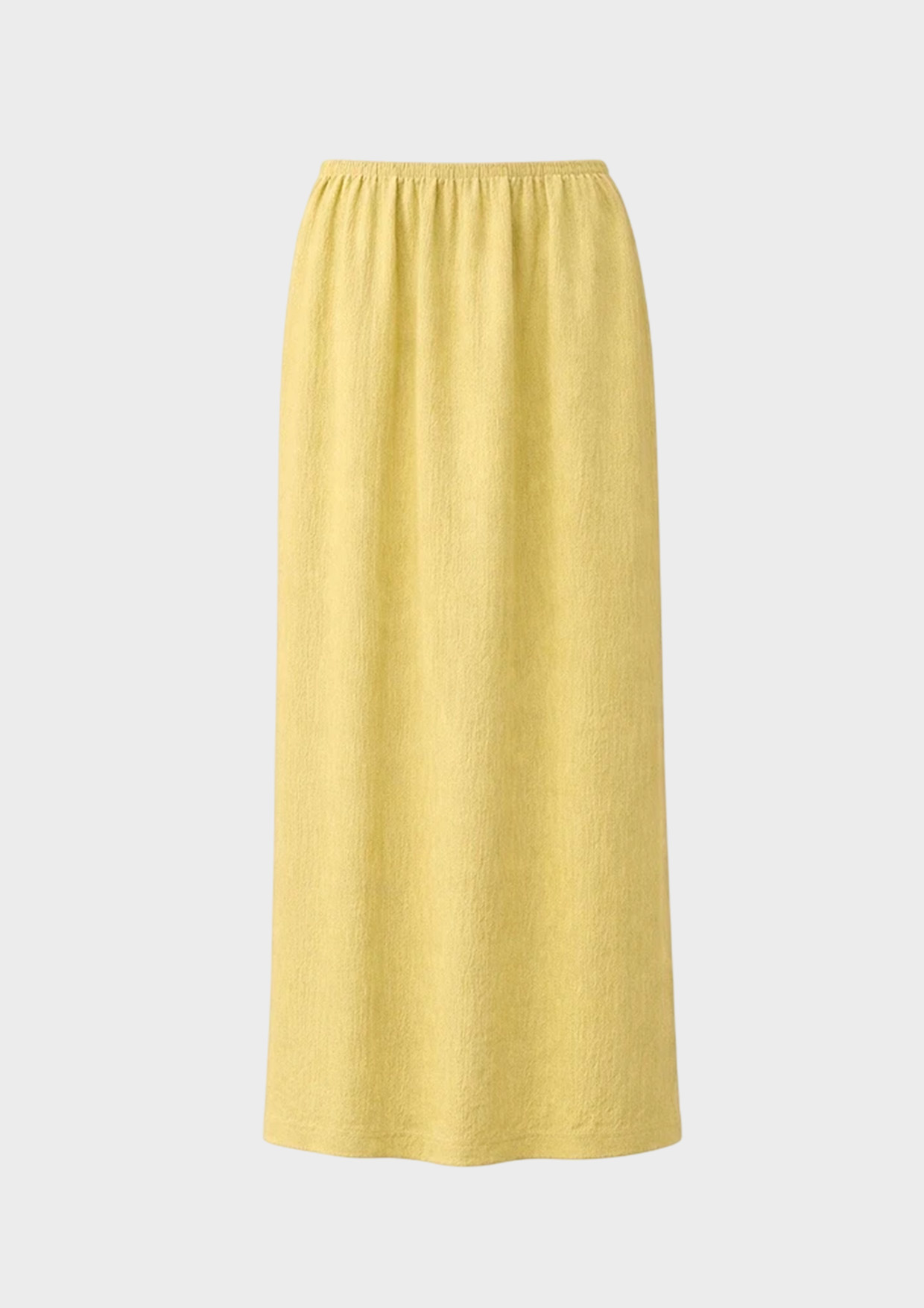 Юбка в длине миди из фактурной ткани с рельефным узором в акцентном желтом оттенке. Эластичный пояс обеспечивает аккуратную посадку по талии, а прямой крой мягко подчёркивает силуэт.