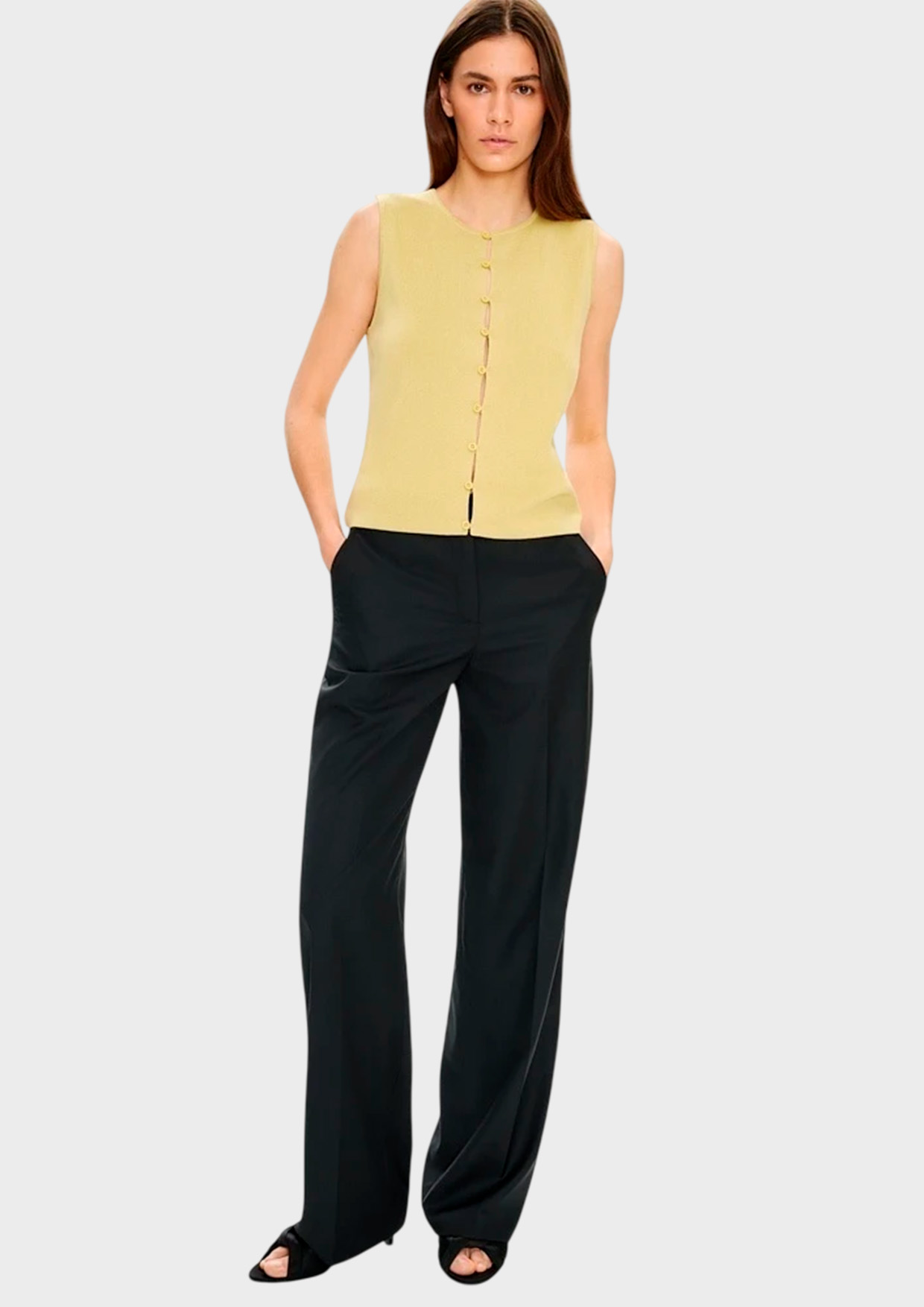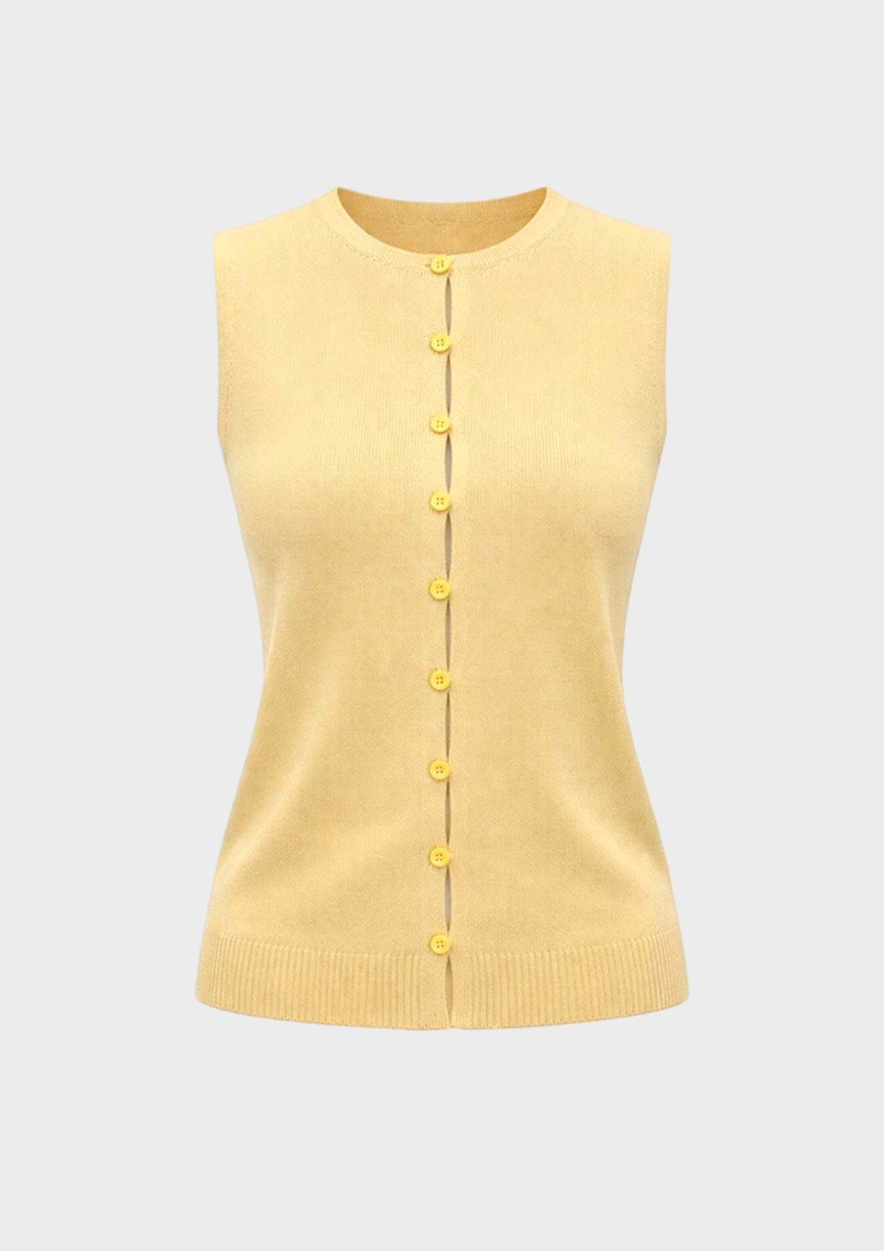 Тонкий вязаный жилет с множеством пуговиц из мягкого вязаного трикотажа. Материал приятен к телу, хорошо тянется и комфортно садится по фигуре, подчёркивая силуэт.