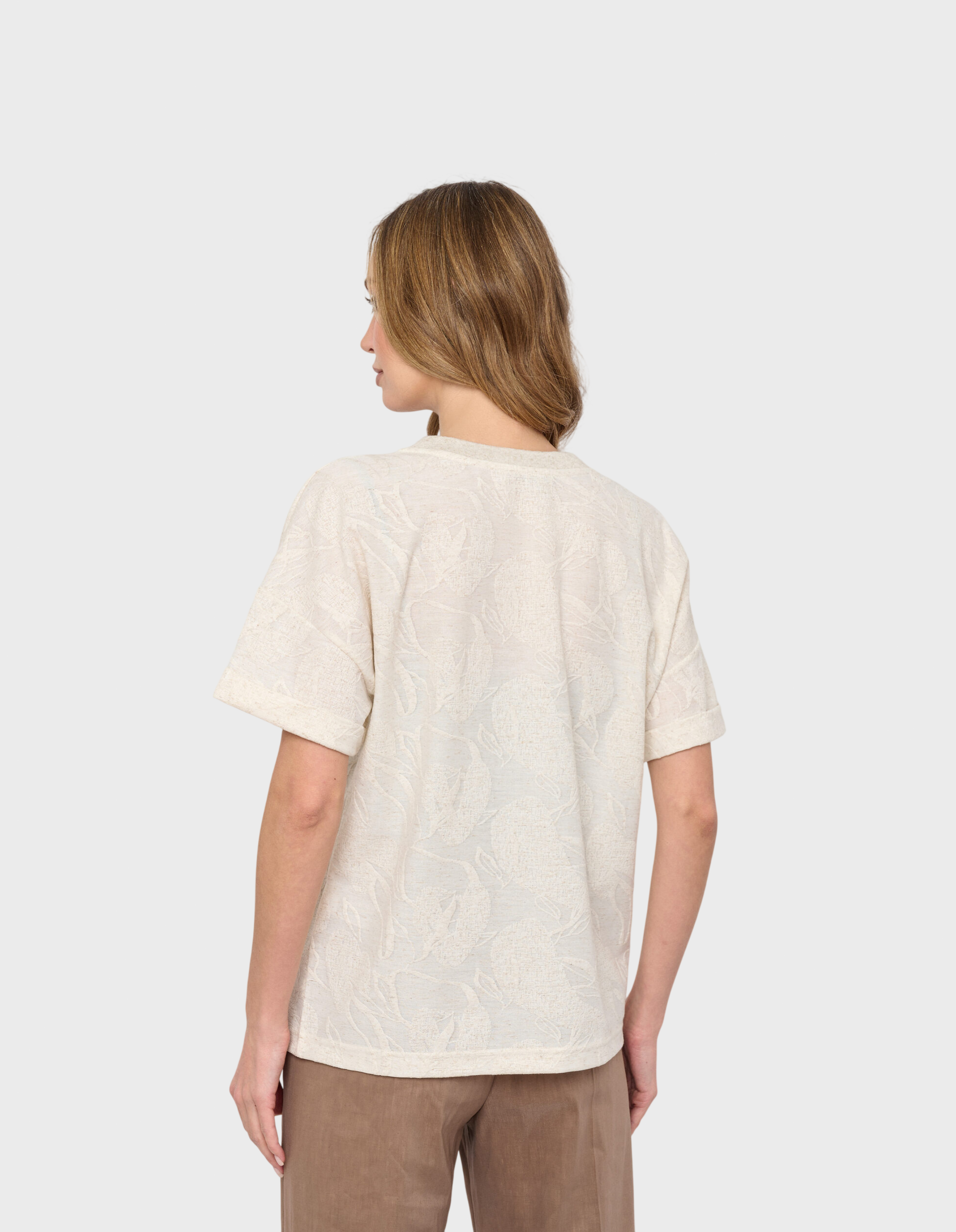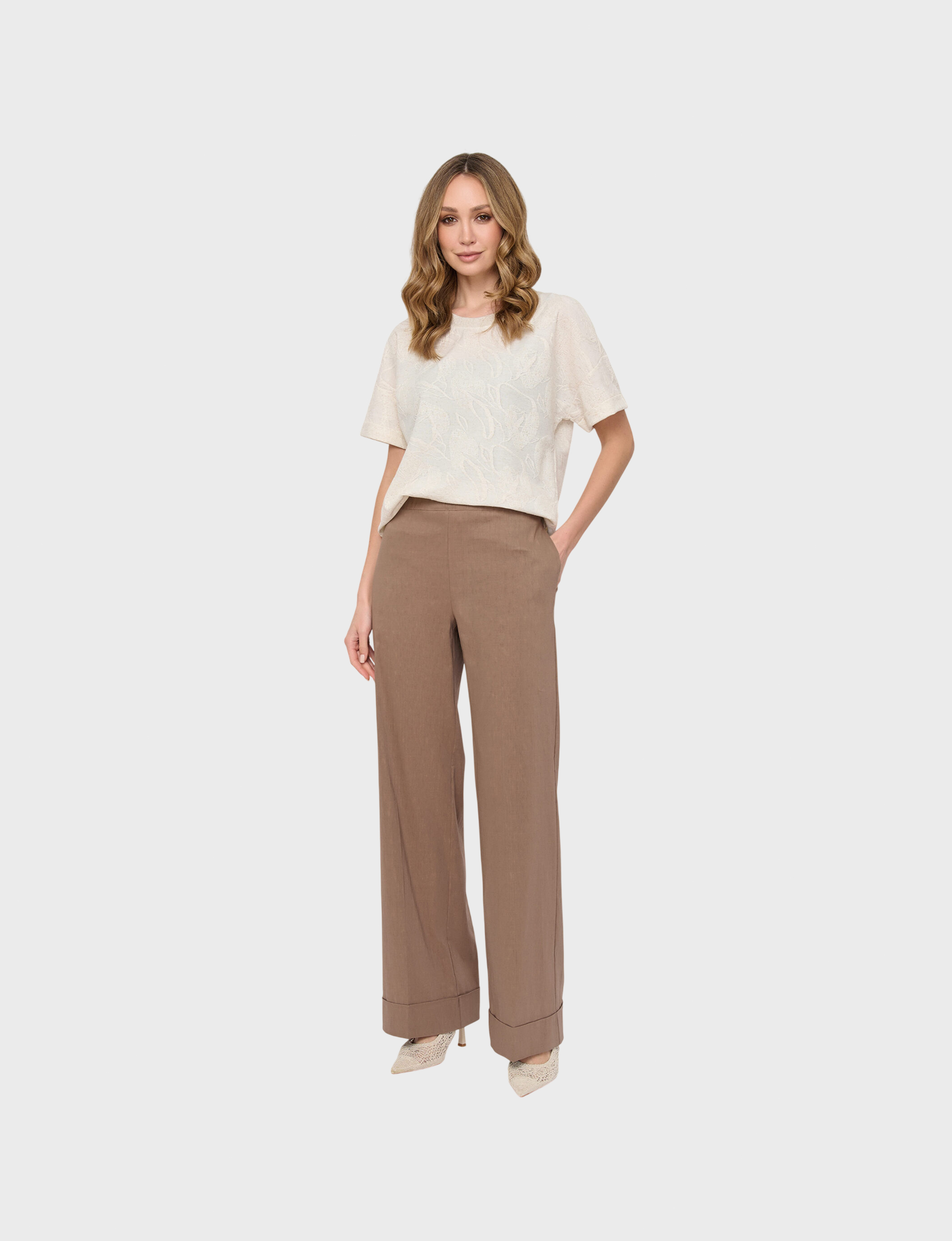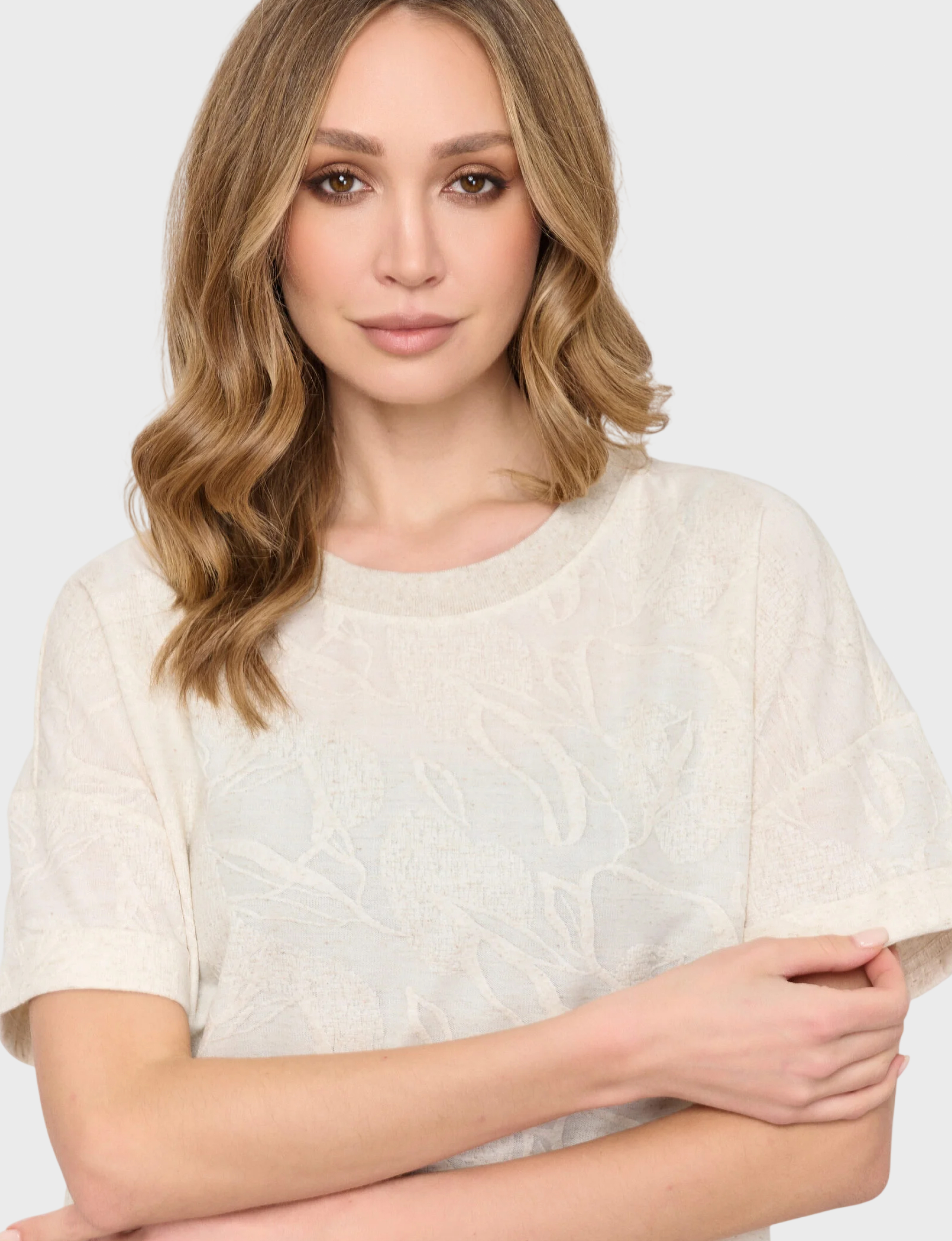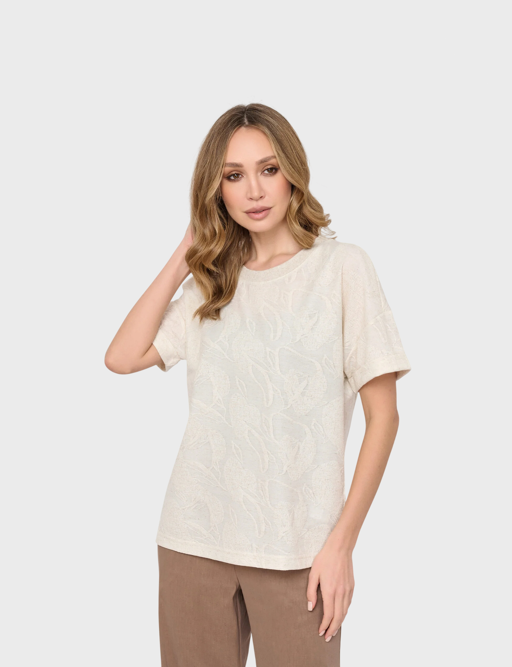 Женская футболка бренда Franco Vello молочного цвета. Изготовлена из комфортного сочетания материалов (35% вискозы, 25% полиэстера, 25% хлопка, 10% льна, 5% эластана), обеспечивающего свободу движений.