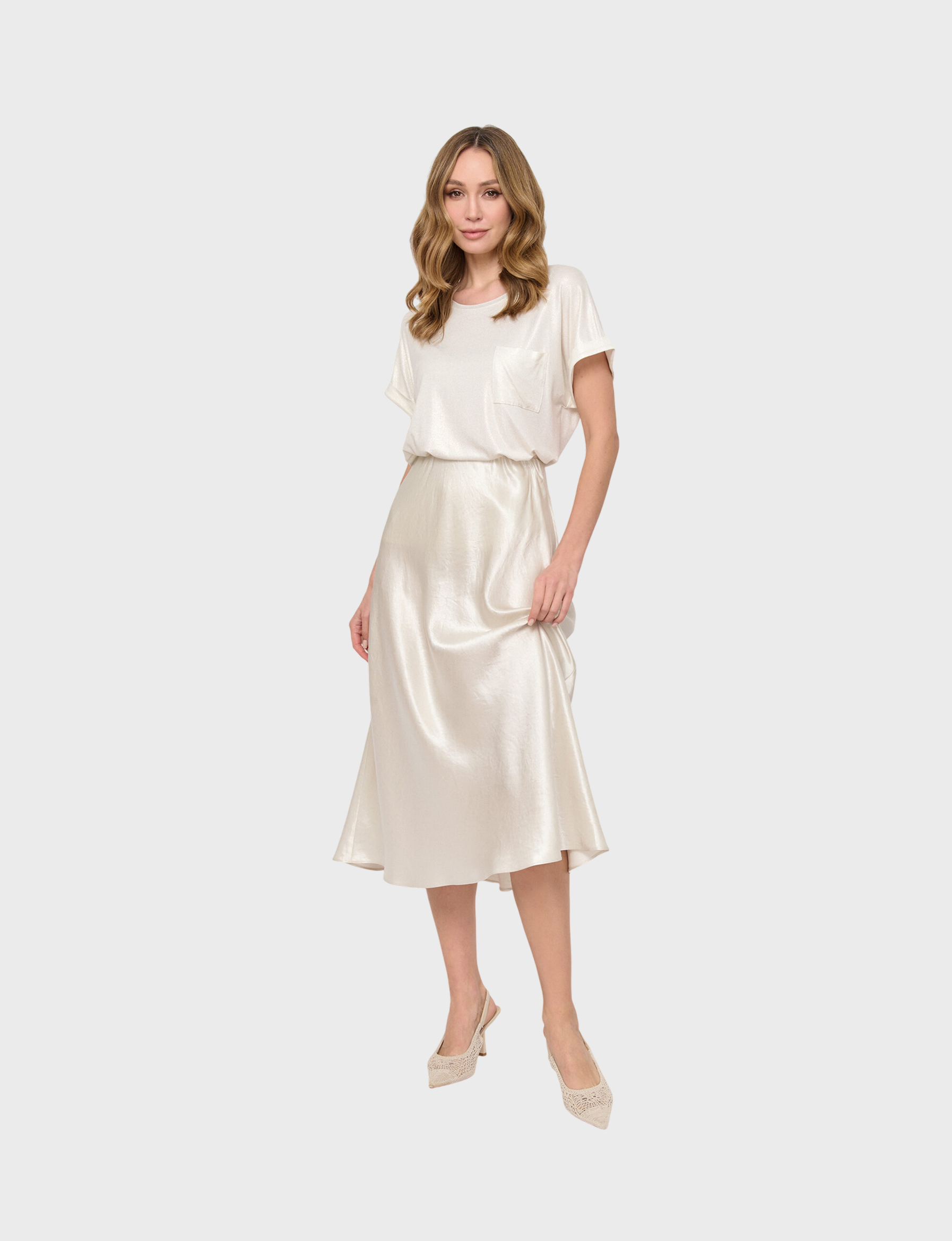 Женская юбка от бренда Franco Vello – Изящная форма, нежный молочный оттенок подчеркнут элегантность образа. Ацетатная ткань приятна к телу, обеспечивает комфорт при носке и легкую драпировку, придавая образу воздушности и утонченности.