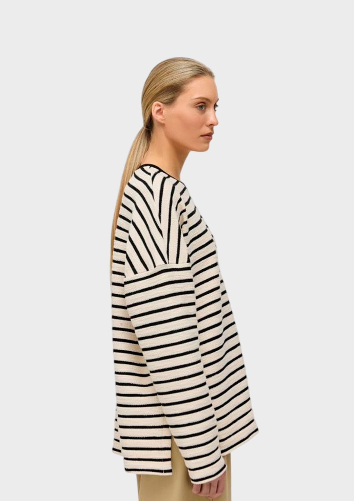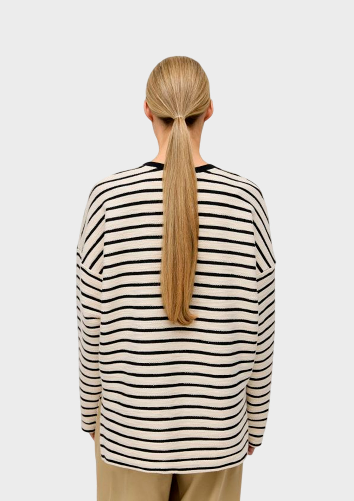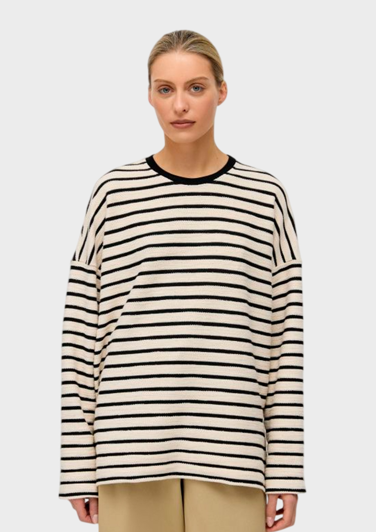 Лонгслив свободного прямого кроя сшит из фактурного натурального хлопка с эффектом махры — нежной и приятной к телу ткани.