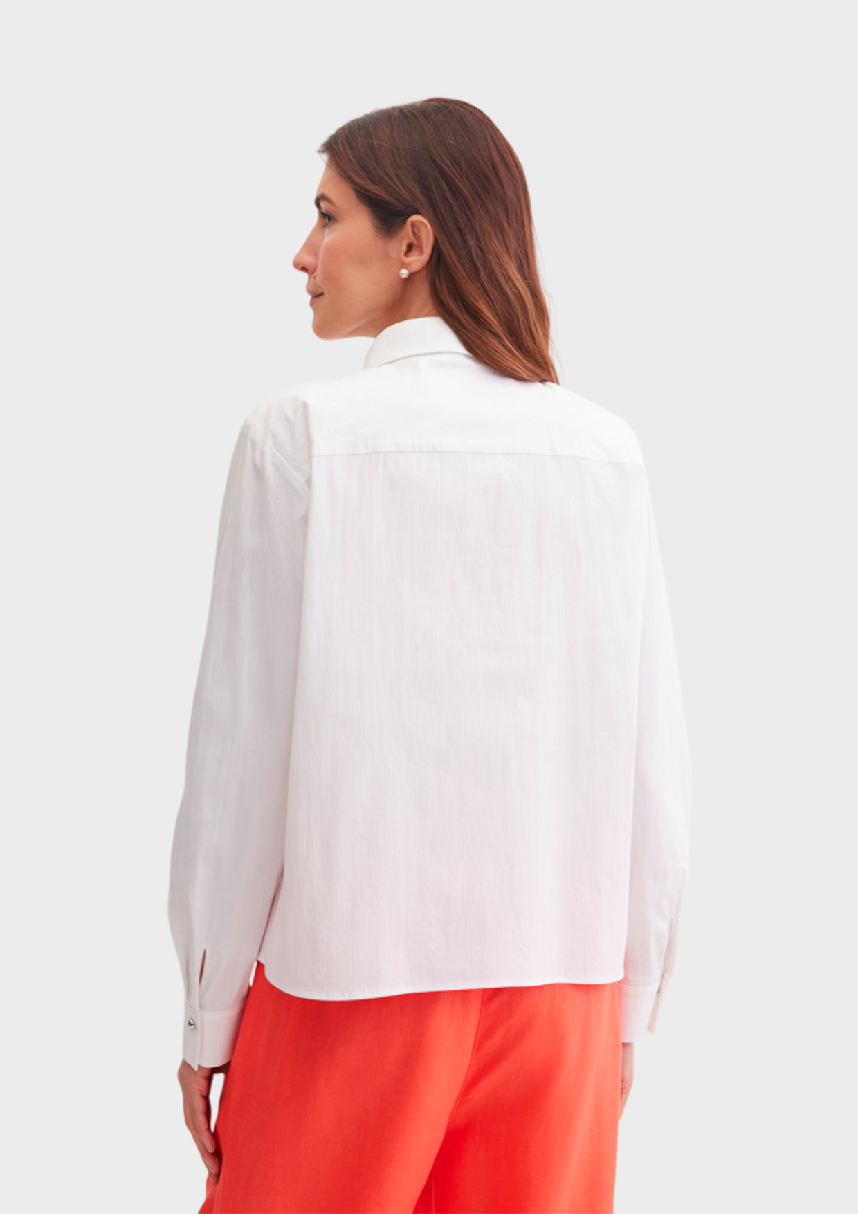 Свободная рубашка прямого кроя выполнена из эластичного смесового хлопка, который обеспечивает комфорт и аккуратную посадку. Скрытая застёжка на пуговицы подчёркивает чистый лаконичный силуэт, а верхняя декоративная блестящая фактурная пуговица на воротнике становится ярким акцентом.