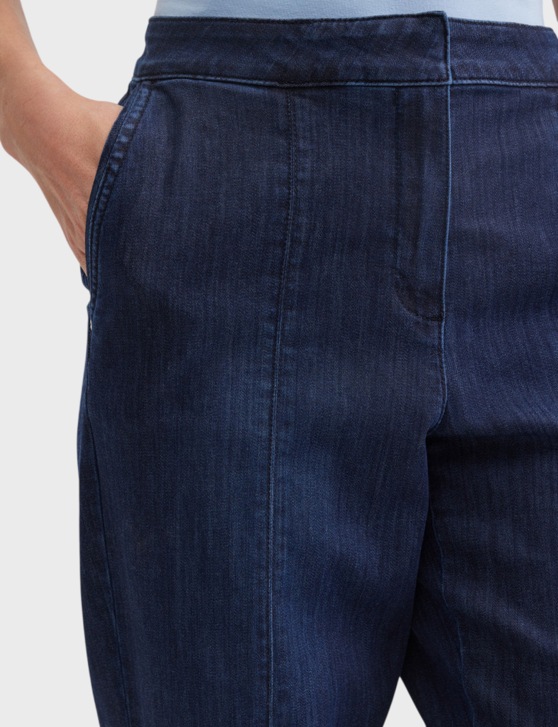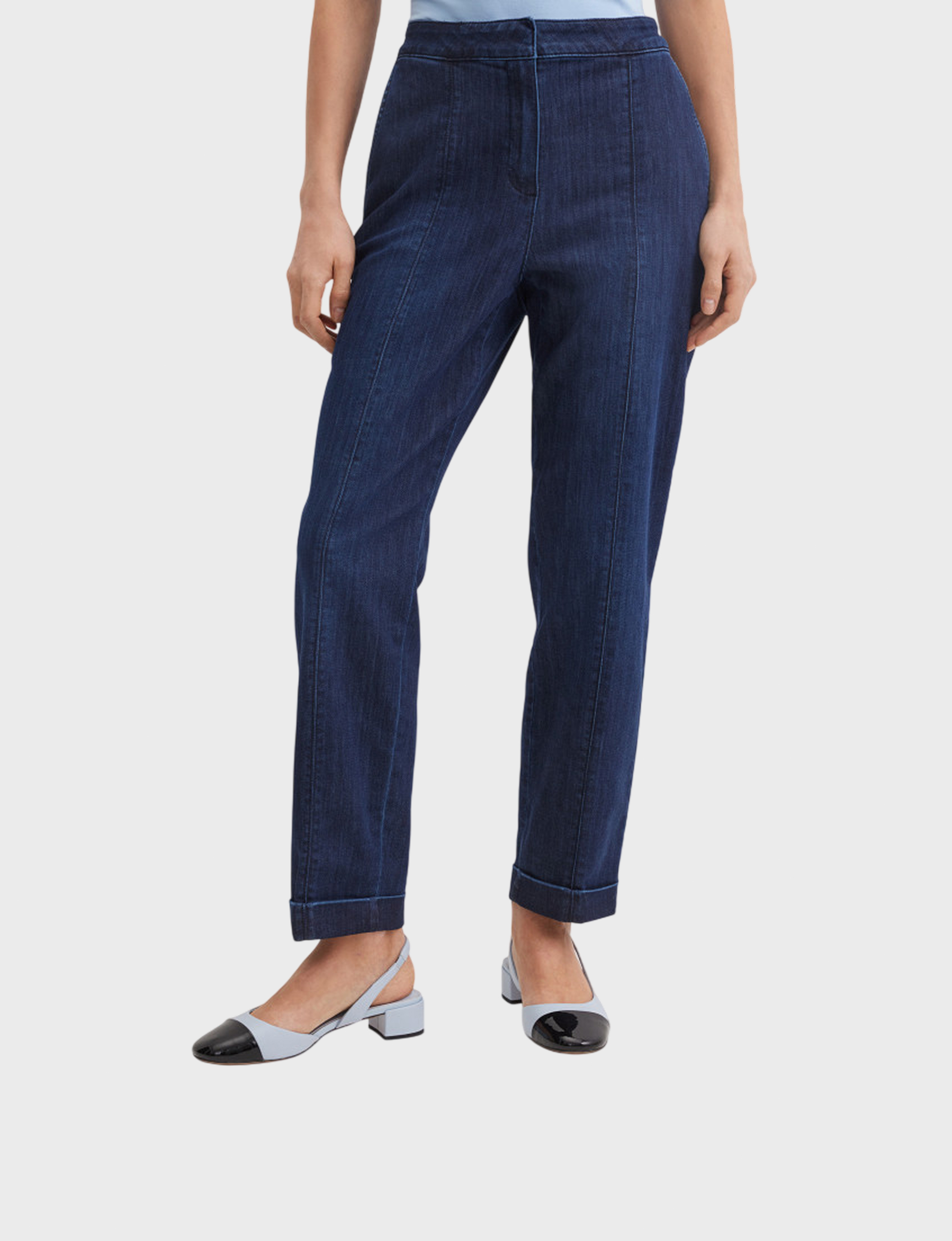 Укороченные джинсы зауженного кроя выполнены из 72% хлопка, 17% пэ, 9% лиоцелла, 2% эластана, что делает материал комфортным, гладким и пластичным. Вертикальные швы по всей длине брючин визуально вытягивают силуэт, подчёркивая аккуратную посадку. Подвороты по низу добавляют современный акцент и позволяют варьировать длину в зависимости от образа.