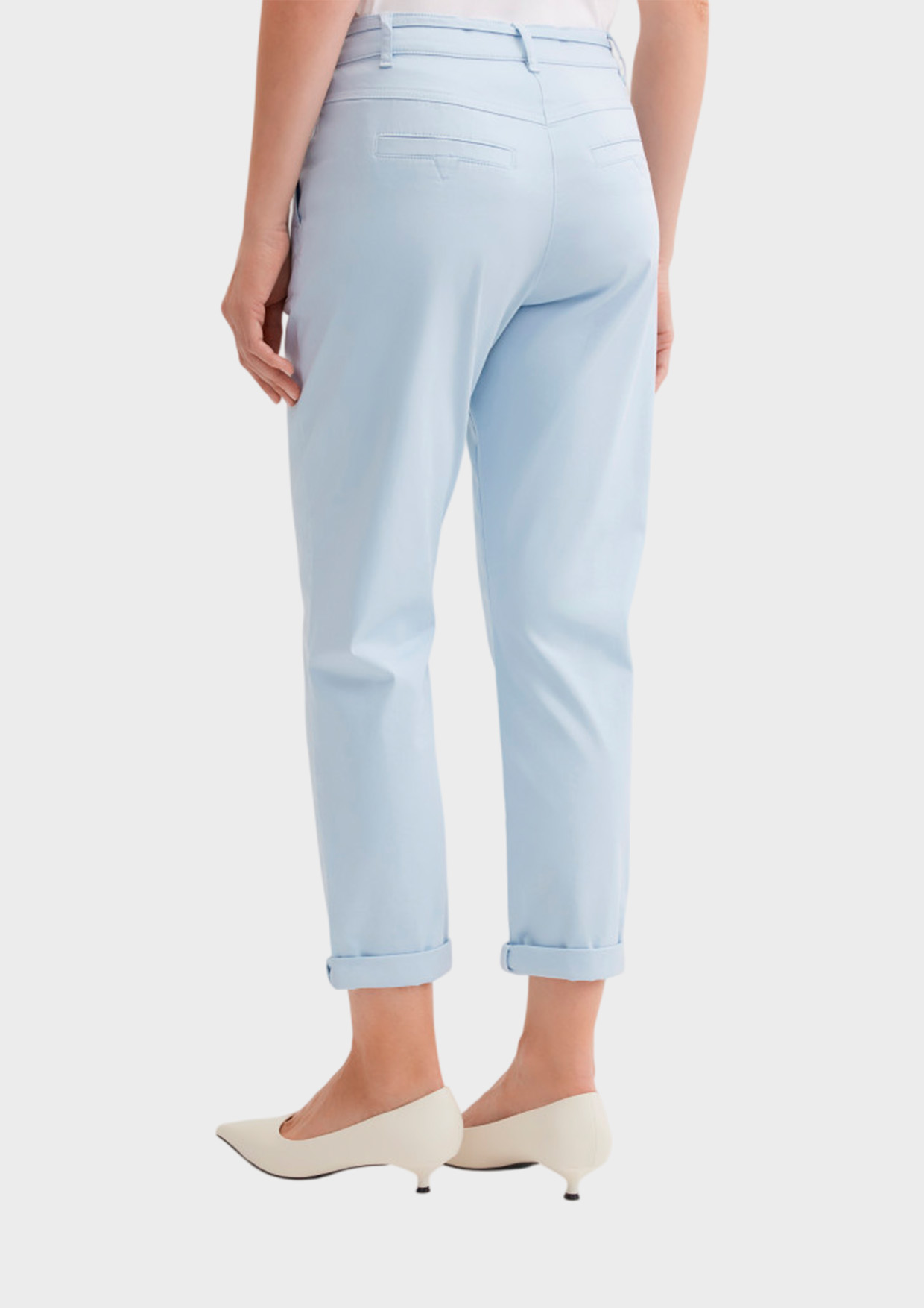 Брюки чинос зауженного укороченного кроя выполнены из мягкого эластичного смесового хлопка, который приятно ощущается на коже и обеспечивает комфорт в течение дня. Эластичный пояс со шлёвками сочетает свободу посадки и классический внешний вид, а тонкий поясок-завязка добавляет стильный акцент и позволяет индивидуально регулировать объём.