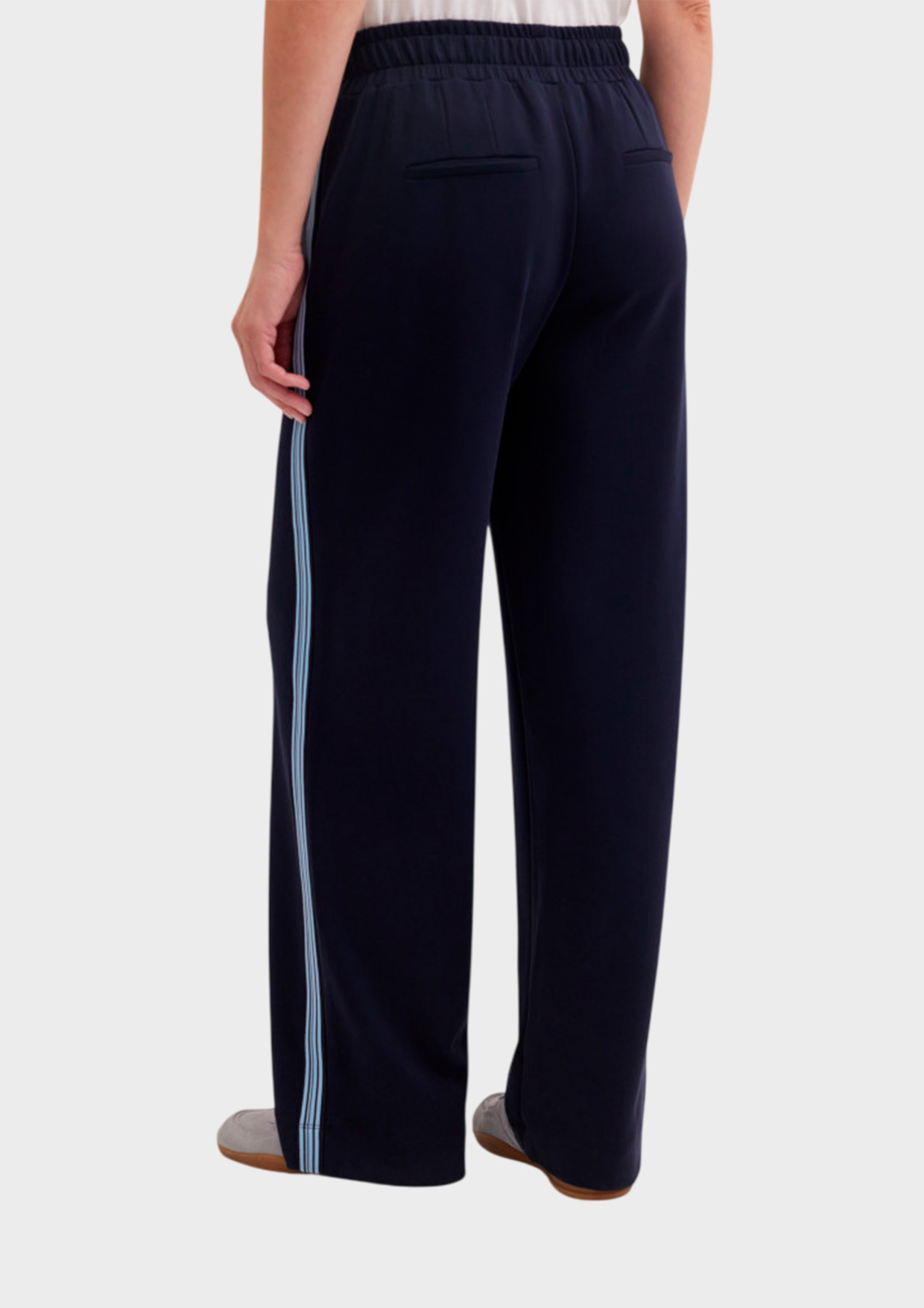 Брюки широкие прямые свободного кроя выполнены из мягкого, тактильно приятного смесового трикотажа с модалом, обеспечивающего комфорт, эластичность и гладкое прилегание без стеснения движений. Эластичный пояс на резинке дополнен декоративной трикотажной лентой-завязкой в полоску с блестящей фурнитурой, что придаёт модели спортивно-актуальный акцент. Полосатые лампасы визуально вытягивают силуэт и добавляют динамику дизайну.