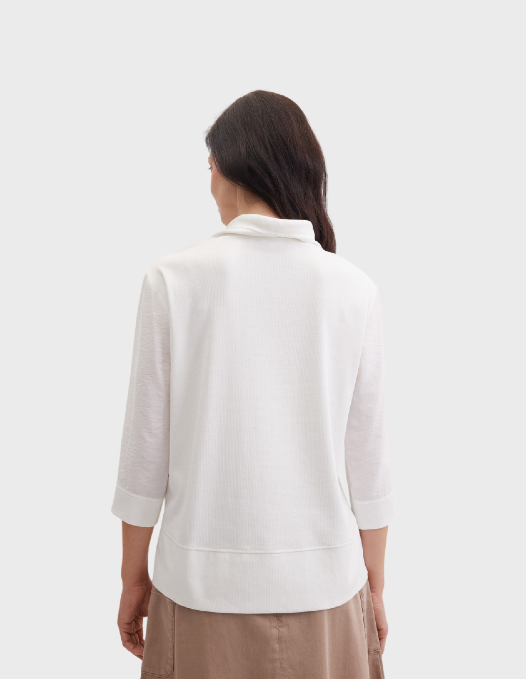 Джемпер свободного прямого кроя выполнен из эластичного смесового хлопка, который комфортно ощущается на теле и хорошо держит форму. Передняя часть изготовлена из текстильной ткани с выразительным жатым эффектом, создающим визуальную глубину и лёгкую архитектурность образа. Трикотажная спинка обеспечивает мягкость и свободу движений, а широкая отделка рибаной по низу добавляет аккуратную завершенность.