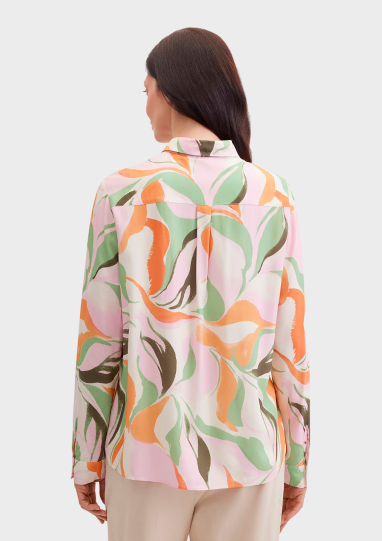 Блузка свободного прямого кроя выполнена из лёгкой струящейся вискозы, которая обеспечивает мягкую драпировку и комфорт при носке. Абстрактно-растительный принт делает изделие выразительным и универсальным для повседневных и офисных образов. Застёжка на пуговицы и отложной воротник придают модели классическую структуру.