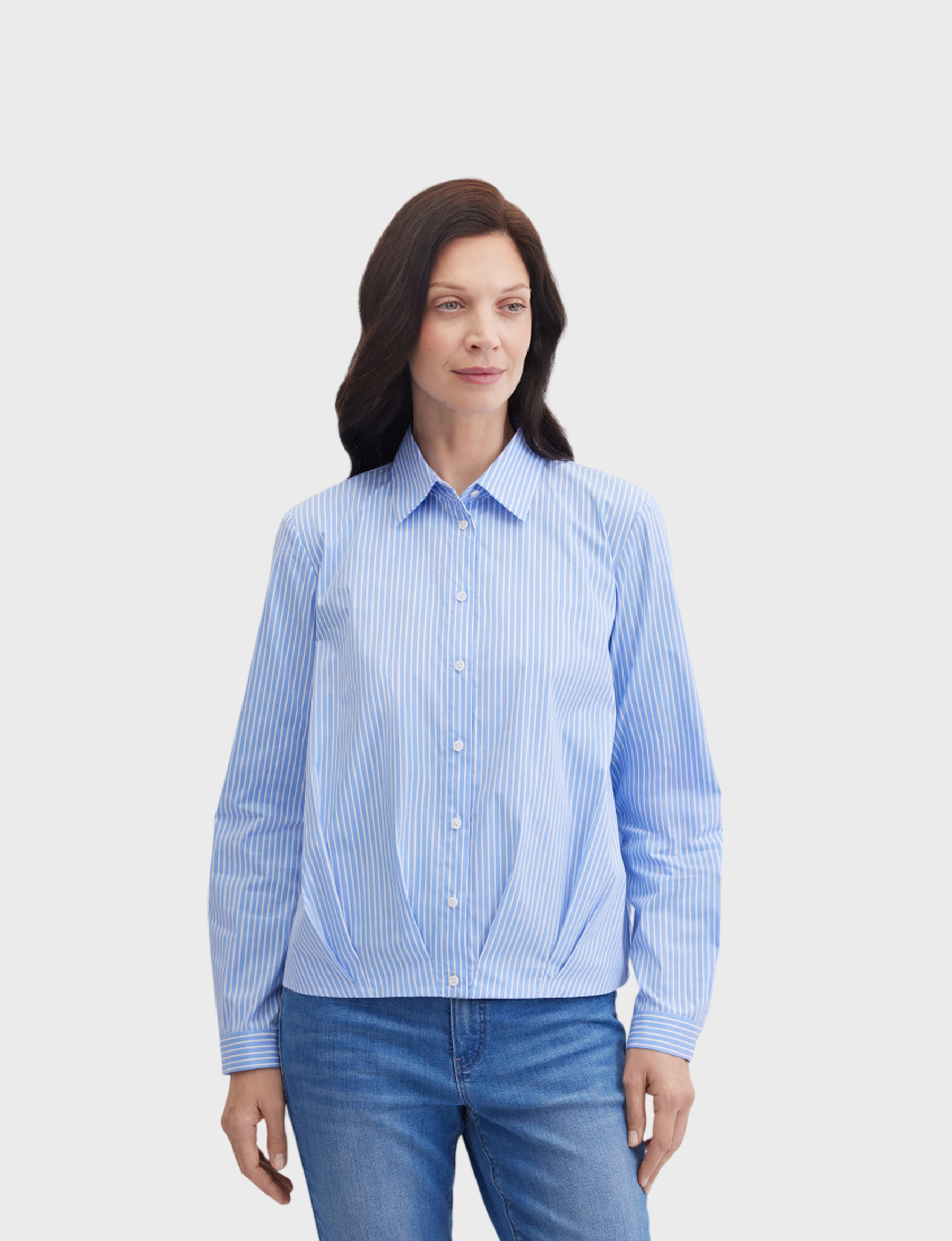 Рубашка укороченная свободного кроя изготовлена из 76% хлопка, 21% па, 3% эластана, который сочетает натуральную воздухопроницаемость с эластичностью. Материал приятен к телу и хорошо держит форму. Отложной воротник и застёжка на пуговицах формируют чистую классическую линию верха, длинные рукава с манжетами позволяют носить модель в разных вариантах, варьируя длину.
