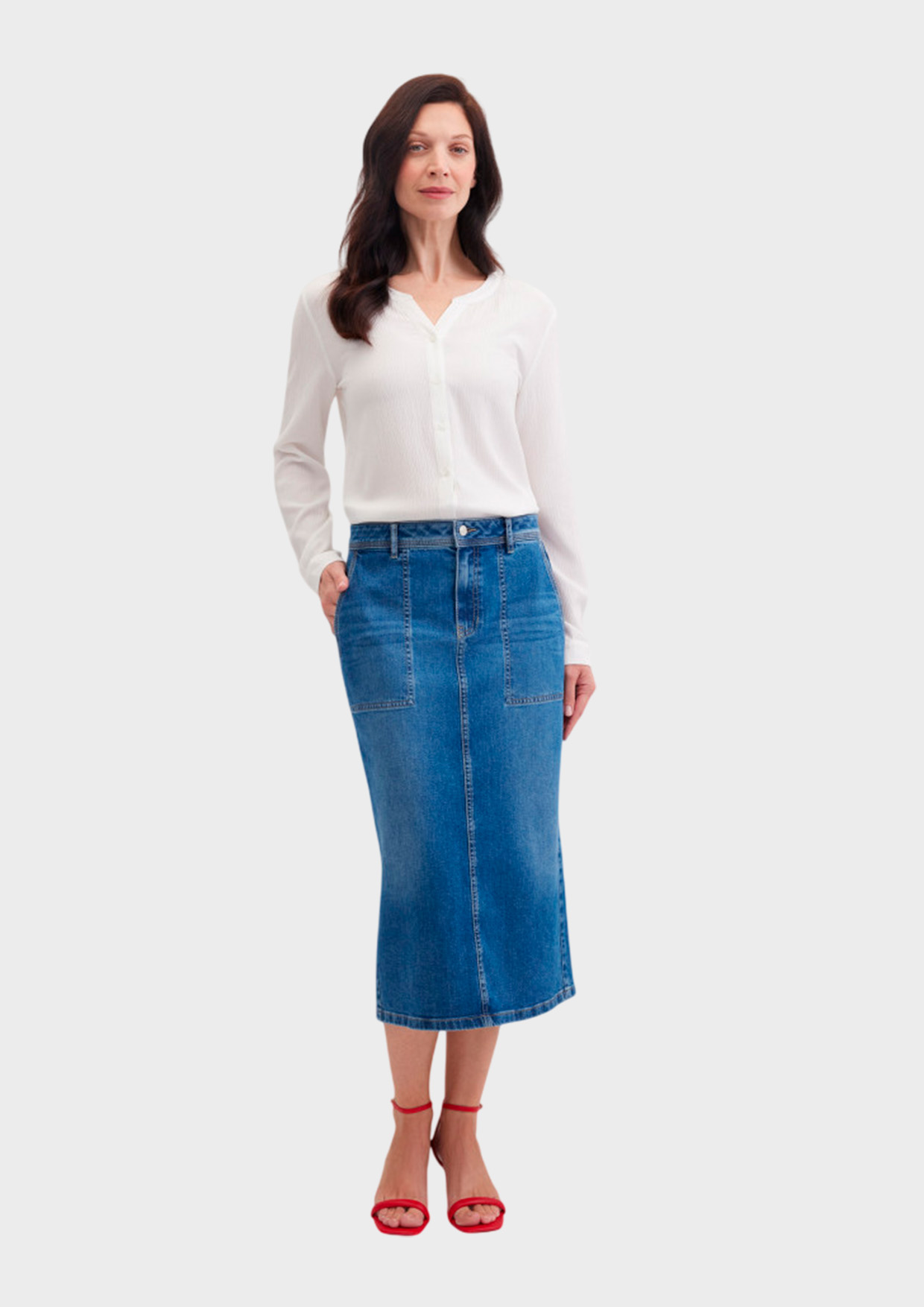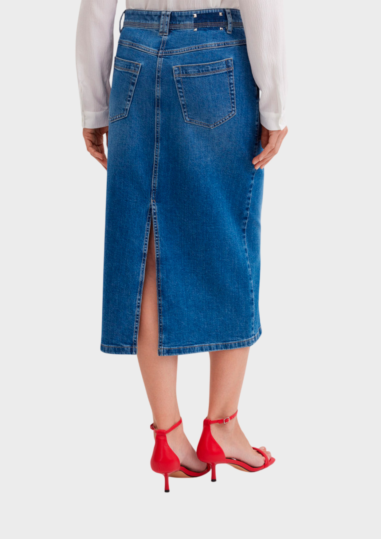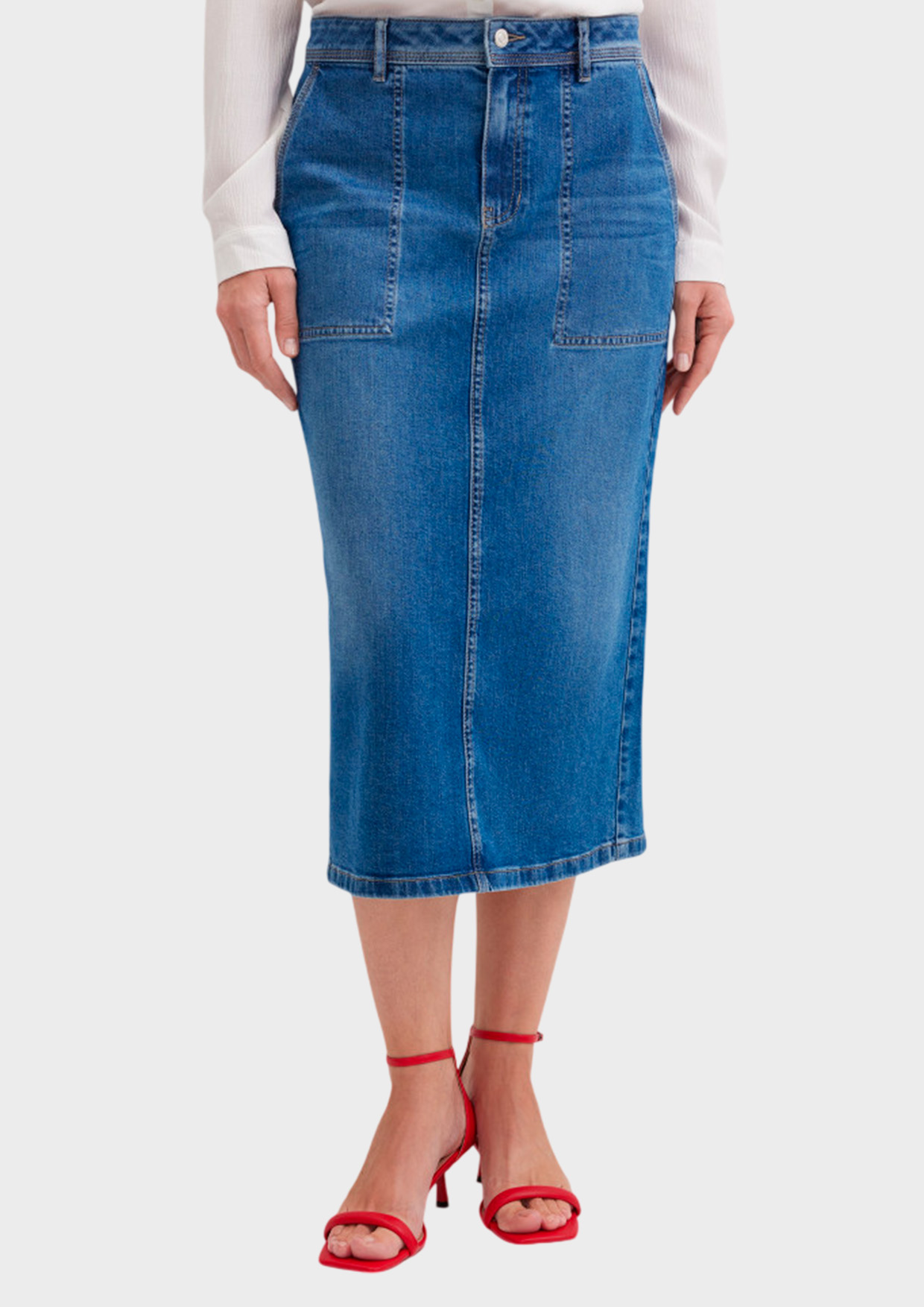 Джинсовая юбка миди прямого кроя выполнена из эластичного денима, который хорошо адаптируется по фигуре и сохраняет форму в течение дня. Эффект потертости придаёт изделию актуальный, живой характер. Эластичный пояс с тройной отстрочкой и шлёвками обеспечивает комфортную посадку и подчёркивает линию талии. Косые карманы спереди и накладные сзади добавляют практичности.