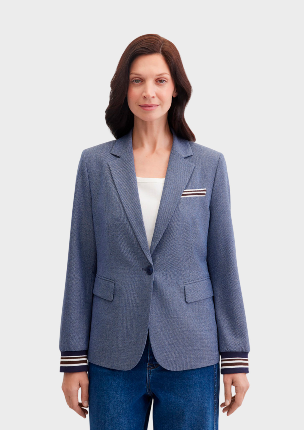 Жакет слегка приталенного кроя из мягкой смесовой вискозы создаёт аккуратный силуэт и обеспечивает комфорт в течение дня. Английский воротник придаёт образу сдержанную элегантность, а контрастные трикотажные манжеты и отделка ложного кармана в полоску добавляют современный спортивный акцент.