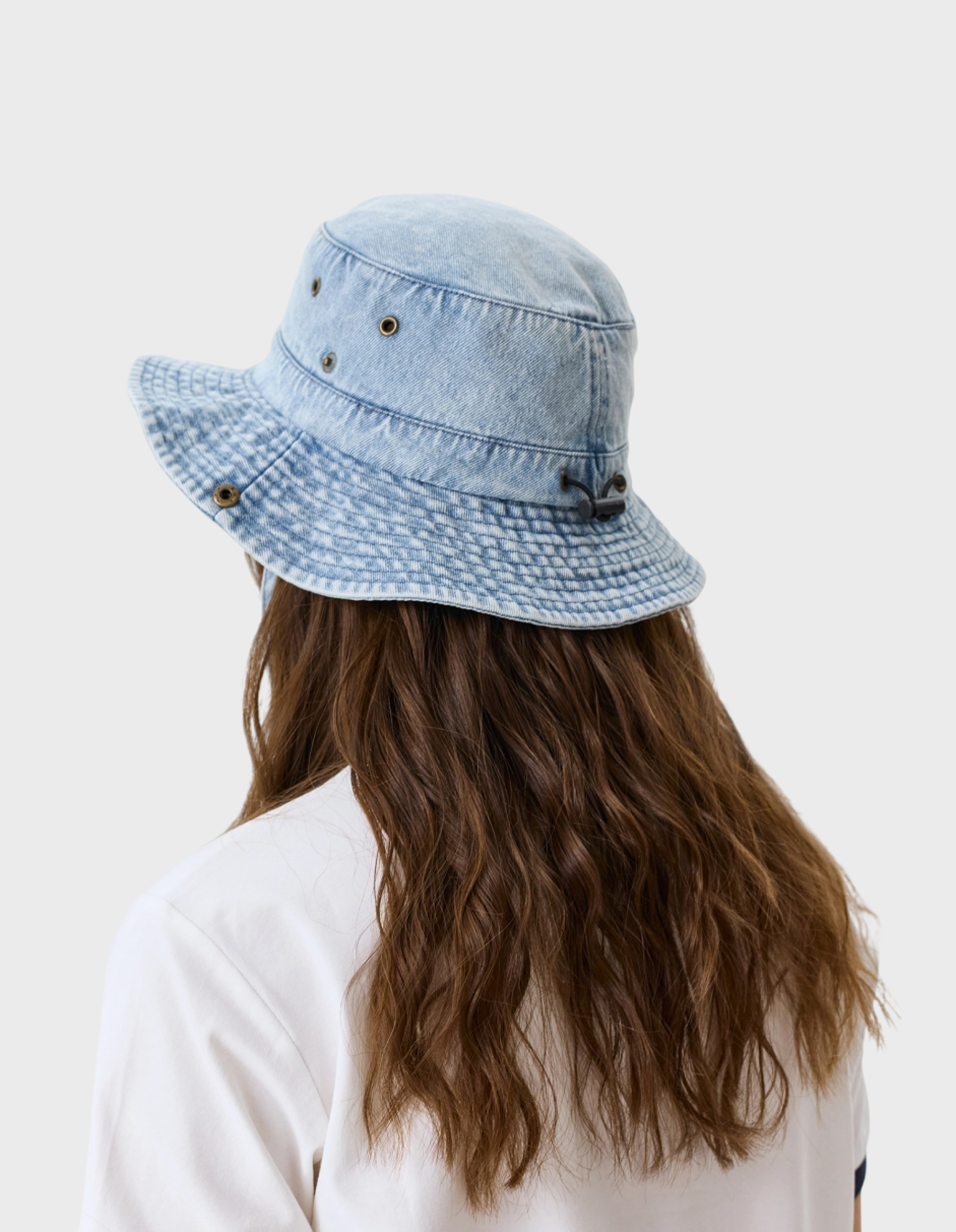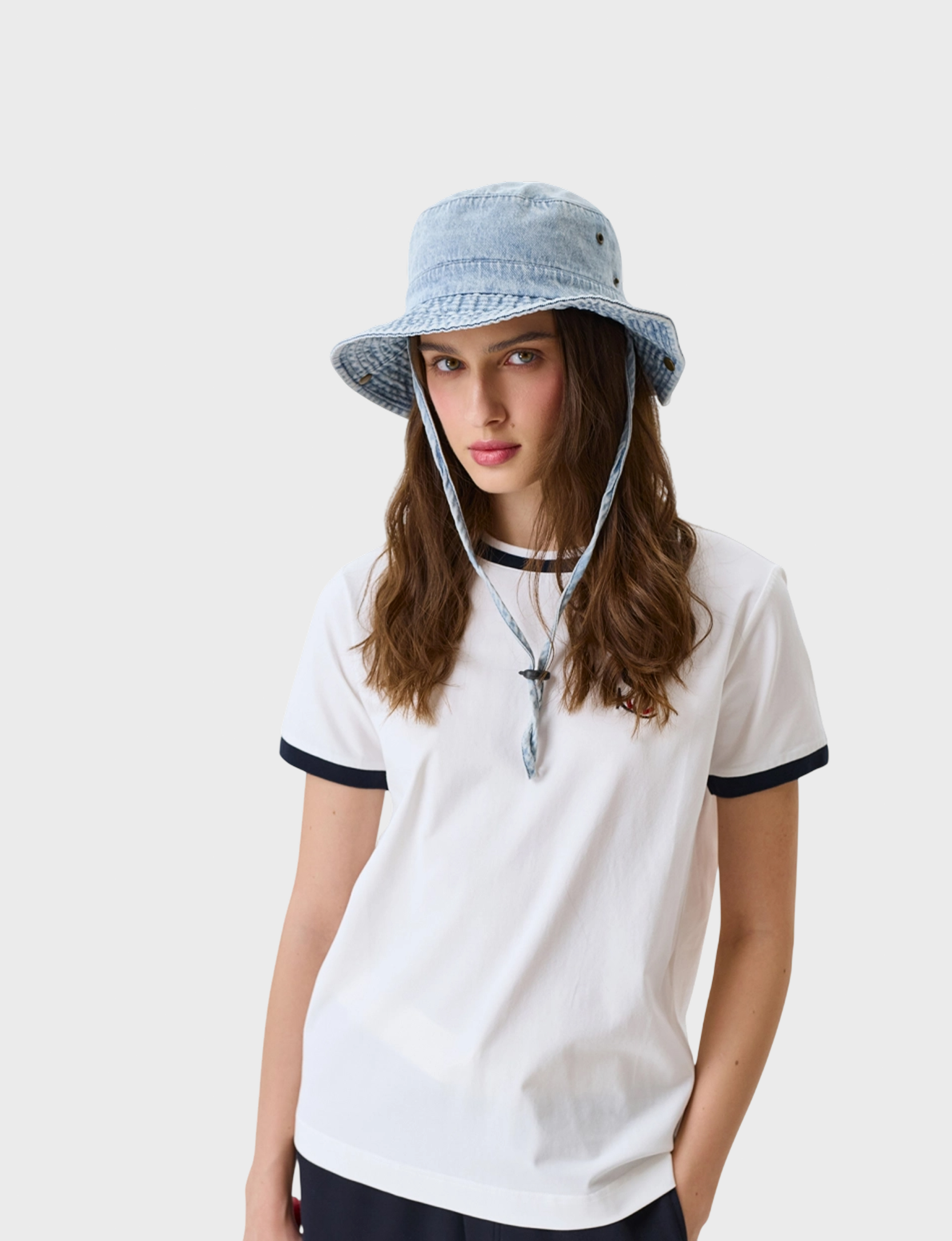 Панама из денима с деликатной варкой в стиле "сафари". Широкие поля можно закрепить на стенках шляпы с помощью металлических кнопок. Регулируется с помощью упругой резинки в основании. Задняя часть с регулировкой на утяжник.