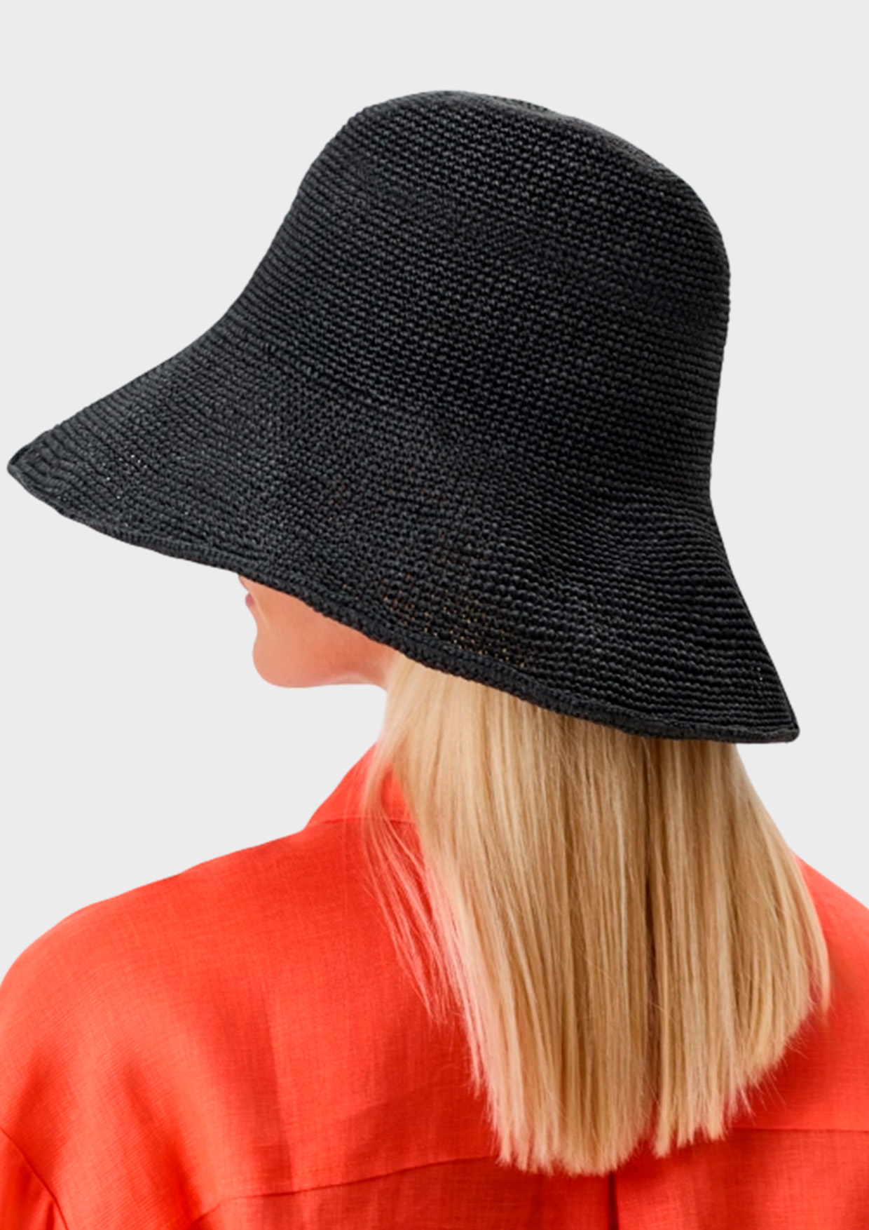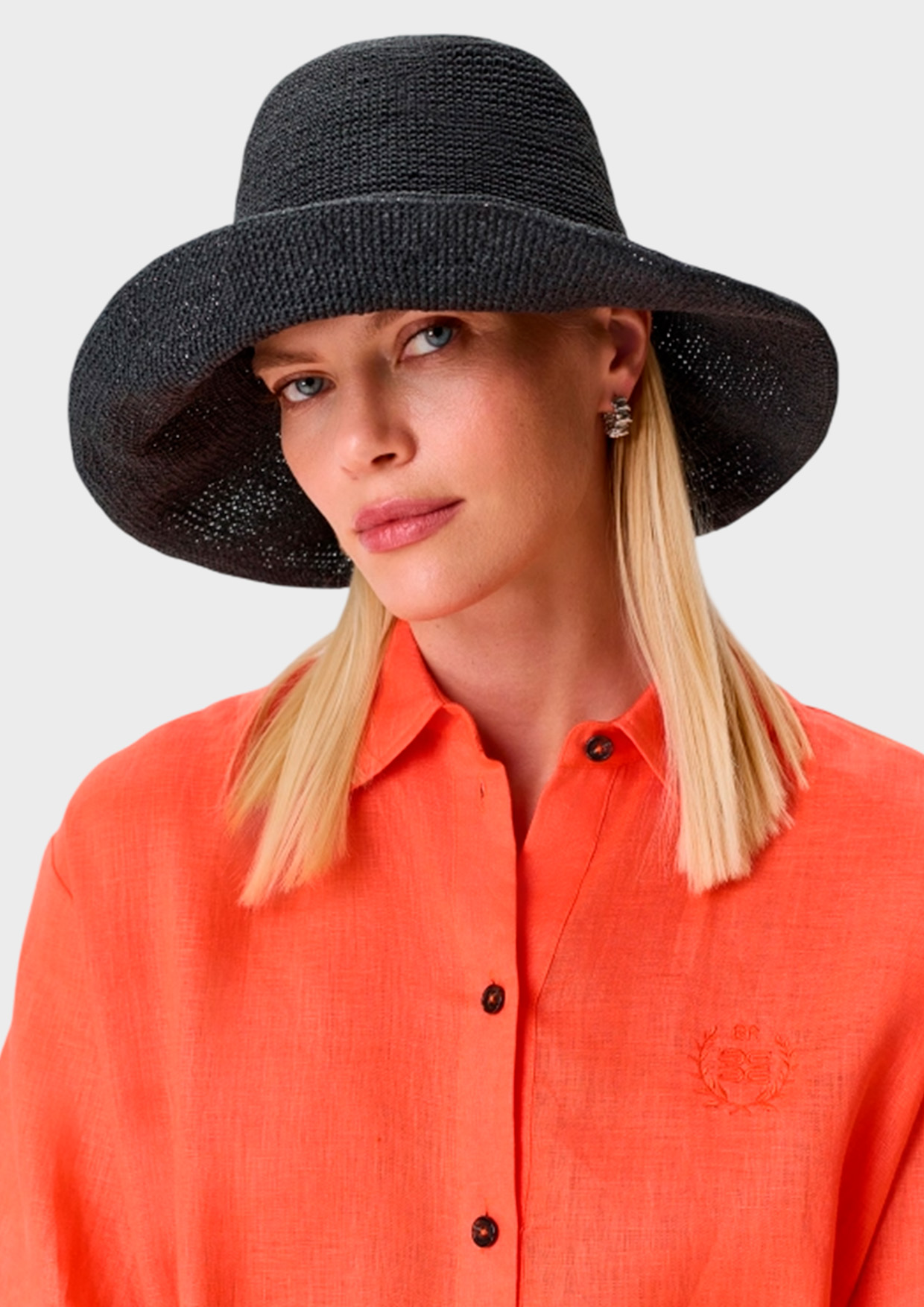 Шляпа-котелок из натуральной бумажной соломки. Плетеная шляпа с округлой тульей и широкими полями с каркасом, благодаря которому можно менять их форму. Регулировка размера с помощью внутренней кулисы.