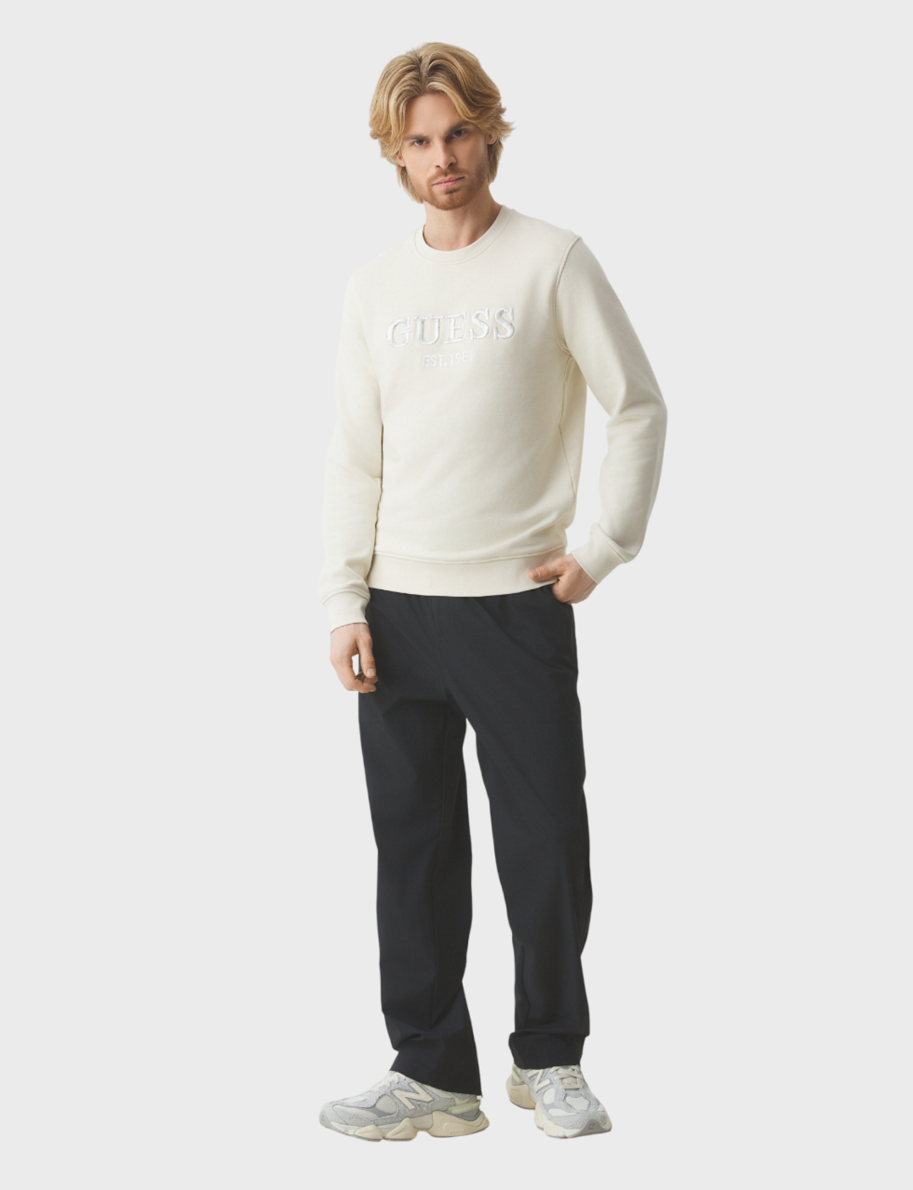 Серебрите улицы стиля нового свитшота Guess! Серо-бежевое исполнение придаст вашему образу элегантности и универсальности, идеально дополняя любой аутфит. Подходящий как для повседневных прогулок, так и вечерних встреч, он станет вашим лучшим другом осенью благодаря мягкому составу (85% хлопка и 15% полиэстера).