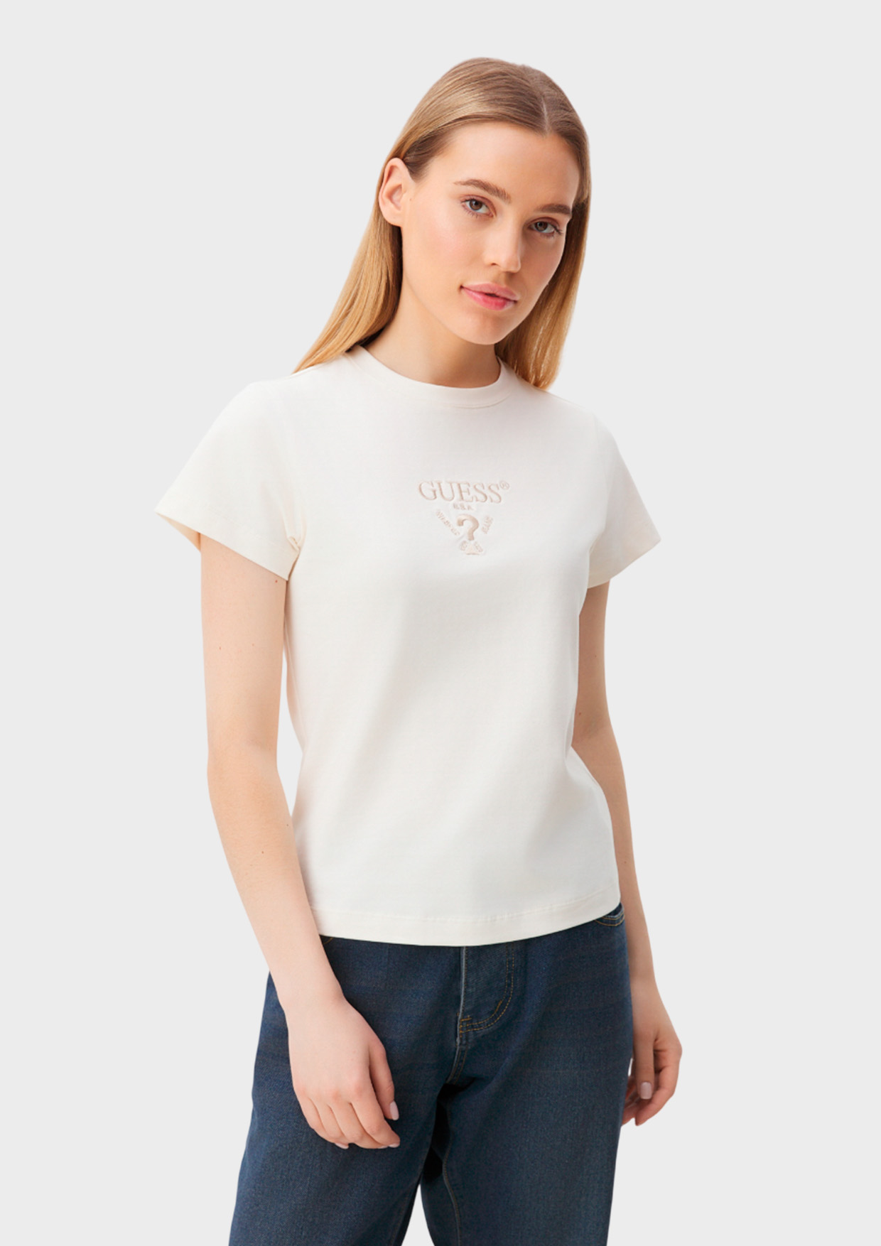 Женская футболка от бренда GUESS – ваш идеальный выбор на весну-лето 2026 года! В молочном оттенке она станет универсальным базовым элементом гардероба из 92% хлопка и 8% эластана — ткань дышит, приятна к телу и сохраняет форму после стирки.