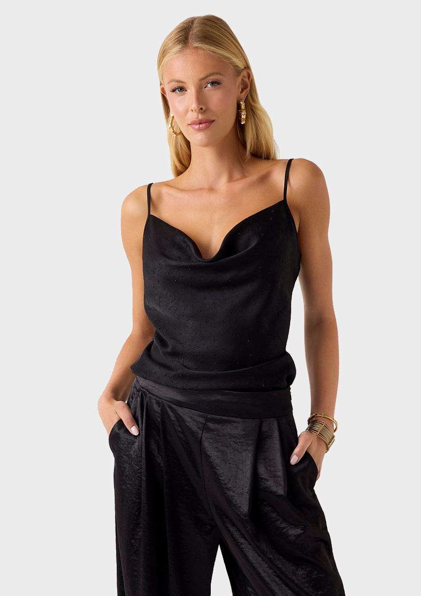 Элегантный топ из атласа. Без рукавов для легкости и комфорта. Изящные тонкие бретели-спагетти. Роскошные стразы для сияющего эффекта.