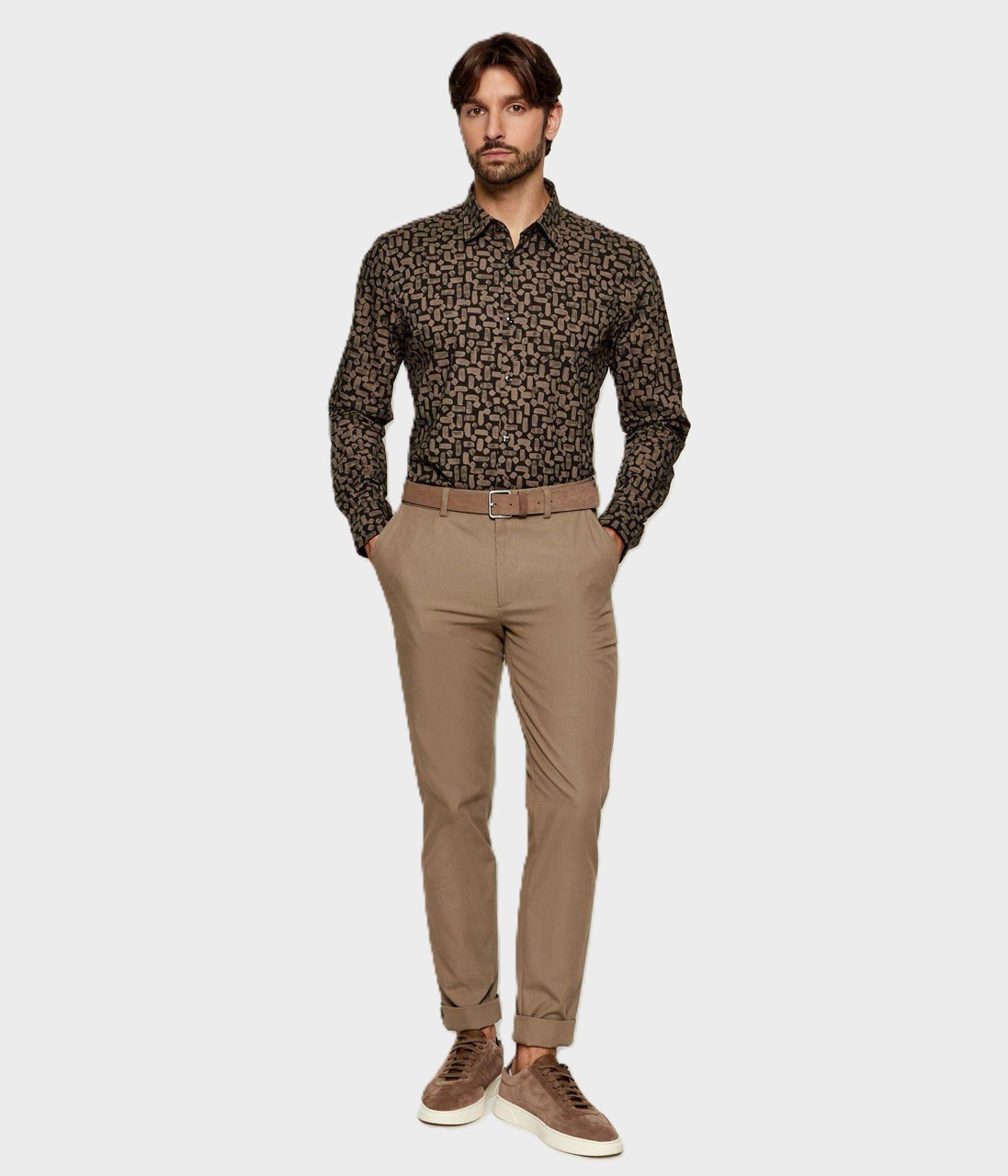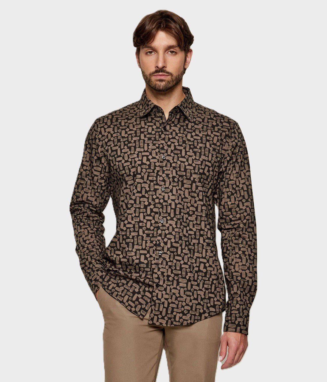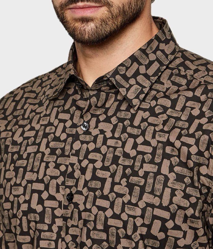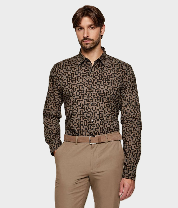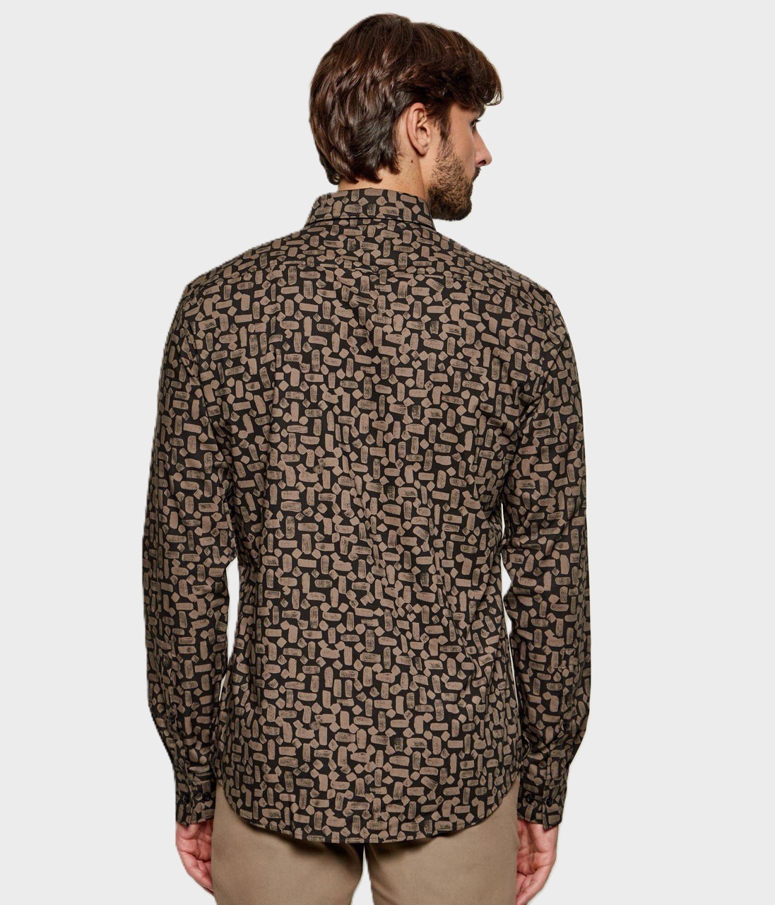 Рубашку выполнили из чистого хлопка с фирменным градиентным паттерном. Модель с фигурным низом, как прямоугольные манжеты, застегивается брендированными пуговицами.