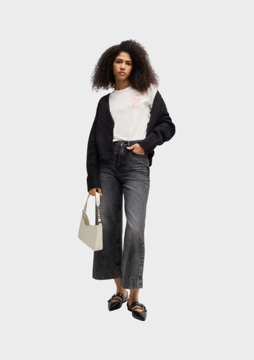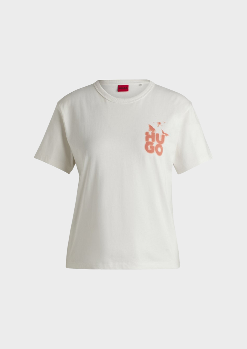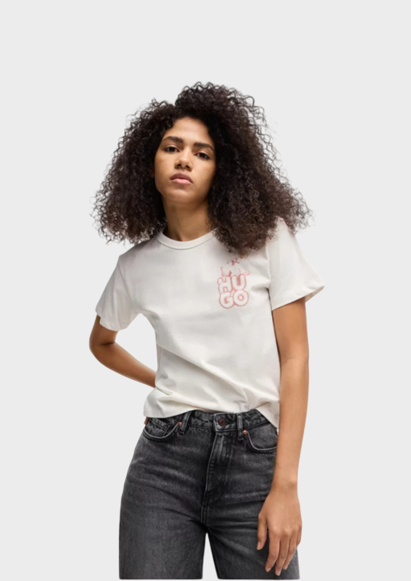 Повседневная женская футболка HUGO с локаничным принтом. Эта футболка прямого кроя изготовлена ​​из хлопкового трикотажа для комфортной посадки.