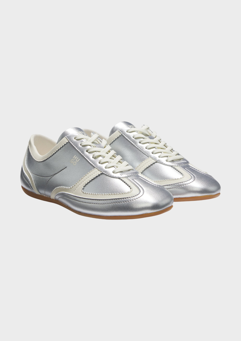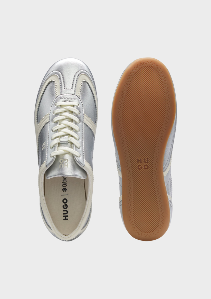 Кроссовки HUGO идеально подойдут как для прогулок по городу, так и для спортивных активностей. Эргономичная стелька создает дополнительное удобство даже при длительном ношении. Благодаря верхнему материалу серебристого оттенка и характерным зигзагообразным деталям эти женские кроссовки HUGO придадут творческий акцент любому образу.
