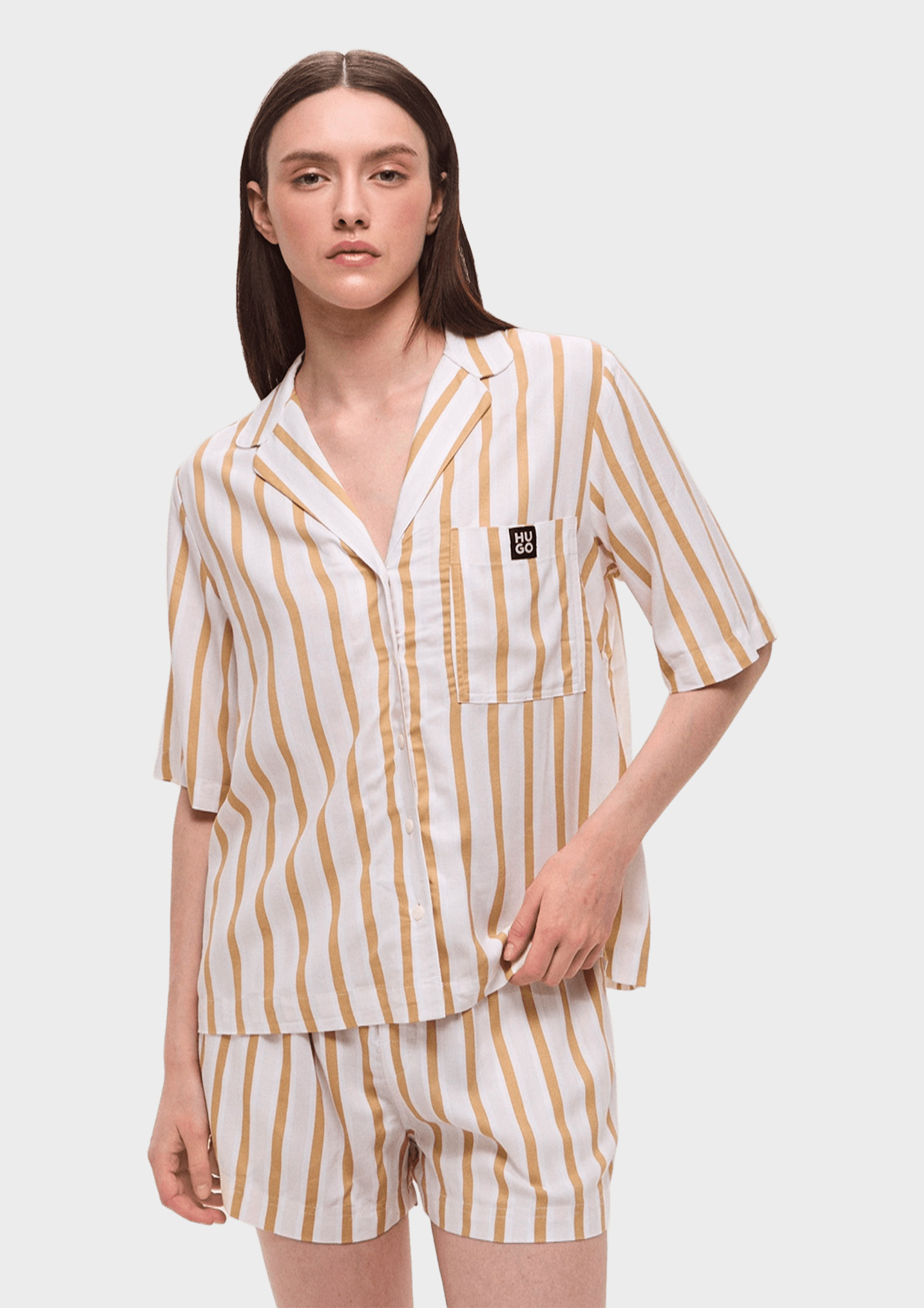 Погрузитесь в атмосферу комфорта и уюта вместе с женской рубашкой-пижамой от всемирно известного бренда HUGO! Элегантные коричневые тона в сочетании со сдержанным белым создадут идеальный образ.