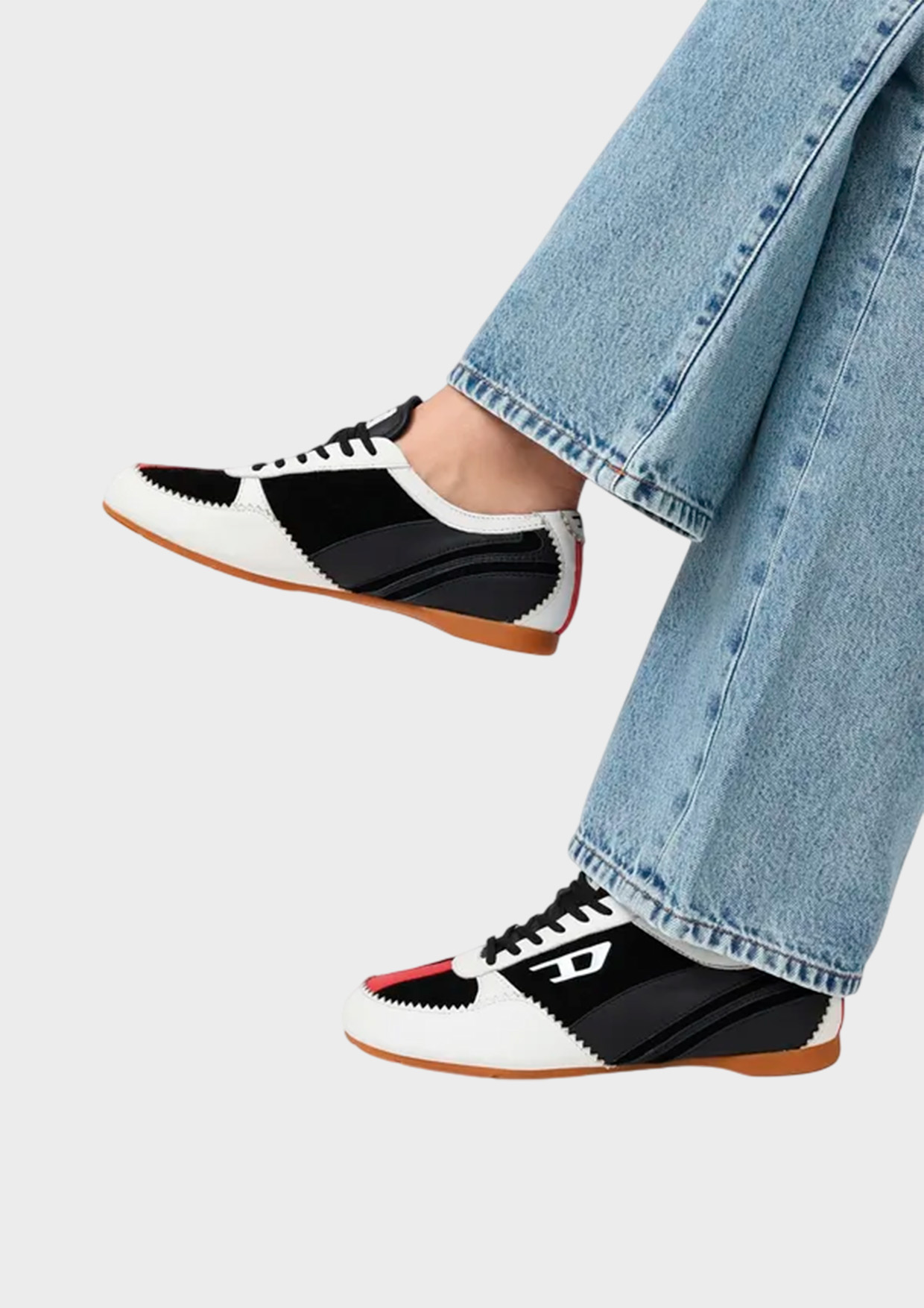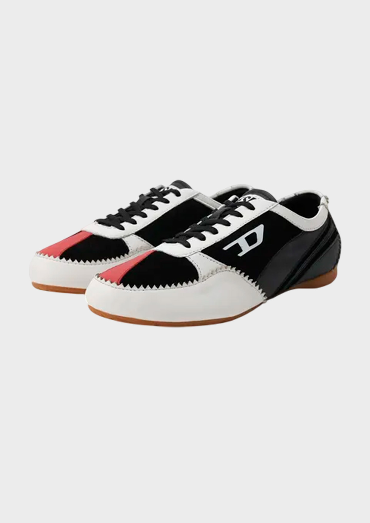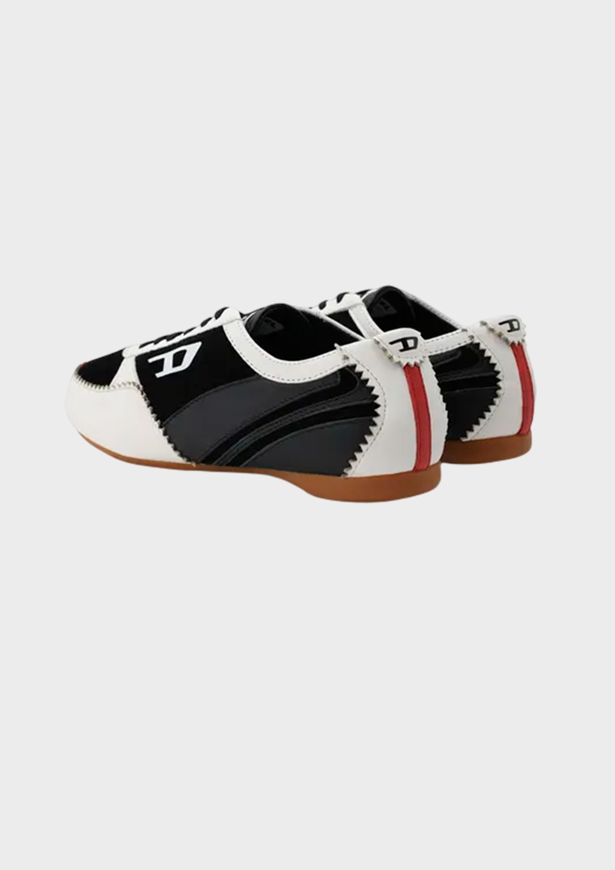 Черно-белые кроссовки Diesel изготовлены из натуральной кожи. Модель на шнуровке декорирована белыми и красными вставками и зубчатыми фестонами. Внутри – дышащая текстильная подкладка. На заднике и сбоку расположен логотип. Гибкая подошва выполнена из легкой резины.