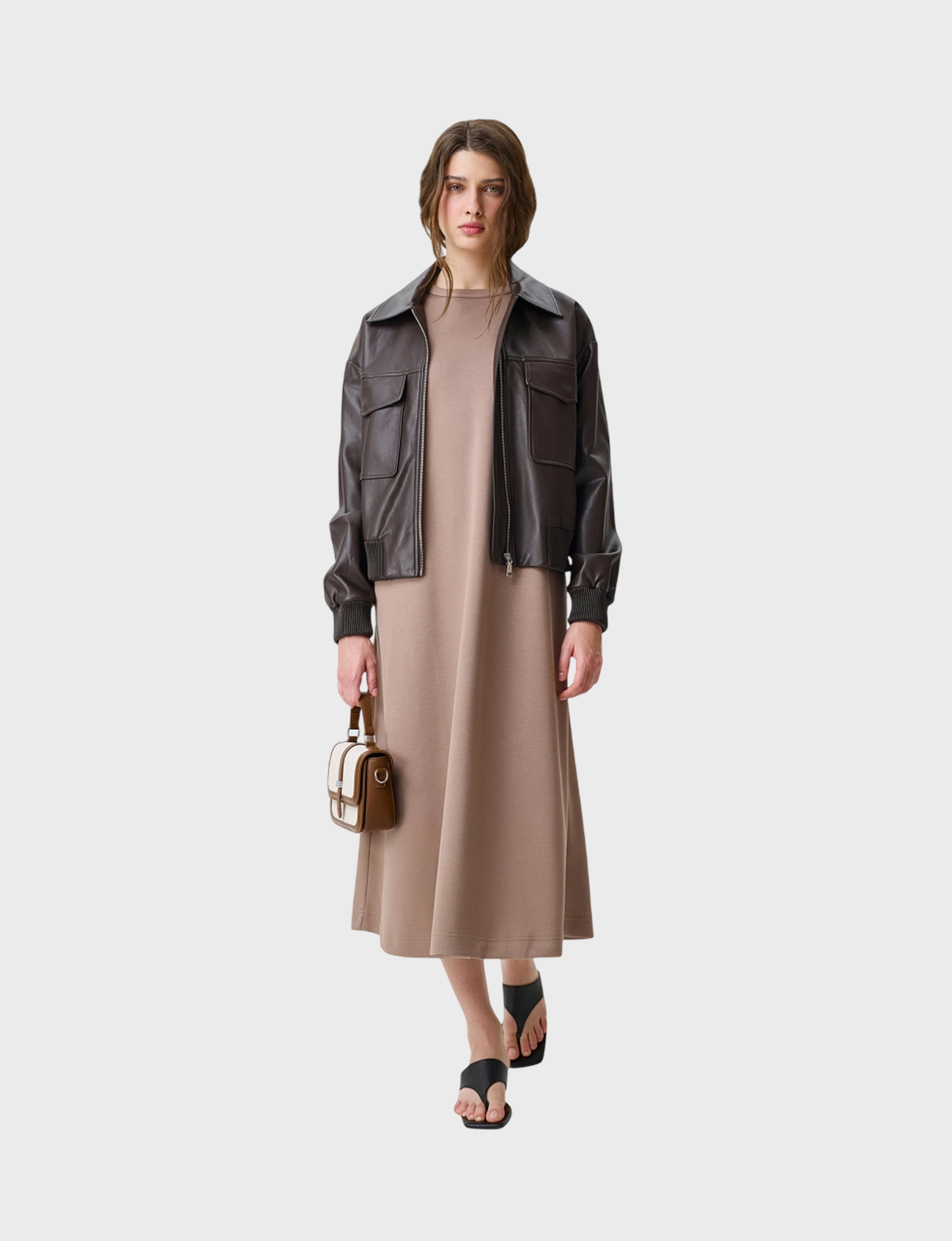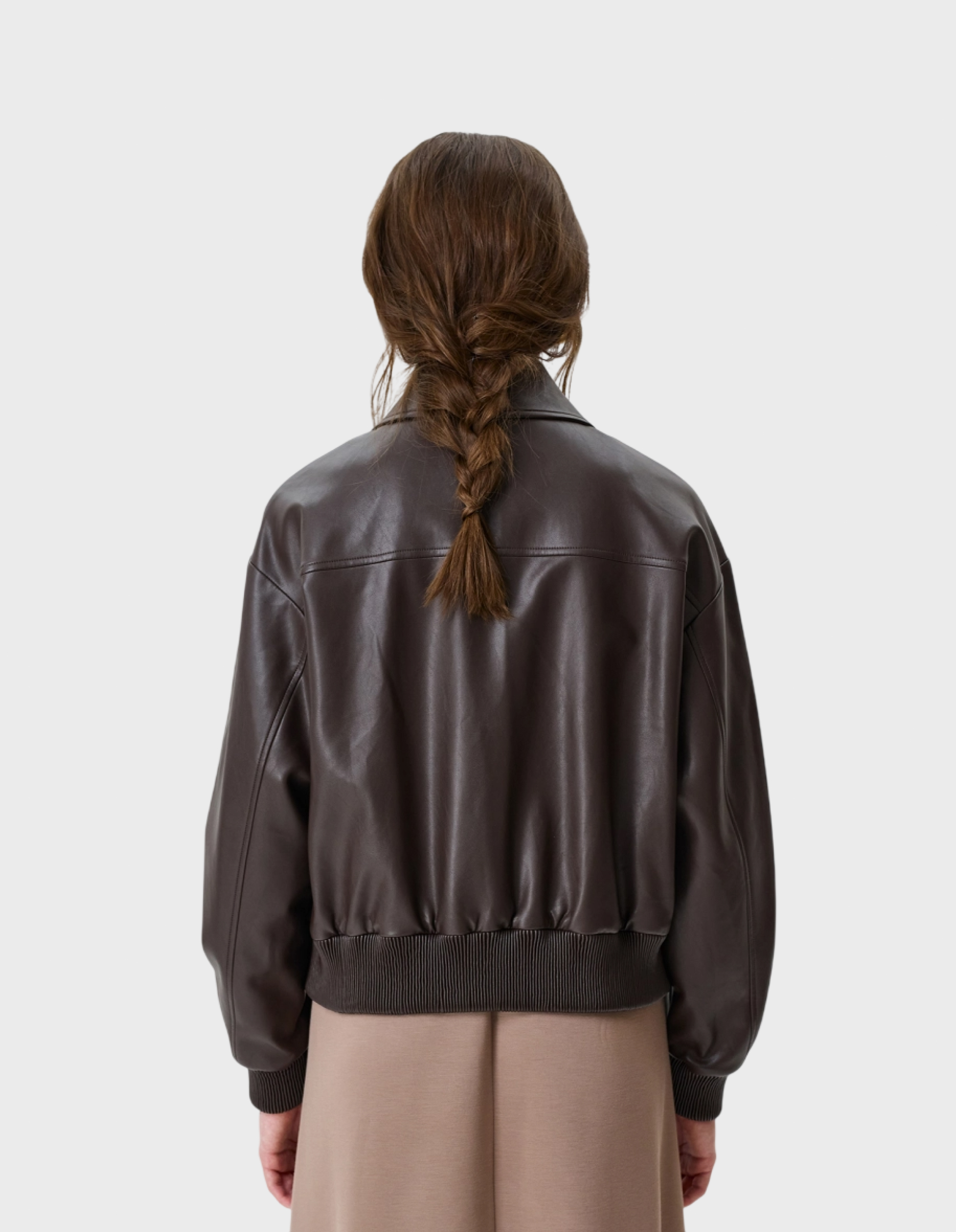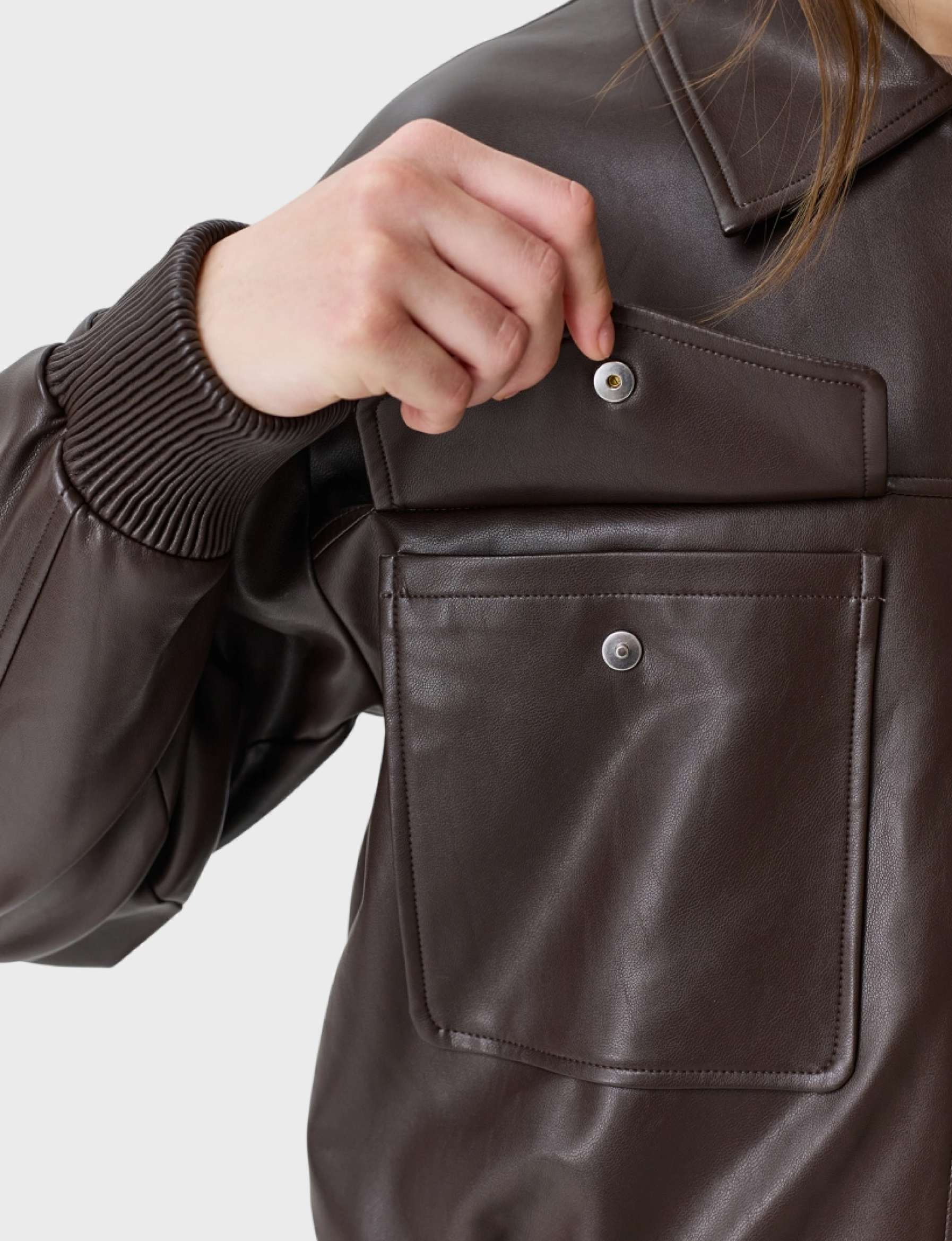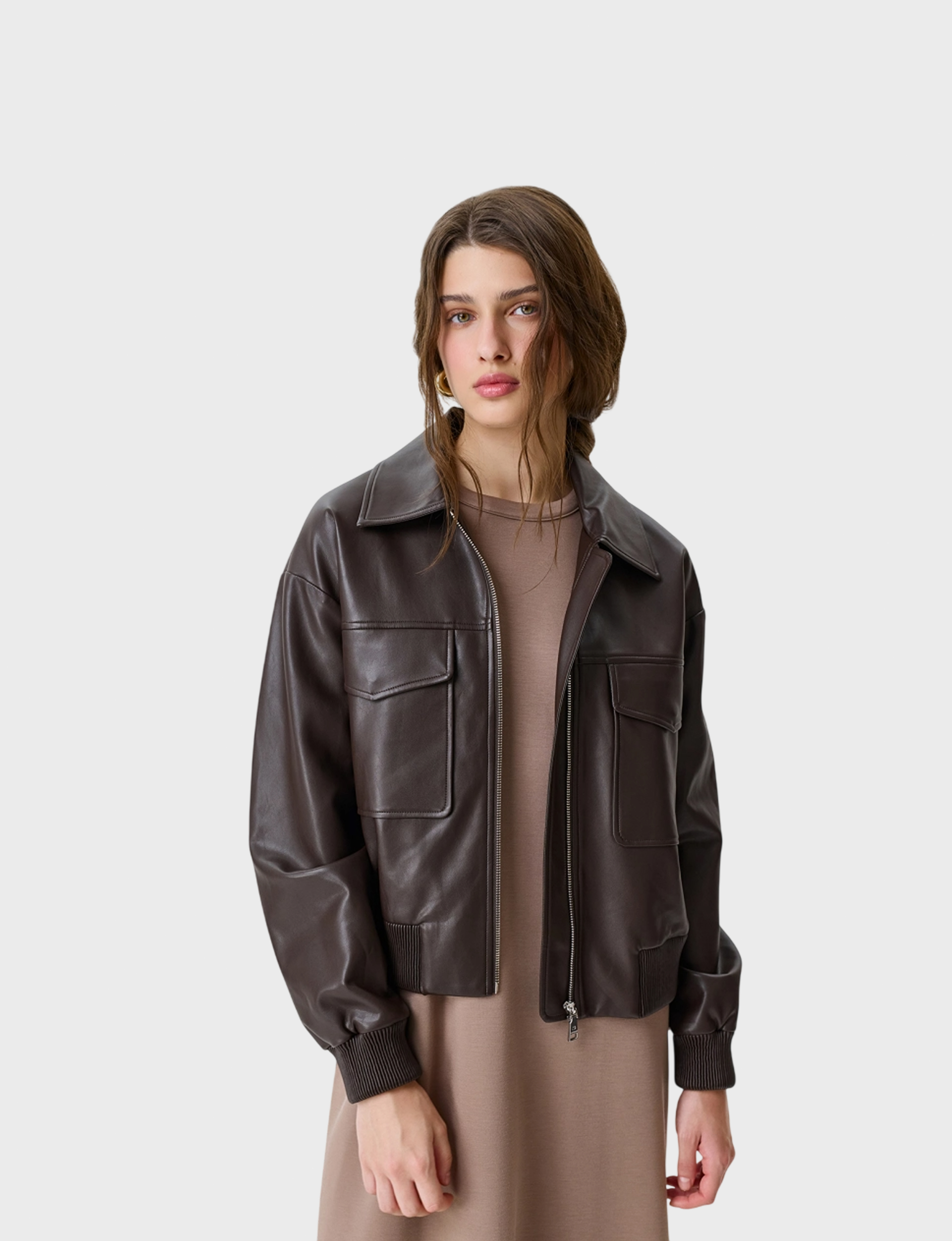 Бомбер из эко кожи с накладными карманами. Свободный силуэт. Отложной воротник. Застежка на молнию. Спущенная линия плеч. Накладные боковые карманы с клапанами на кнопках. Дополнен рибом по низу рукавов и изделия.