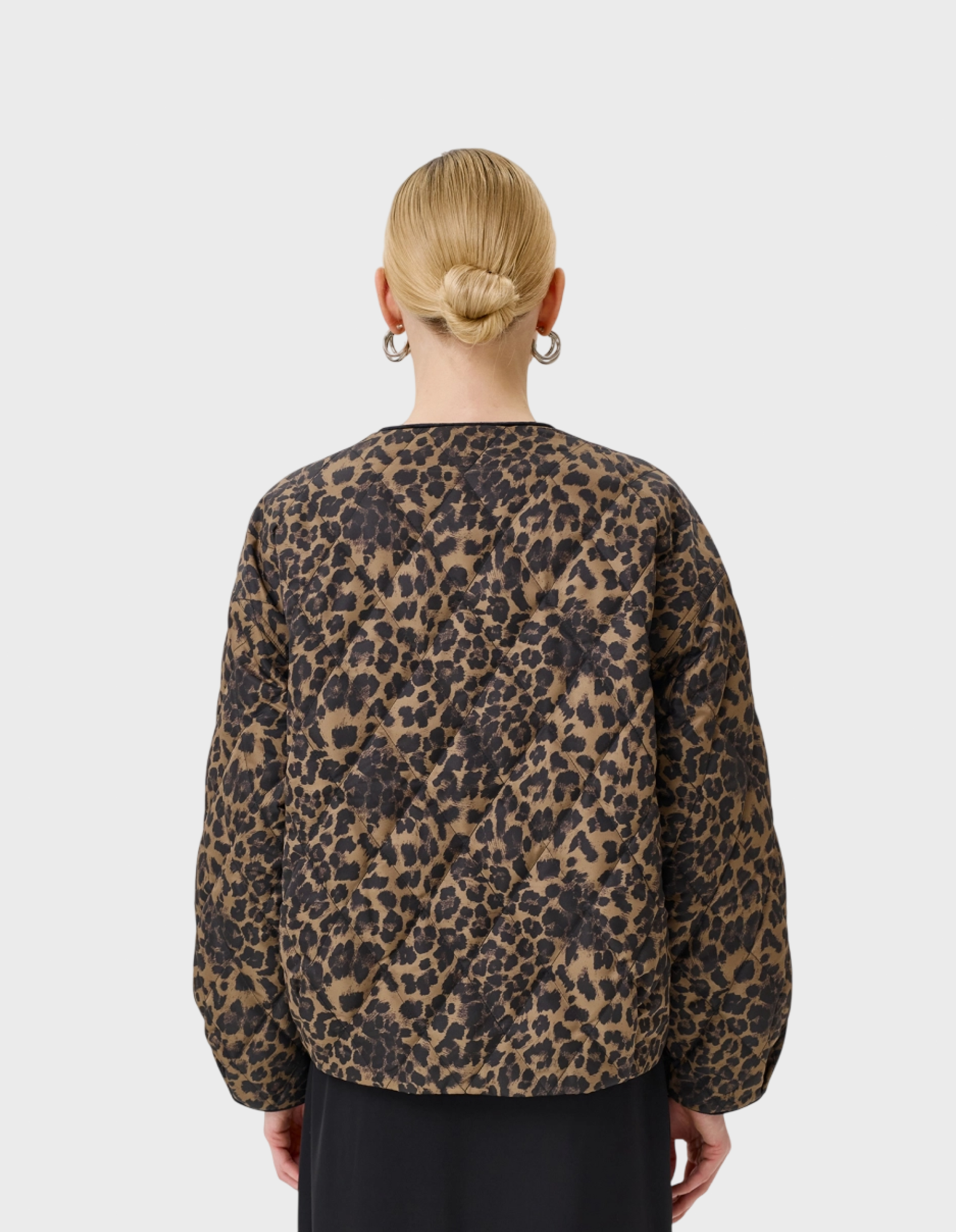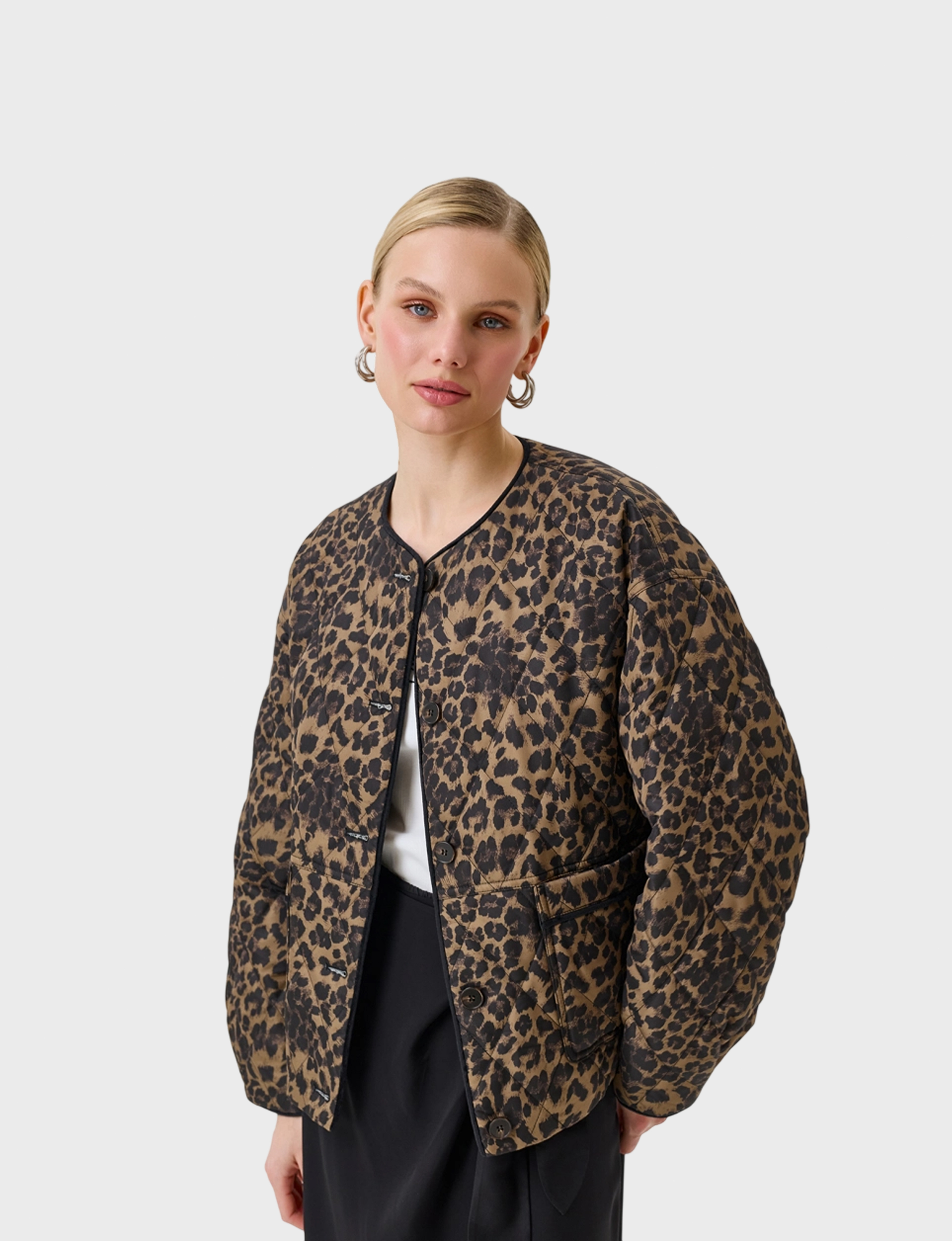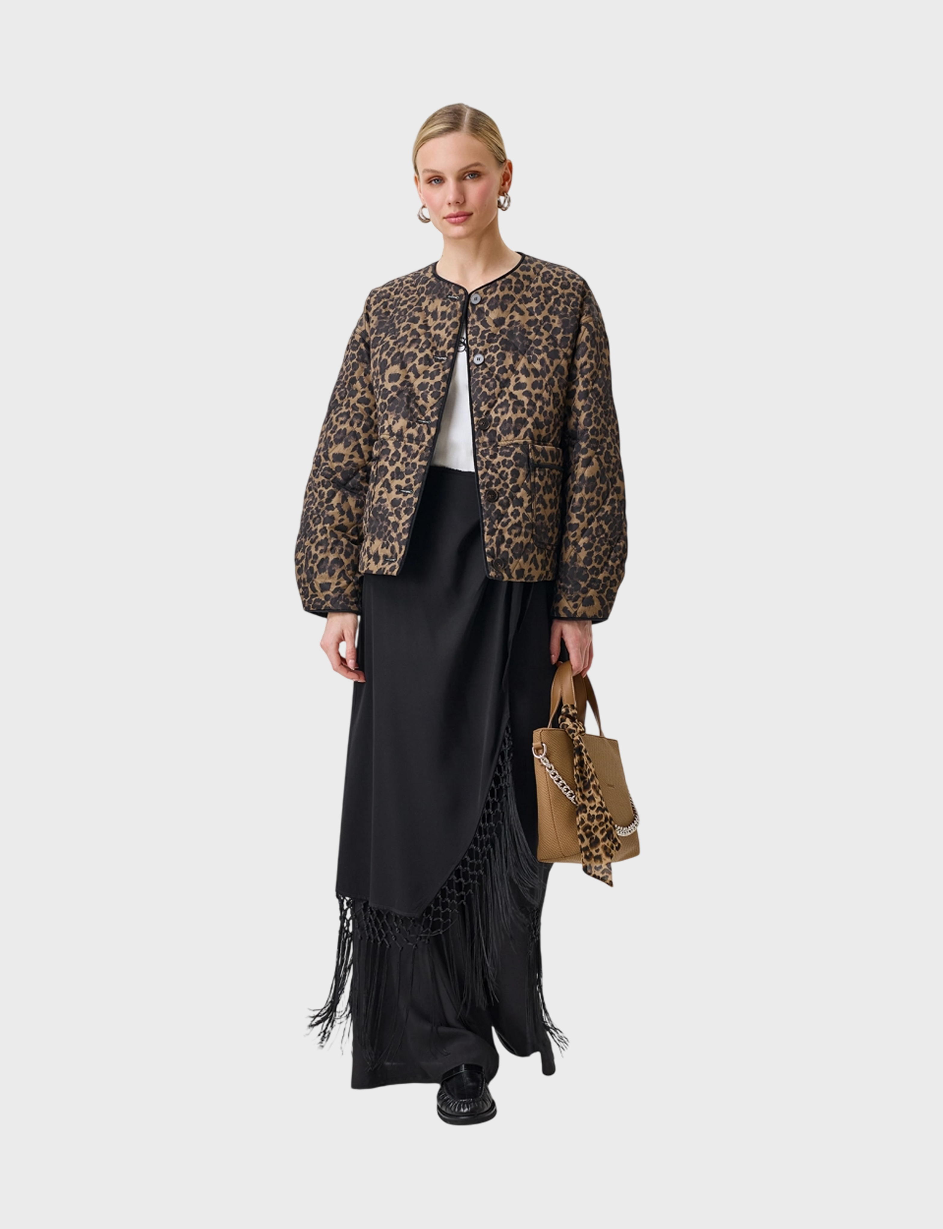 Легкая утепленная куртка с анималистичным принтом. Свободный силуэт. Круглый вырез. Спущенная линия плеч. Застежка на пуговицы. Накладные боковые карманы. Дополнена велюровым кантом по горловине, планке и низу рукавов.