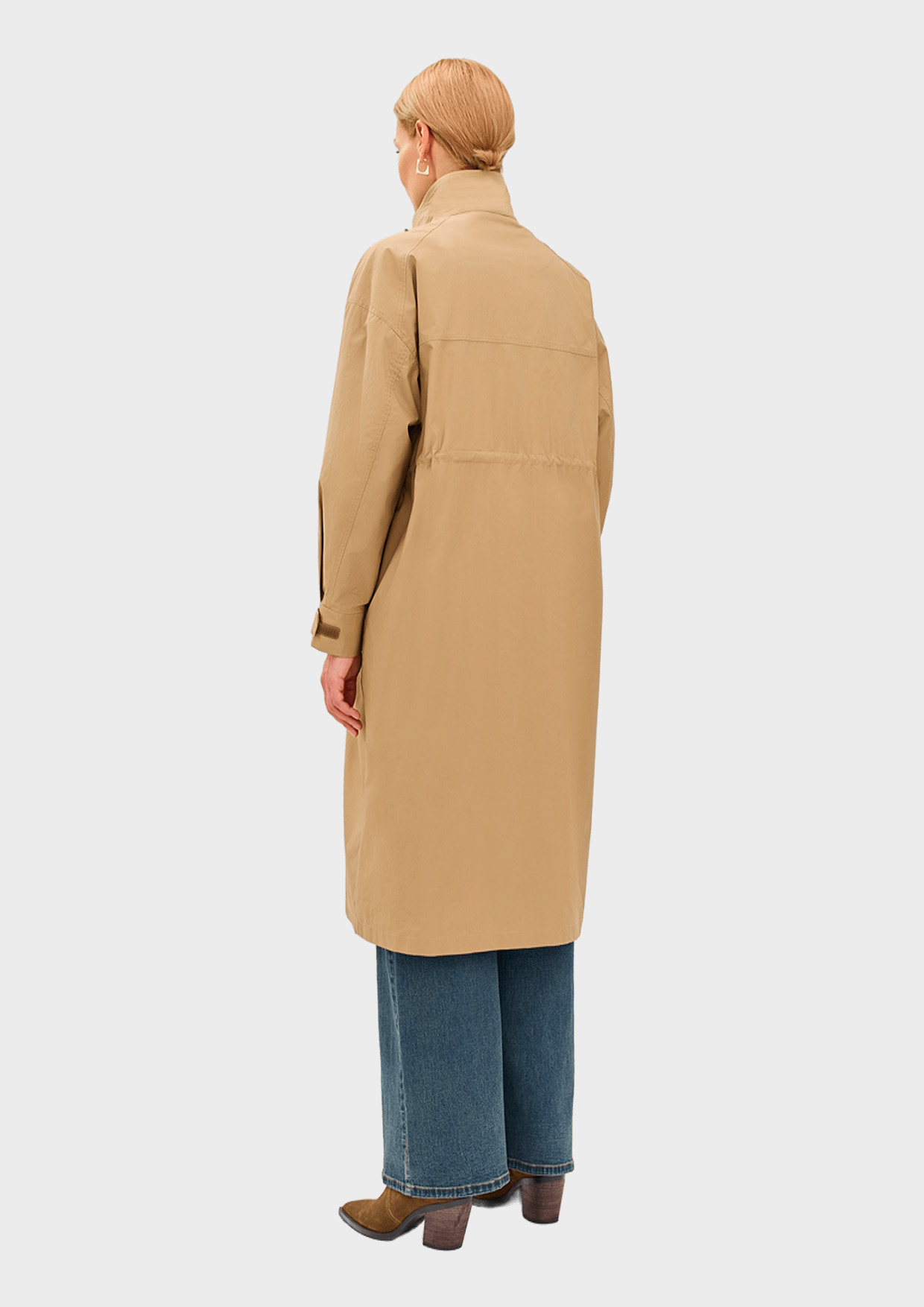 Свободный силуэт можно приталить кулисой, создавая индивидуальный образ. Спущенное плечо и воротник-стойка придают плащу современный и лаконичный вид. Боковые карманы с клапанами, спрятанные под откидной кокеткой, добавляют функциональности, а скрытая застежка на роговые пуговицы подчеркивает классический стиль.