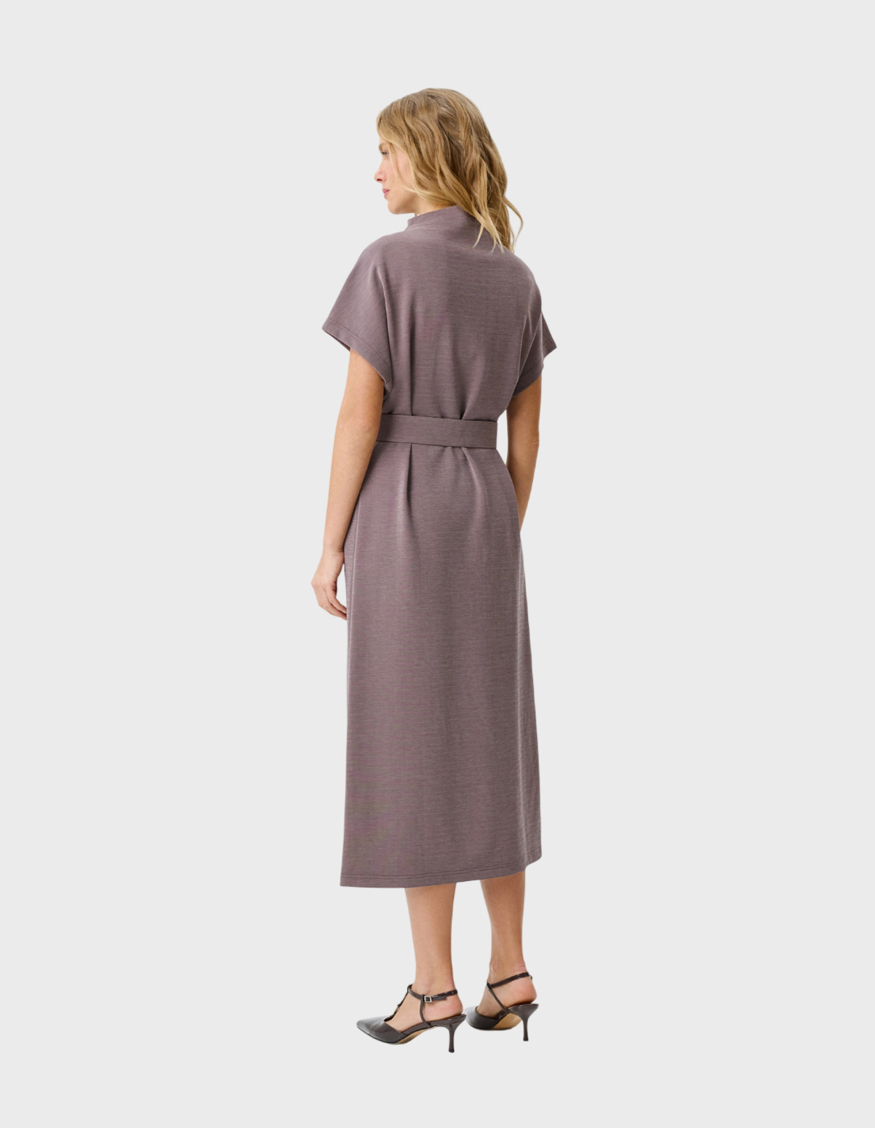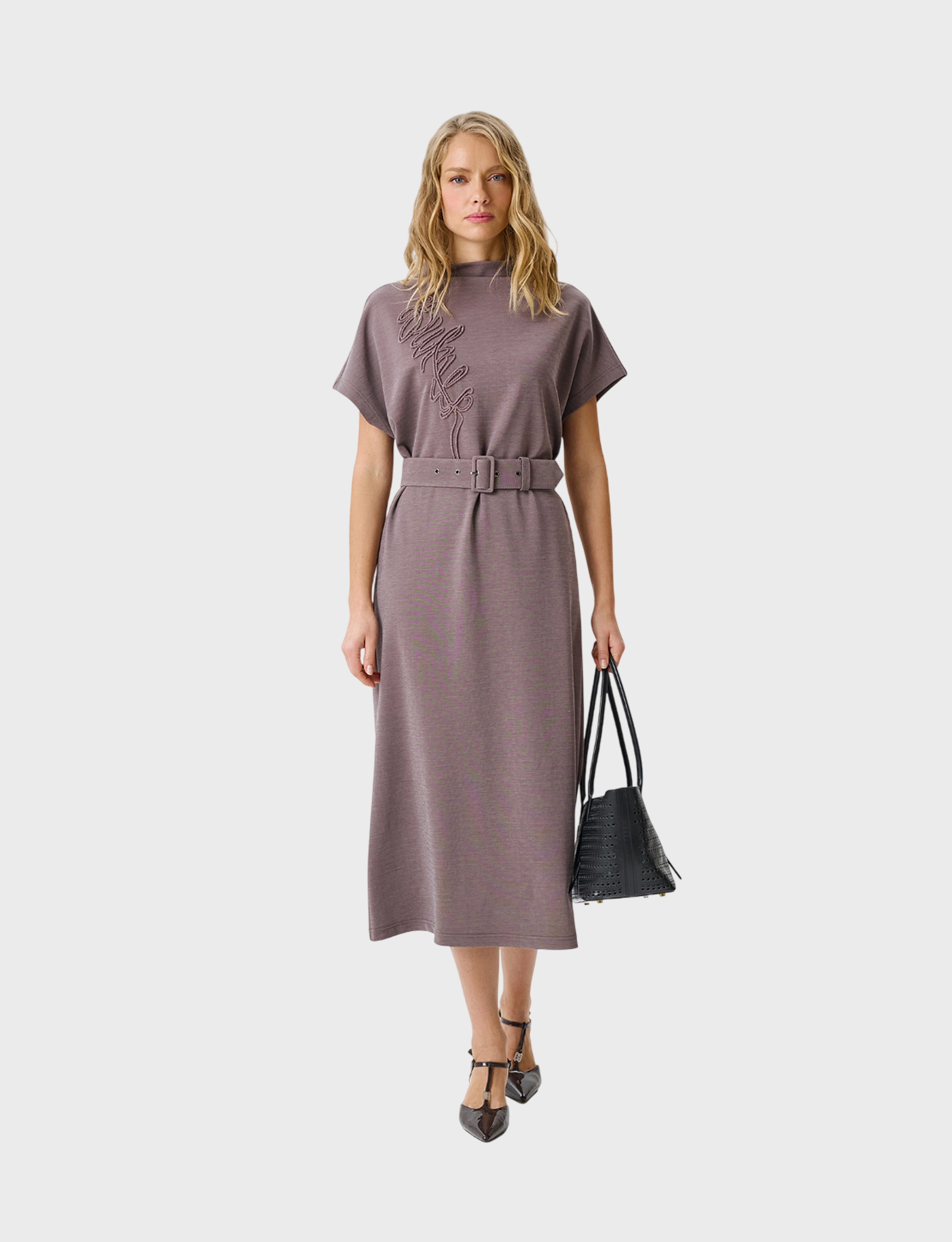 Фактурное трикотажное платье с деликатной вышивкой. Длина миди. Прямой силуэт можно приталить широким поясом. Воротник небольшая цельнокроенная стойка. Короткие цельнокроенные рукава. В составе модал.