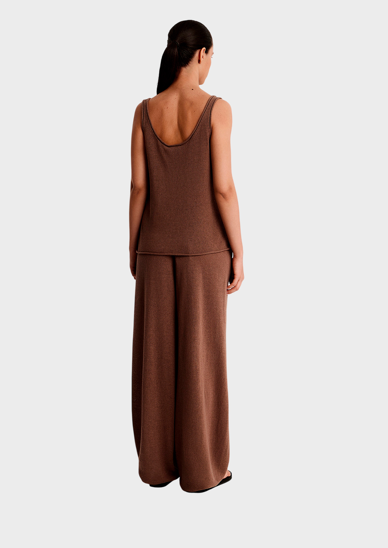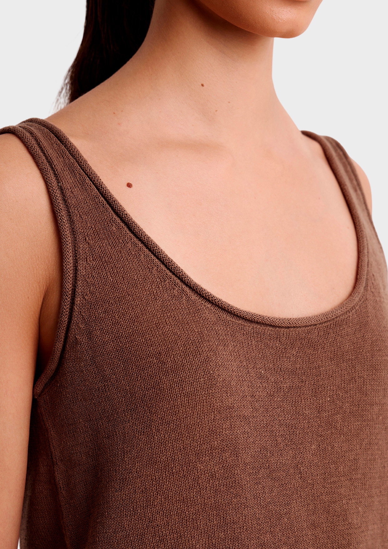 Топ выполнен из смесового трикотажа на основе льна и хлопка. Такой материал мягко ощущается на теле, хорошо пропускает воздух и эффективно отводит влагу, обеспечивая комфорт в жаркую погоду. Углубленная круглая горловина деликатно подчеркивает линию плеч и шеи.