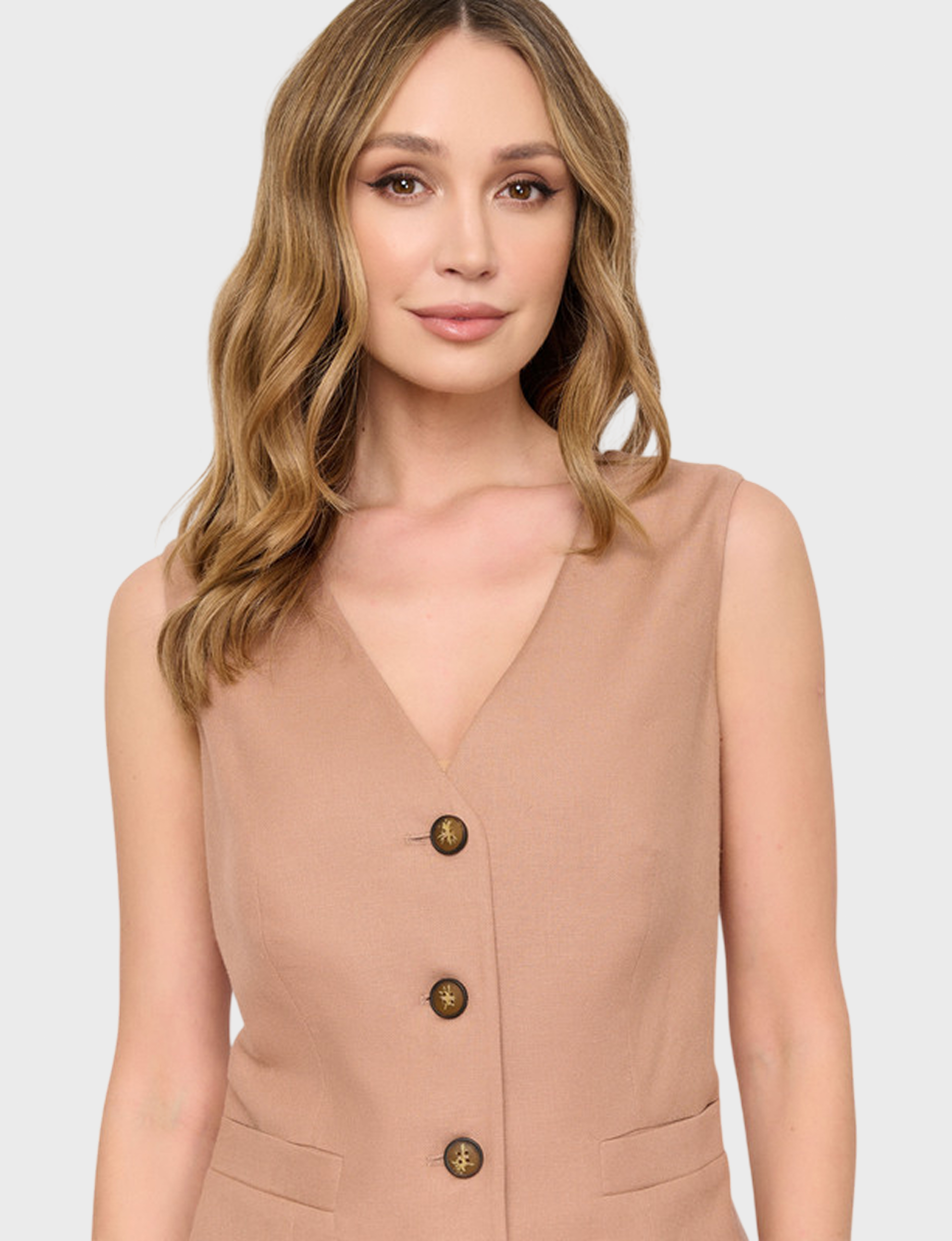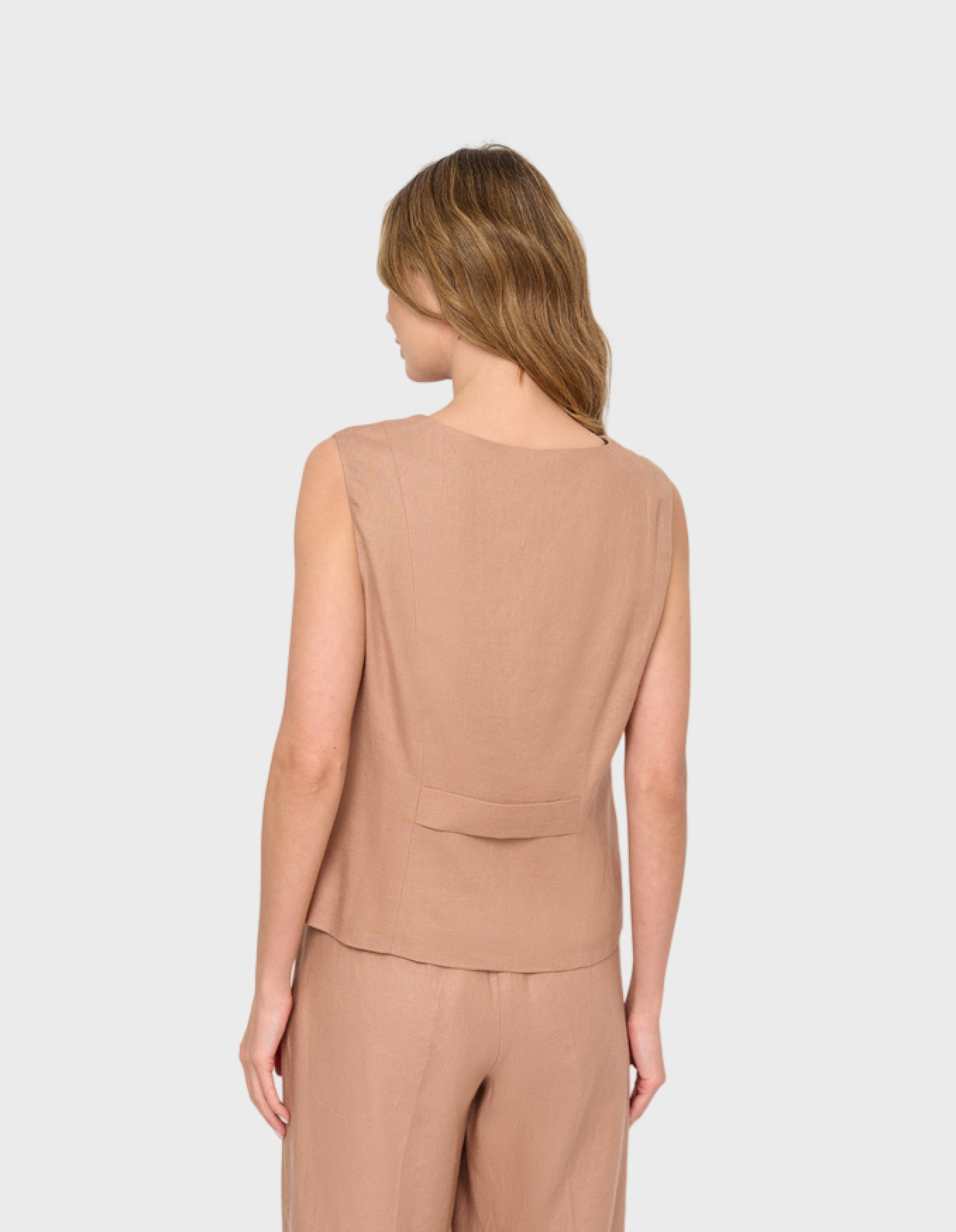 Женский жилет бренда Franco Vello – Изящные линии подчеркивают фигуру, создавая элегантный образ изюминкой которого станет оригинальный коричневый оттенок. Материал сочетает комфорт льна (55%) и мягкость тенселя (45%), обеспечивая свободу движений и приятный к телу контакт.