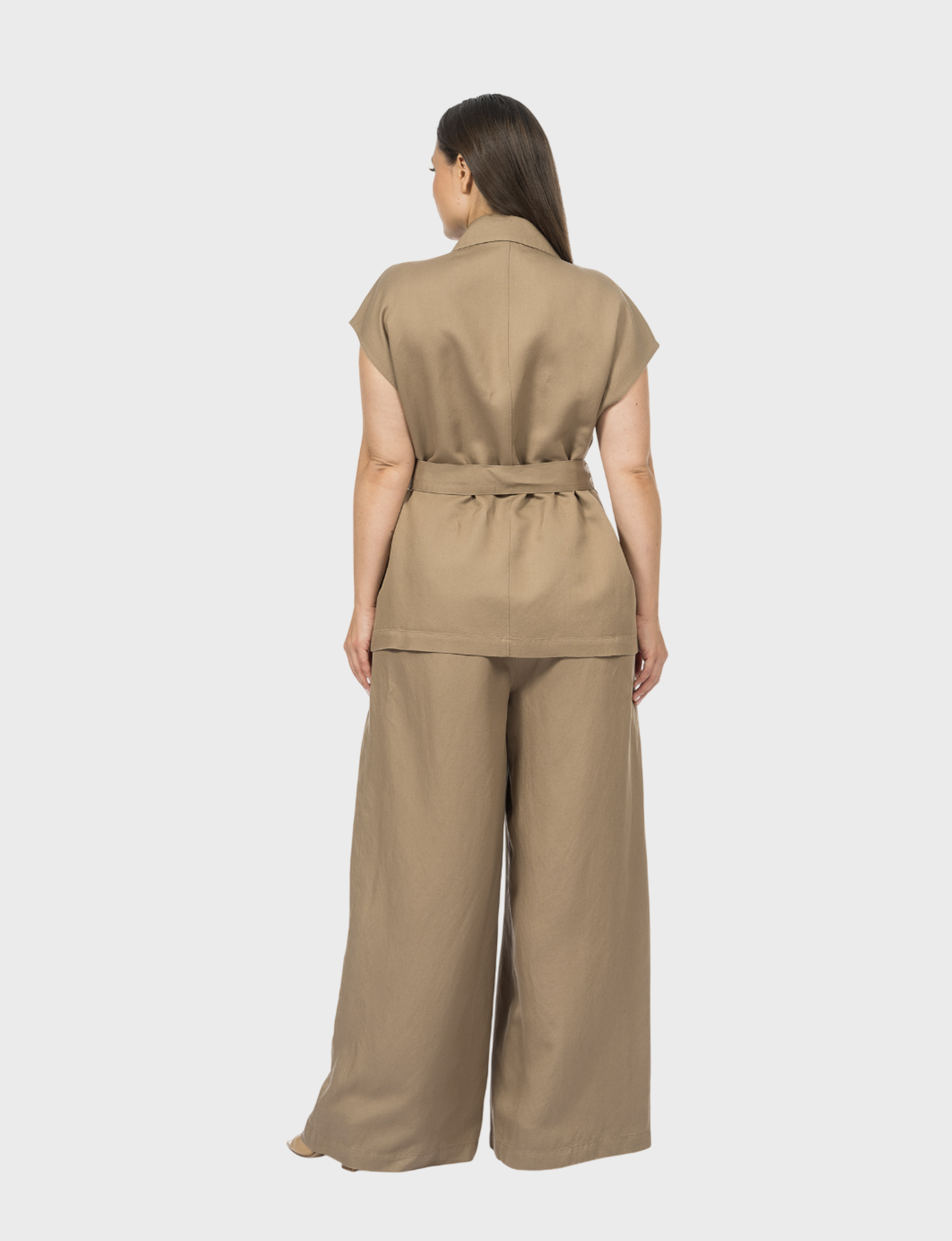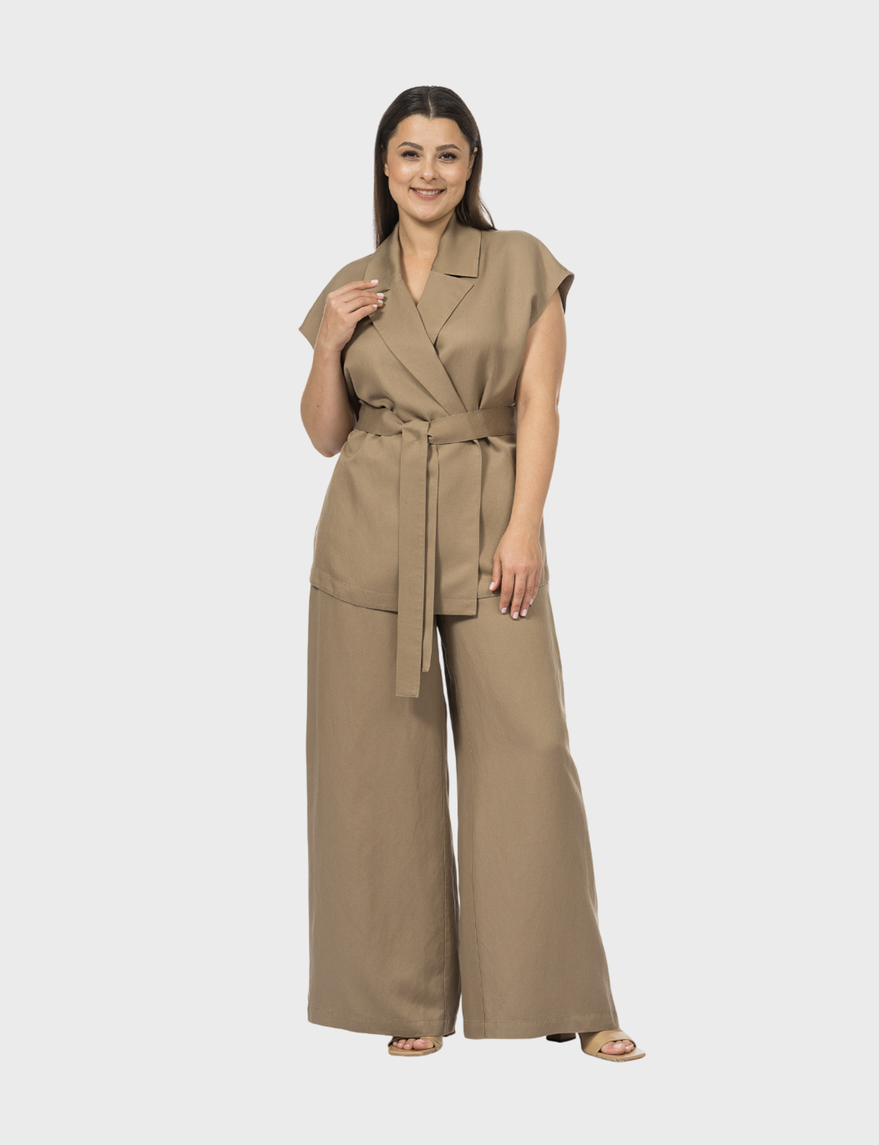 Жилет из натурального льна и модифицированной вискозы совмещает в себе современный крой и экологичную эстетику. Изделие облегченной конструкции, без подкладки не перегружает образ, сохраняя комфорт.