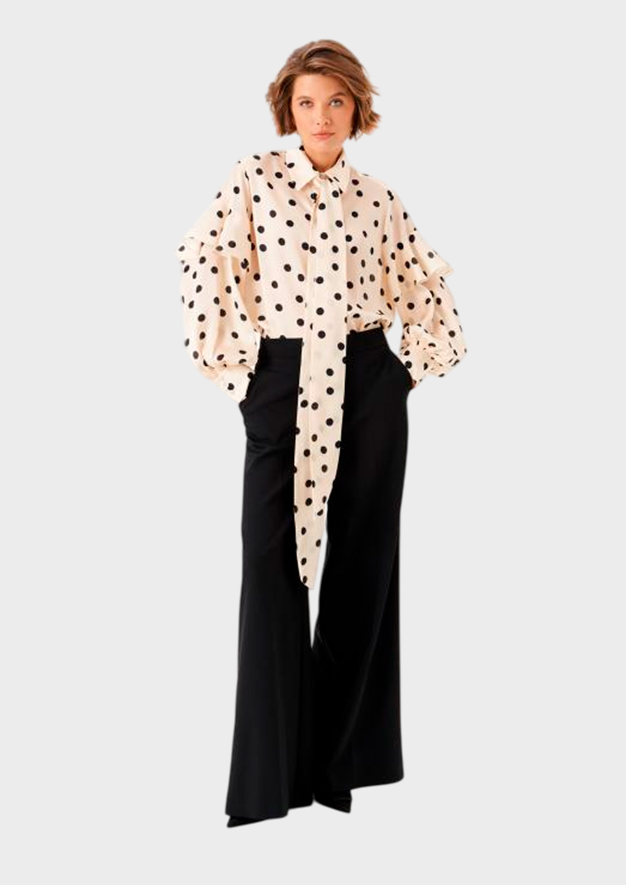 Женственная блуза от бренда NOCHE MIO в нежных оттенках молочного и стильном принте гороха — идеальный выбор для вашего гардероба! Комфорт, благодаря сочетанию материалов, стильный крой подчеркнут фигуру, а универсальность дизайна позволит создавать элегантные образы легко и быстро.