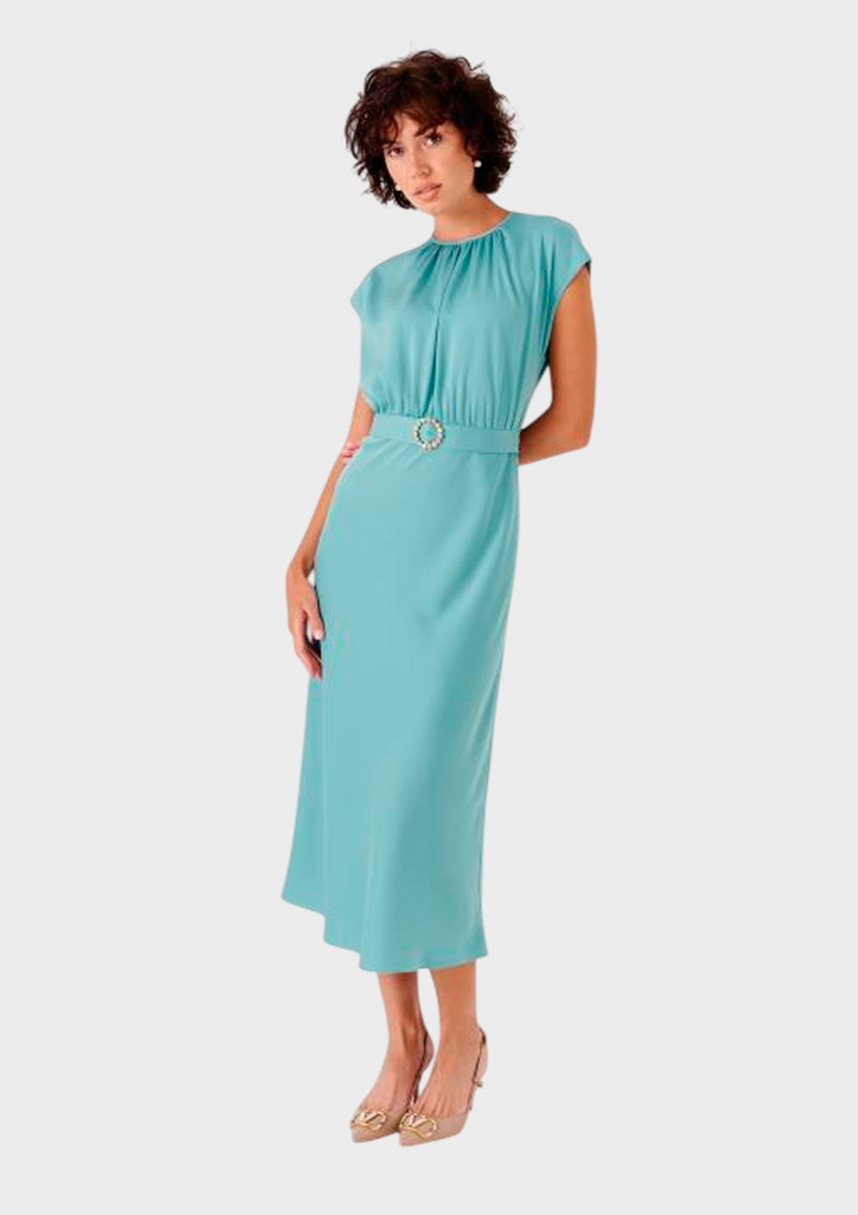 Платье с поясом в голубом цвете подчеркнет фигуру, благодаря изящному поясу. Длина миди идеально подходит для прохладного сезона, позволяя сочетать изделие как со свитером, так и с пиджаком. Стильный выбор для повседневных образов и особых случаев.