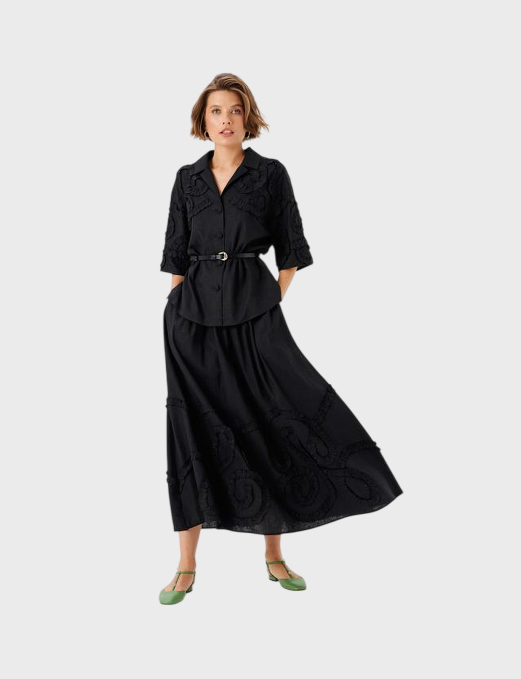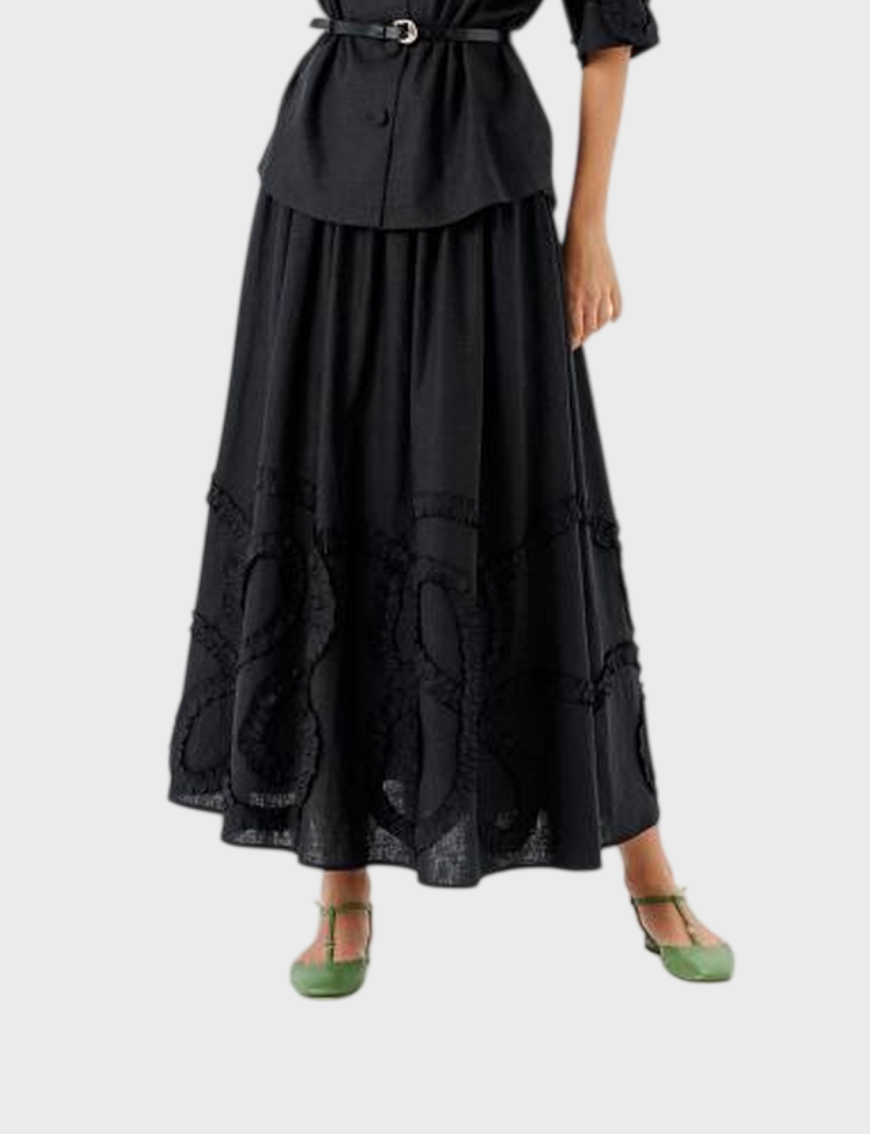 Юбка от бренда NOCHE MIO в стильном черном цвете из комбинации льна (55%) и вискозы (45%). Это идеальное сочетание комфорта натурального материала и элегантности современных тканей.