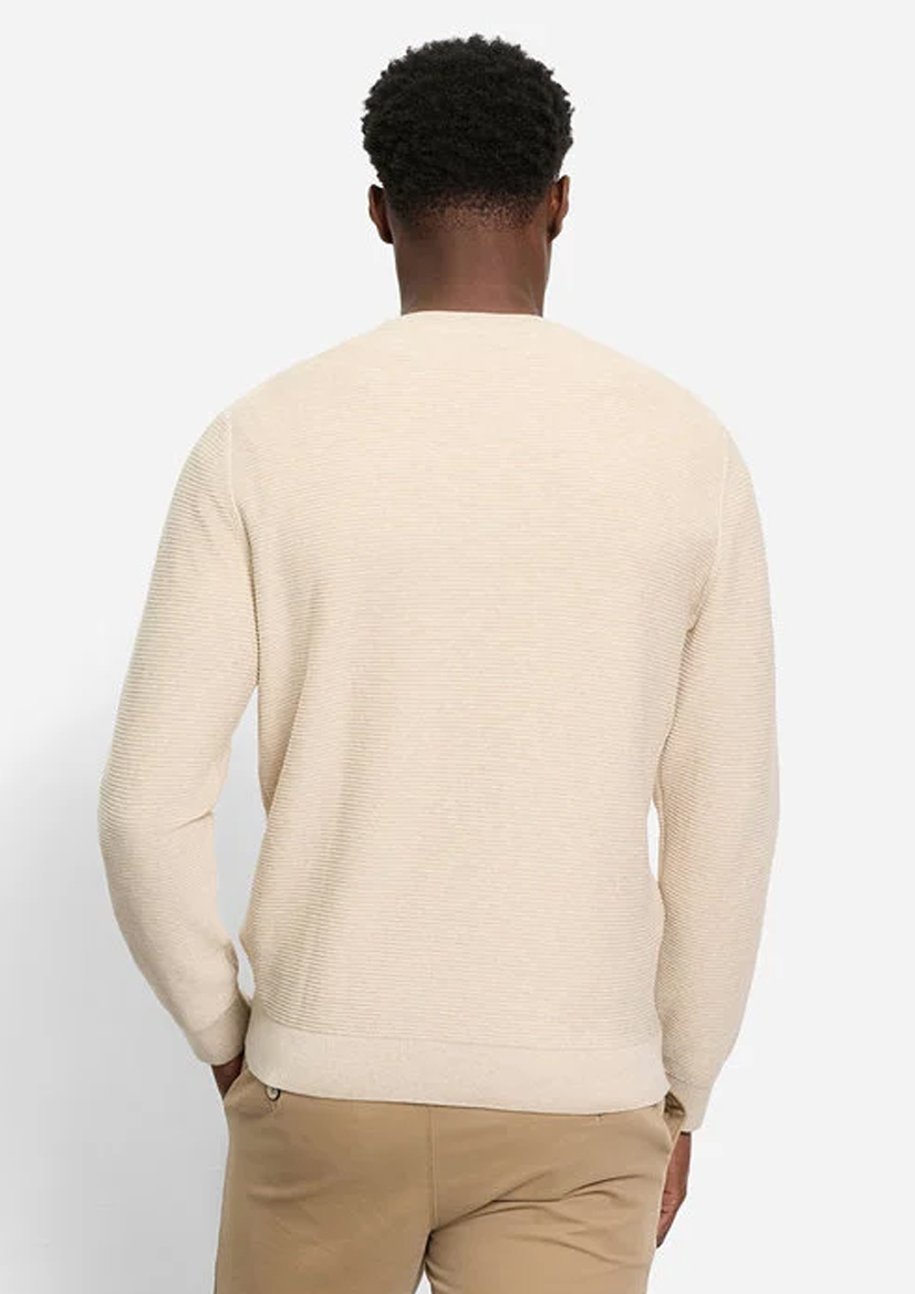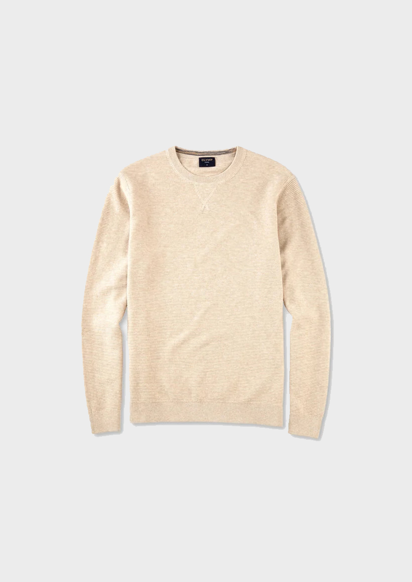 Простой джемпер для повседневных нарядов. Высококачественный легкий хлопковый трикотаж с модным фактурным рисунком идеально подходит для теплой весенней погоды. Модель с удобными манжетами в рубчик, сохраняющими форму, и повседневным круглым вырезом горловины. Универсальная модель из линейки OLYMP Casual, выполненная в элегантном светло-бежевом цвете.