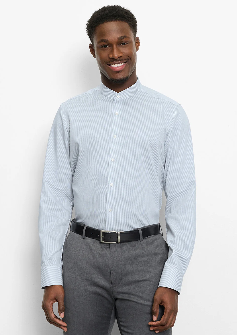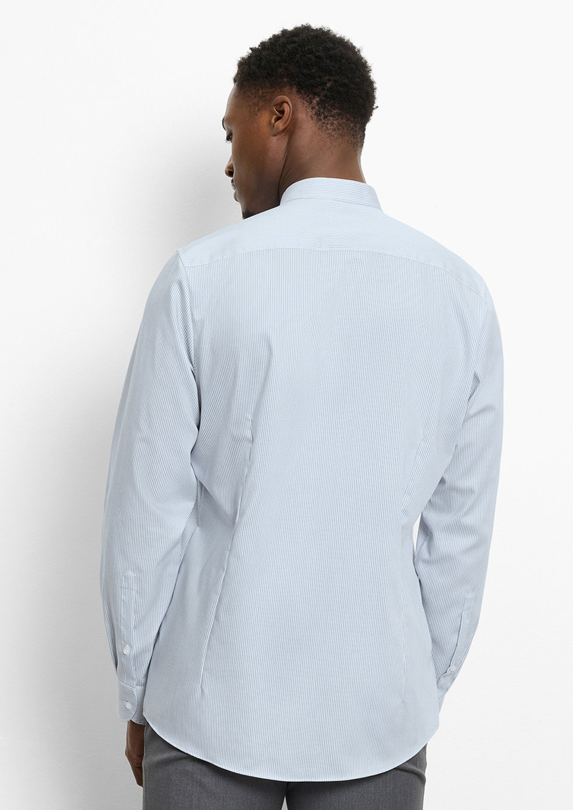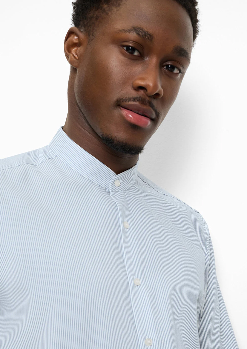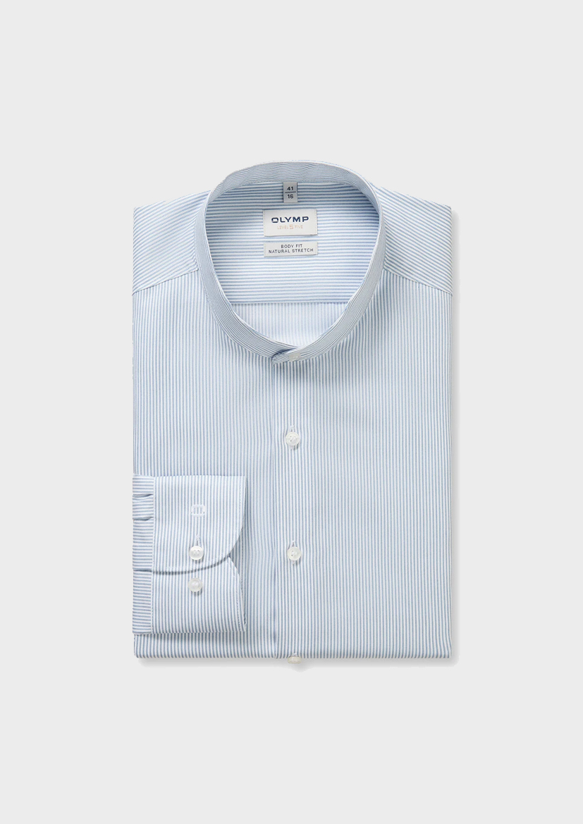 Хлопковая сорочка с детализированным рисунком в синюю полоску. Рубашка OLYMP приталенного кроя с изящным воротником-стойкой. Гладкая, легкая на ощупь ткань создает ощущение комфорта при носке. Планка дополнена белыми пуговицами. Манжеты на пуговицах дополняют дизайн.
