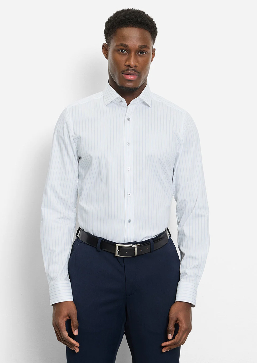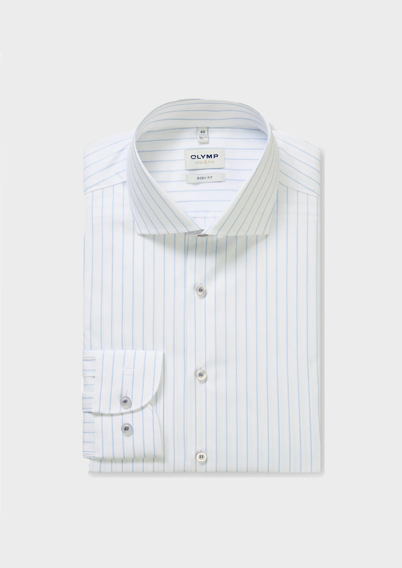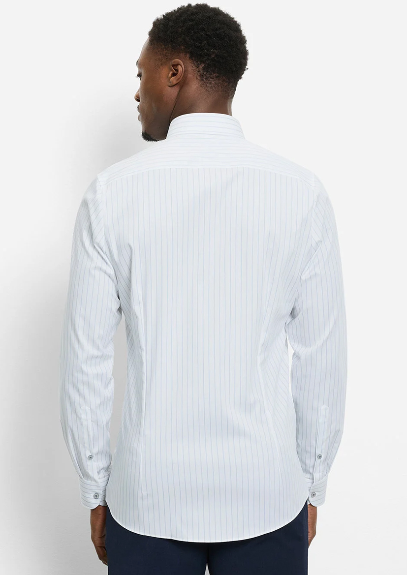 Белая деловая рубашка из хлопчатобумажной ткани в синюю полоску создает изысканный деловой образ премиум-класса. Воротник Royal Kent и облегающий крой делают сорочку стройной и скроенной по фигуре. Комфортная эластичность обеспечивает легкость движений. Регулируемые манжеты обеспечивают гибкость по ширине.
