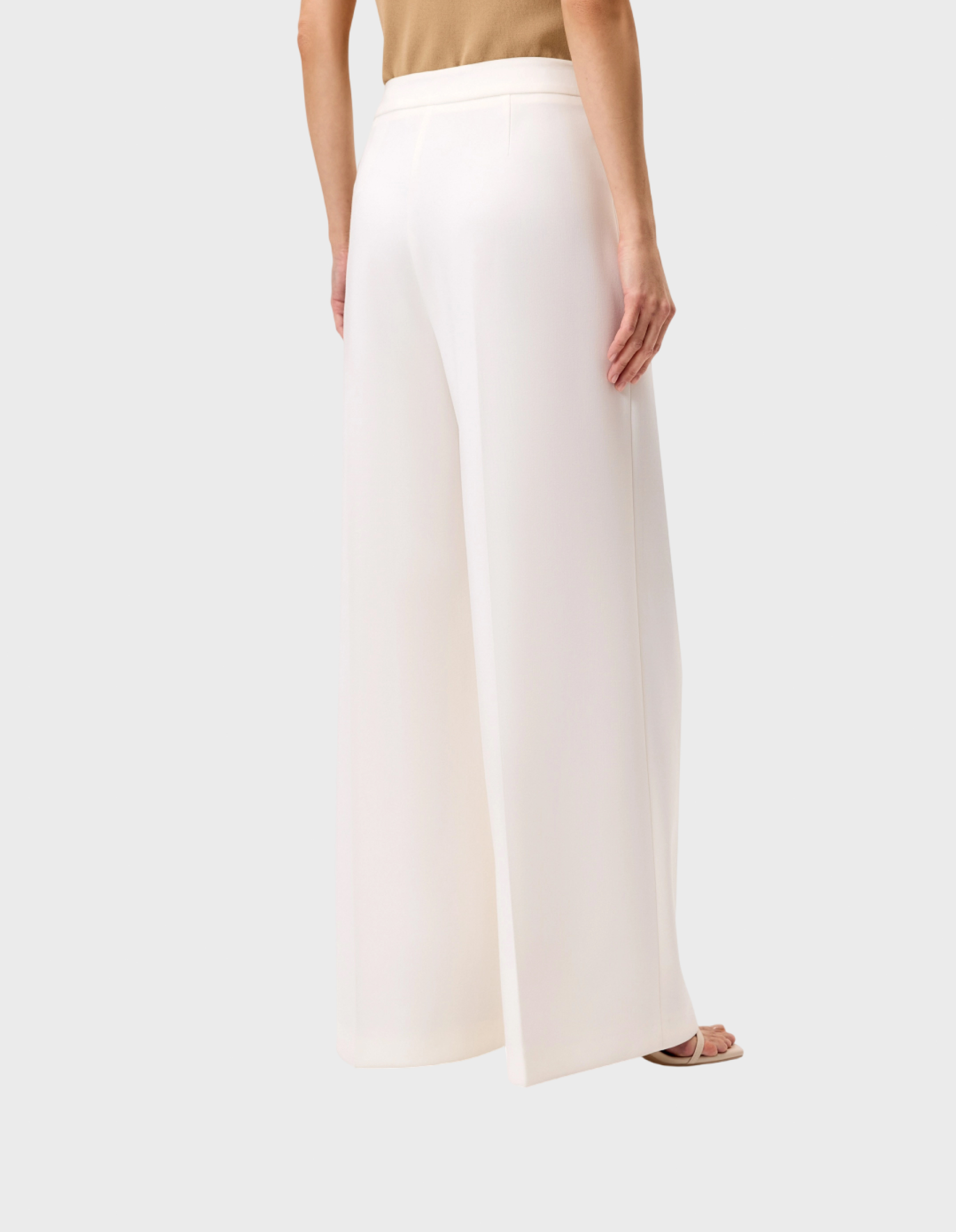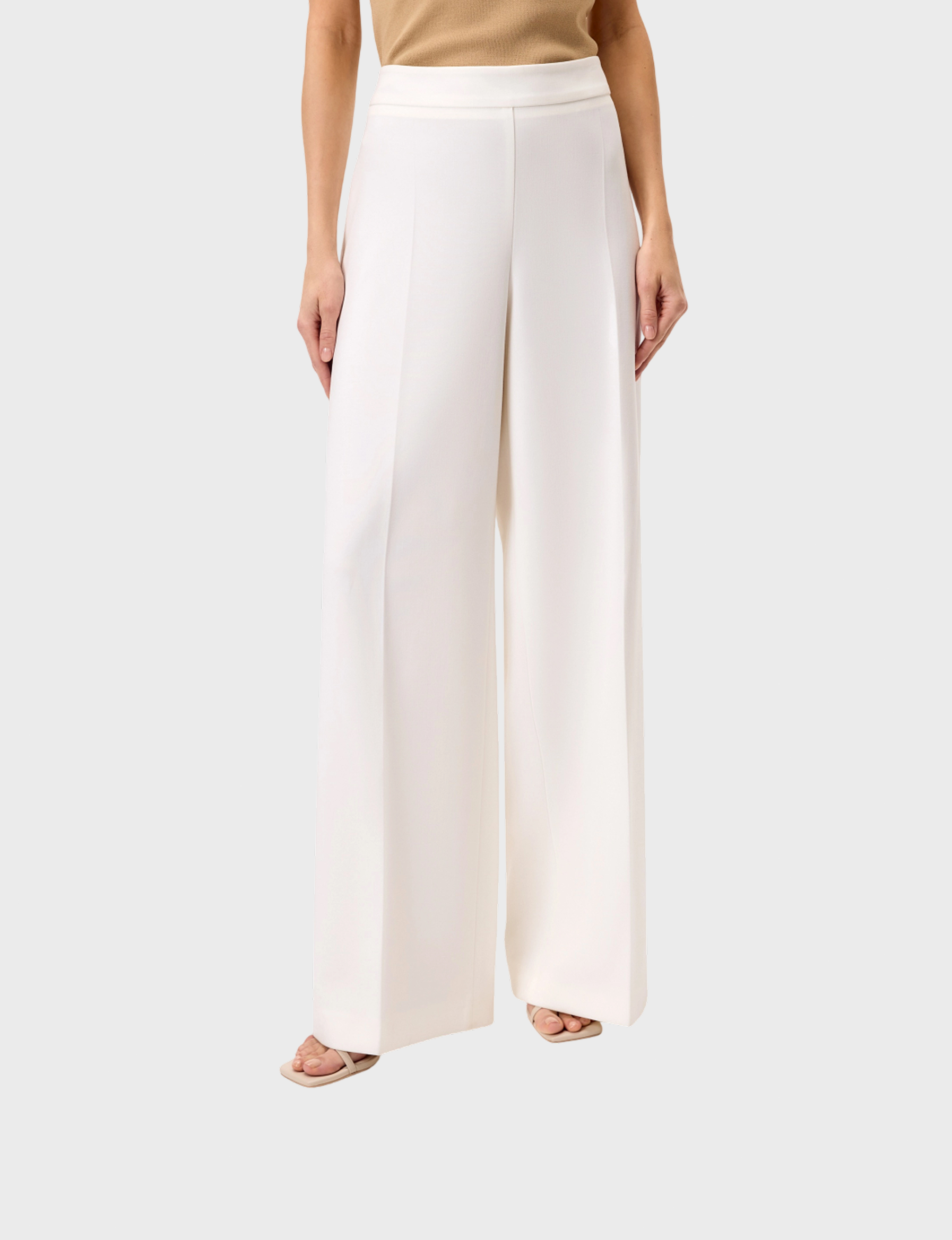 Расклешенные от бедра брюки на высокой посадке со стрелками из костюмной вискозной ткани молочного цвета на притачном поясе. Потайная застежка молния в боковом шве.