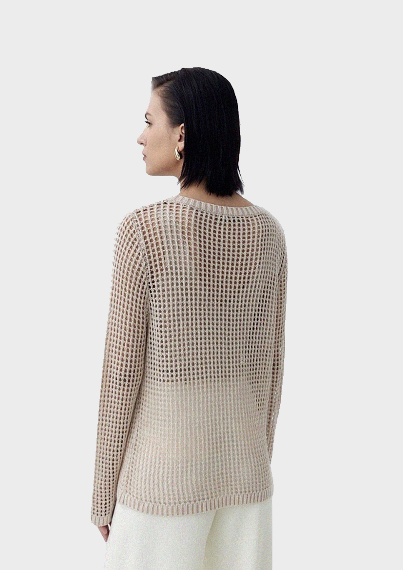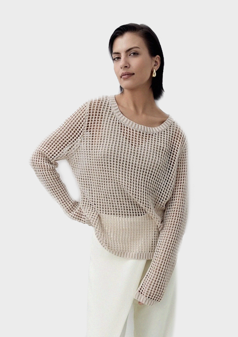 Ажурный джемпер полуприлегающего силуэта с круглой горловиной бежевого цвета. Джемпер с рукавом полной длины и спущенной линией плеча.