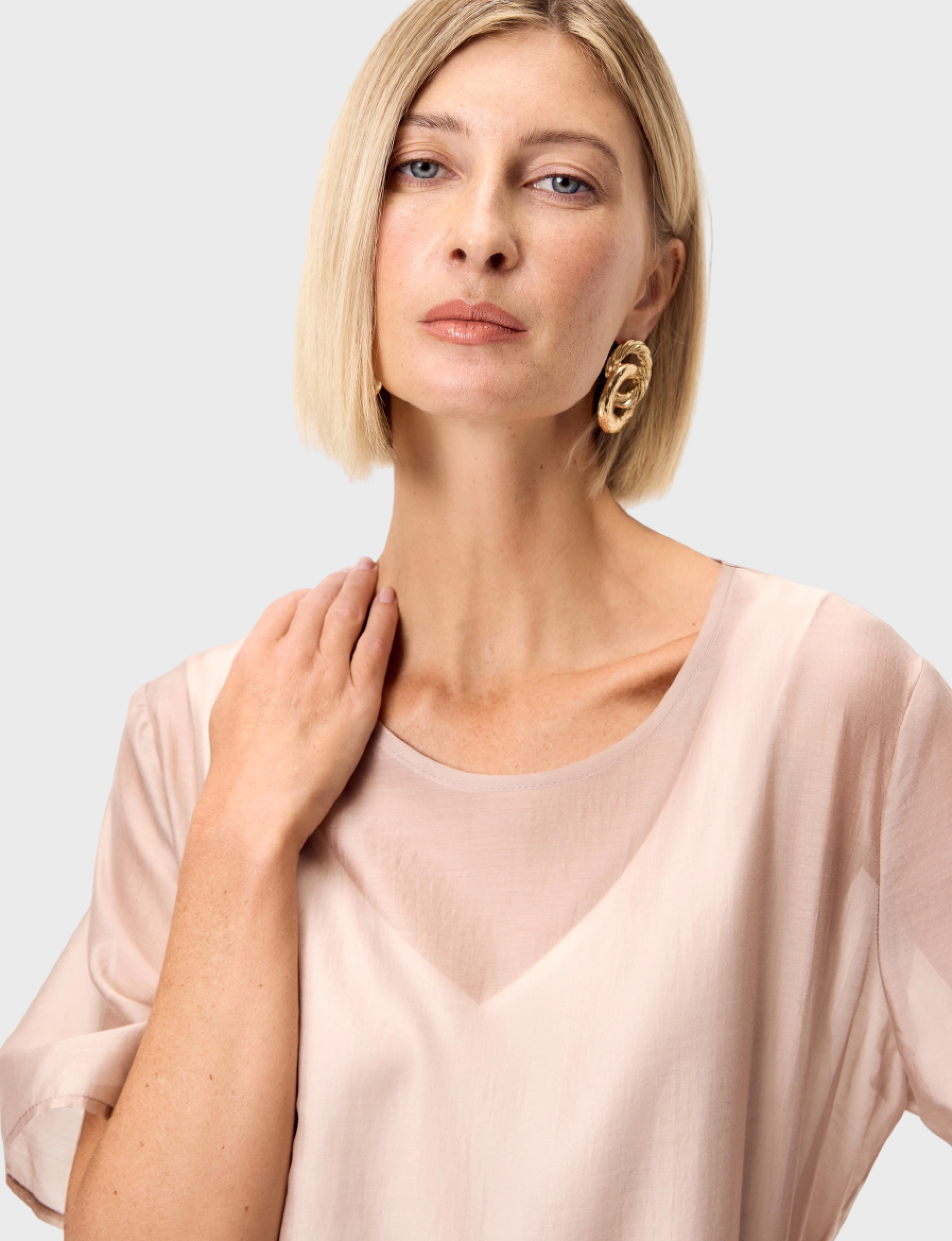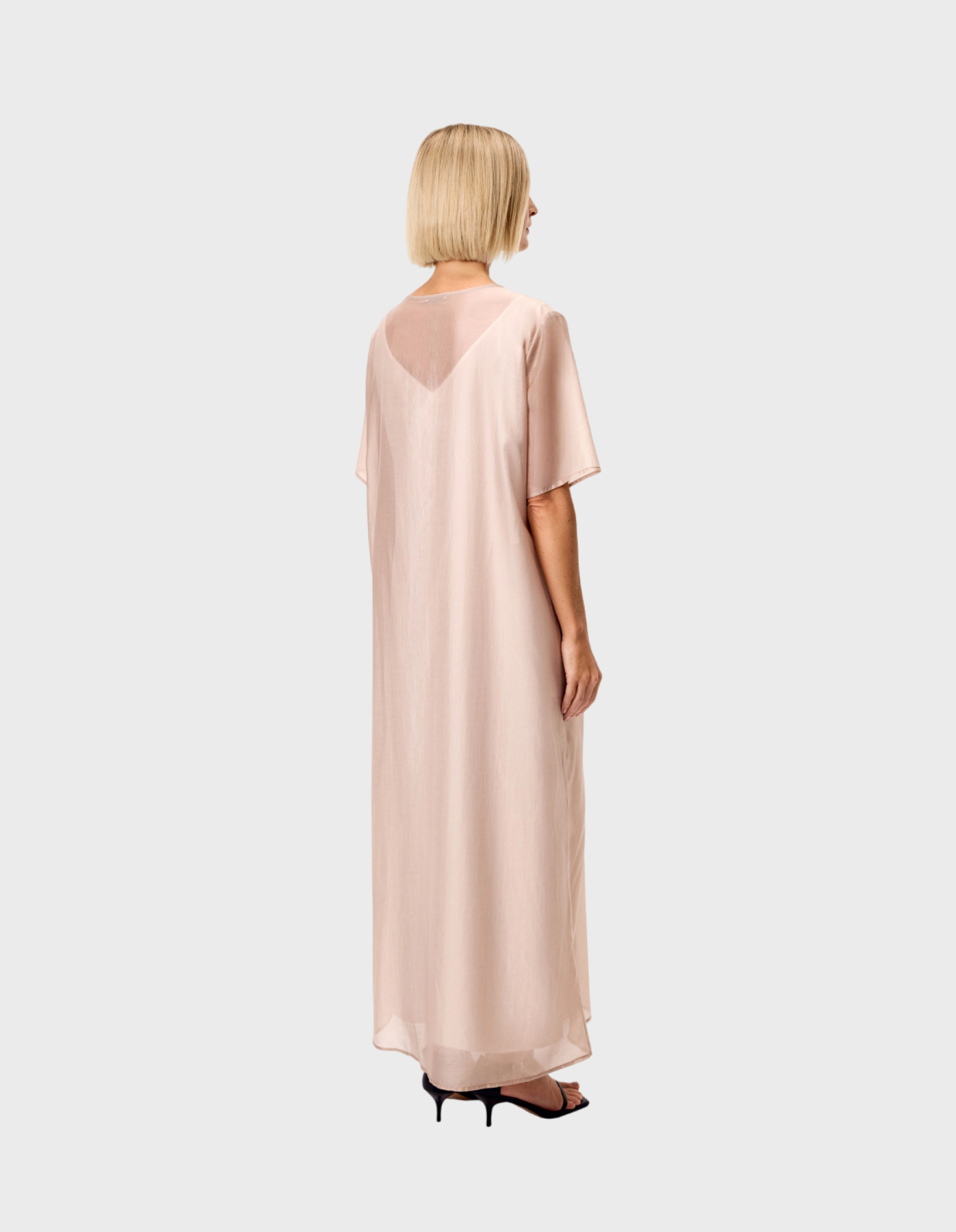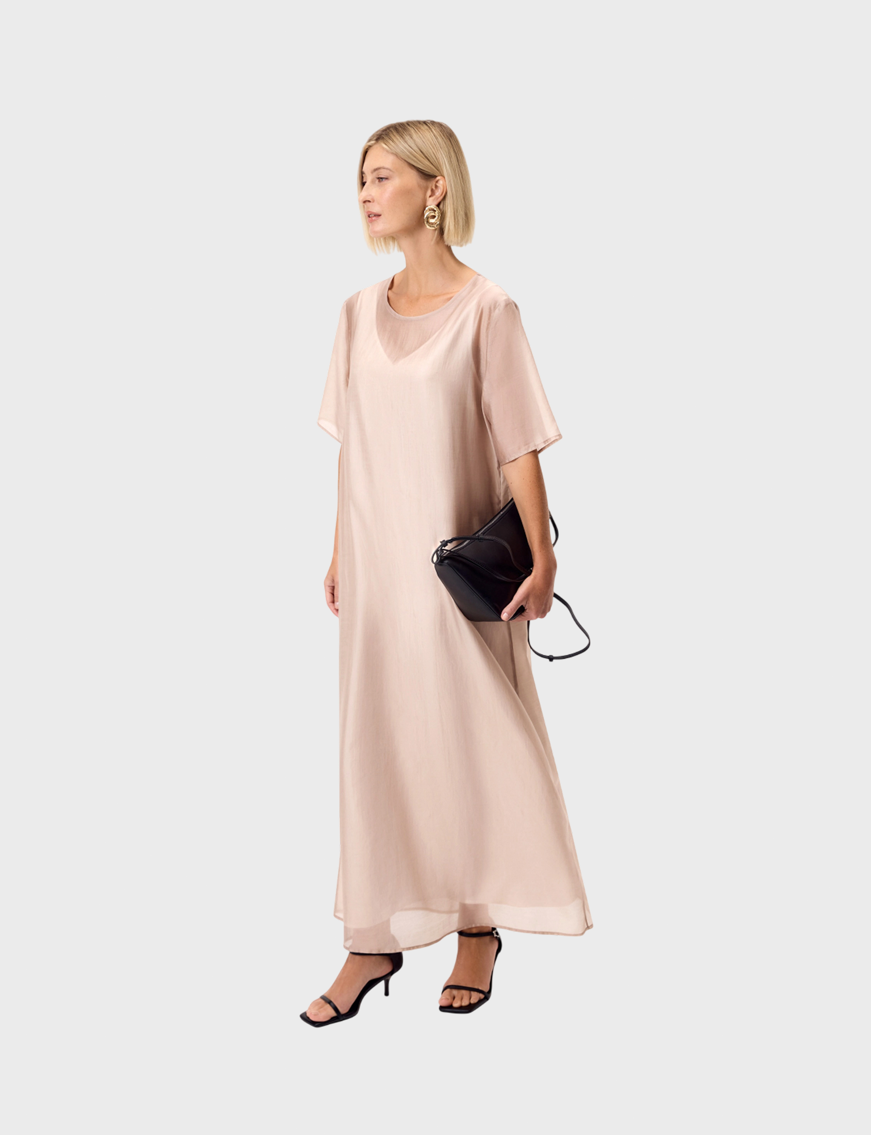 Прозрачное бежевое платье-футболка из легкой ткани. Под ним — длинное маки и белое атласное платье-комбинация.