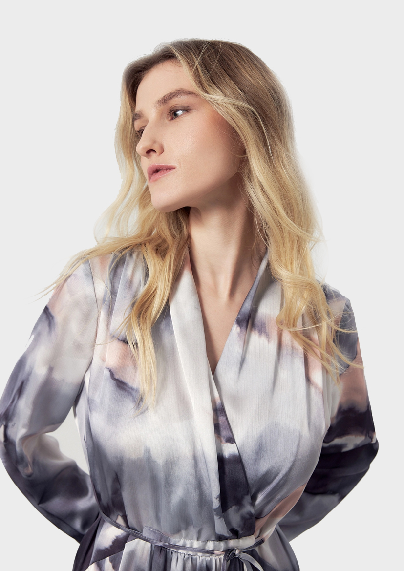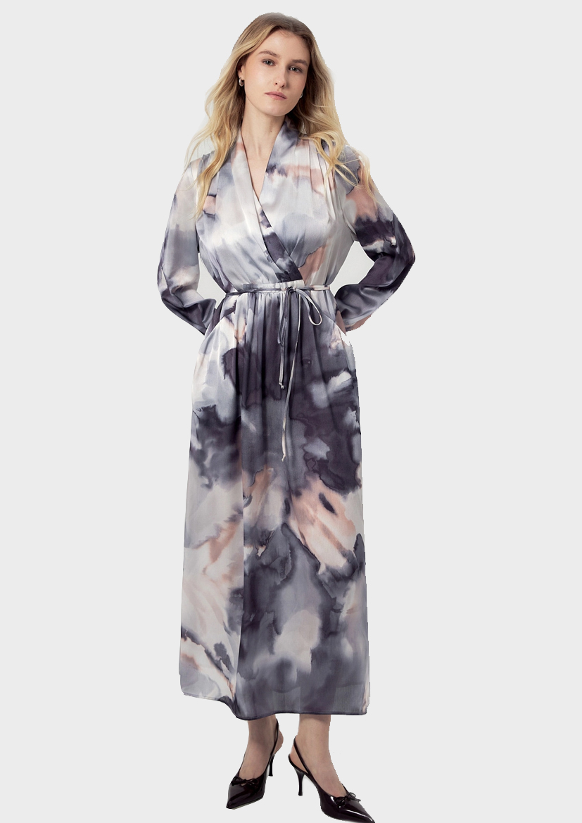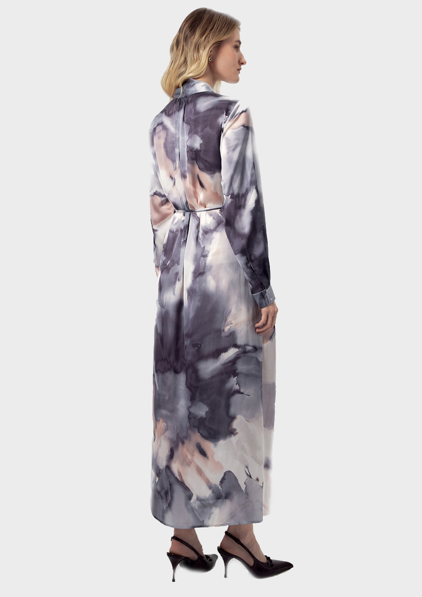 Свободное платье макси из атласной ткани в романтичном принте, по плечам складки, горловина с V-образным вырезом на запах. По переду есть кулиса и тонкая длиная завязка из основной ткани, для придания приталенного силуэта. По переду карманы. Рукав классический на манжете с пуговицей. В комплект входит нижняя юбка из подкладки.
