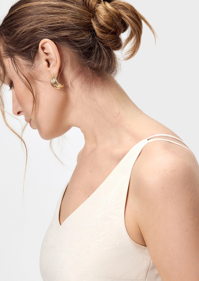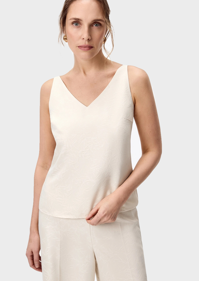 Прямой топ из атласной жаккардной ткани молочного цвета на тонких лямках с V-образным вырезом, по низу есть небольшие разрезы на боковых швах.