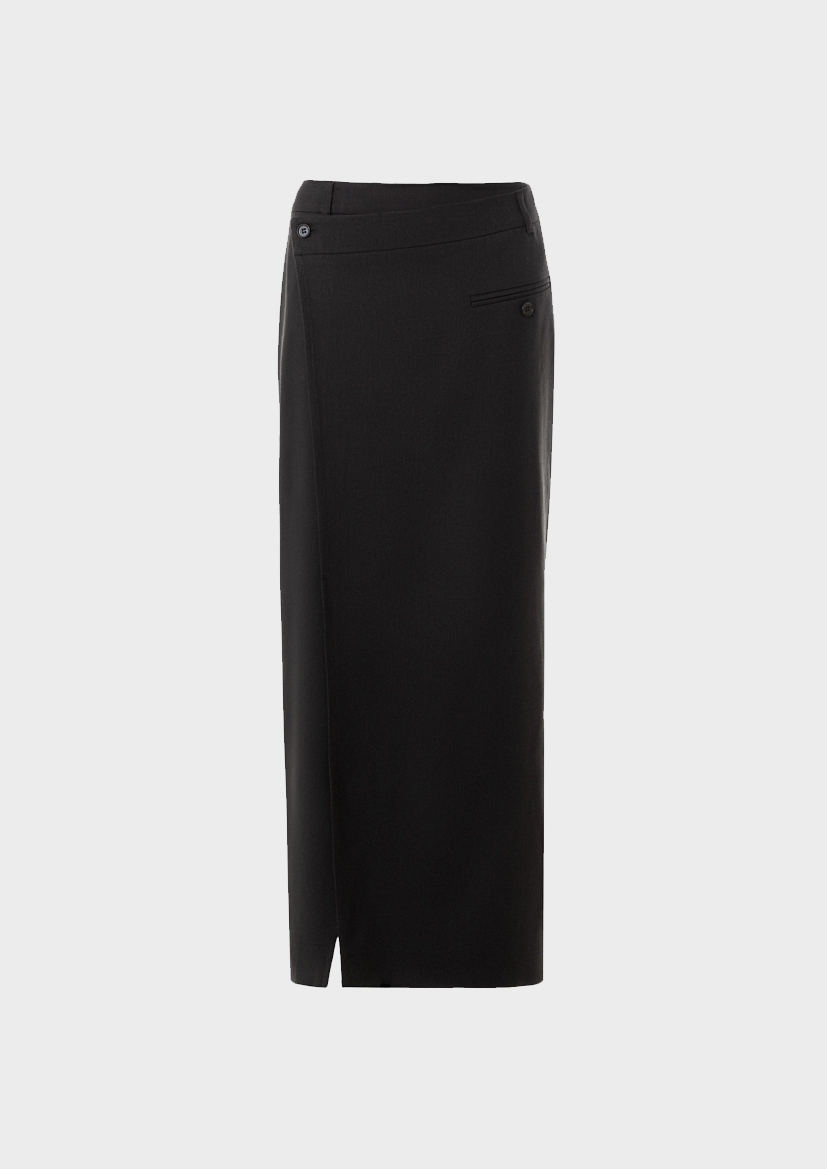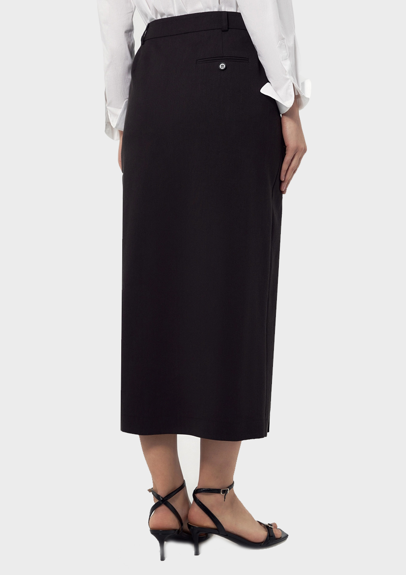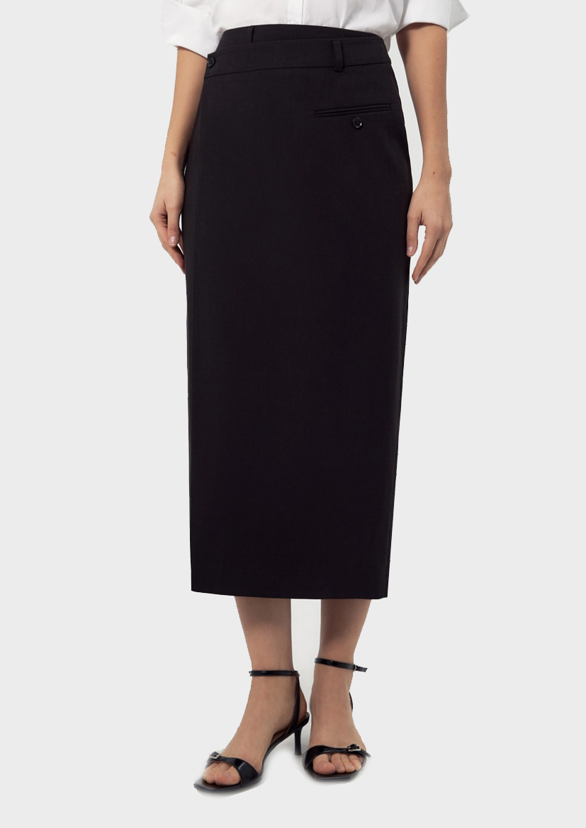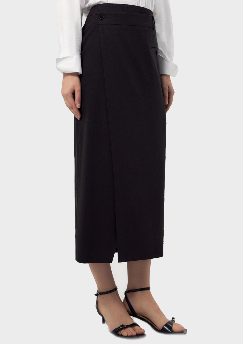 Полуприлегающая юбка миди на запах из смесовой льняной ткани черного цвета на подкройном поясе и одним прорезным карманом - листочкой с пуговицей по переду.