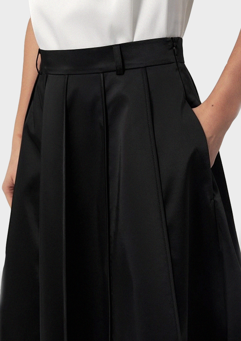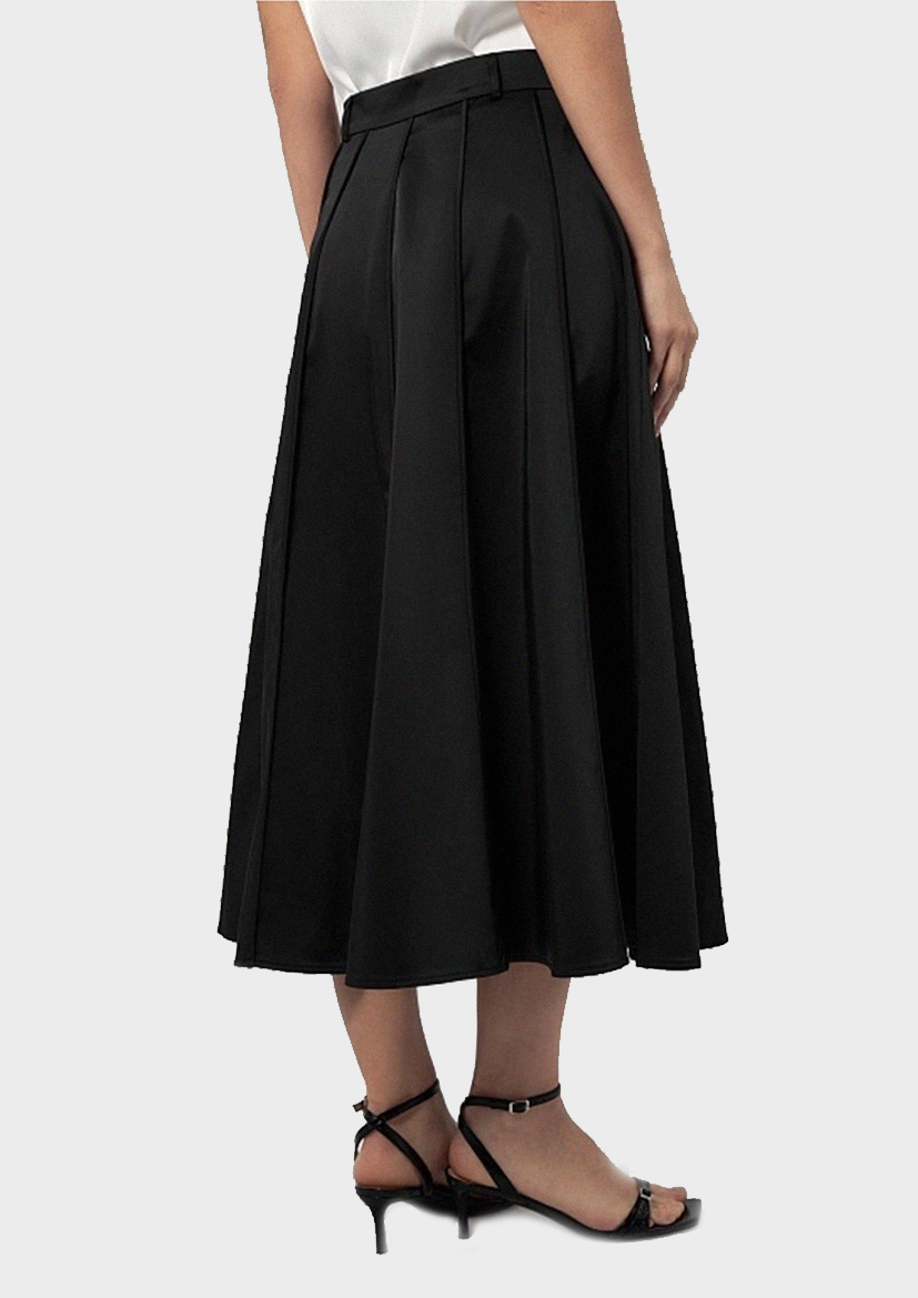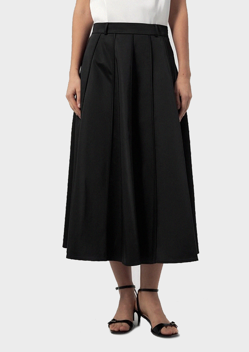 Юбка трапеция из клиньев выполнена из костюмной ткани с матовым блеском в черном цвете, на прямом поясе и потайной молнией в боковом шве.