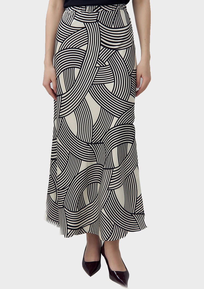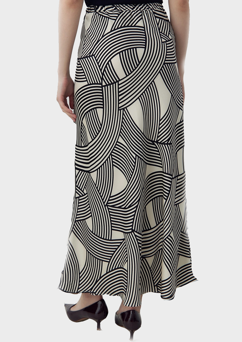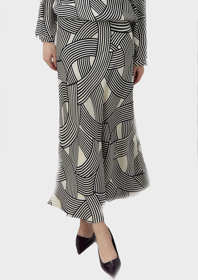 Юбка макси из плательной атласной ткани с графическим черно-белом принтом. С поясом на резинке, юбка скроена по косой.
