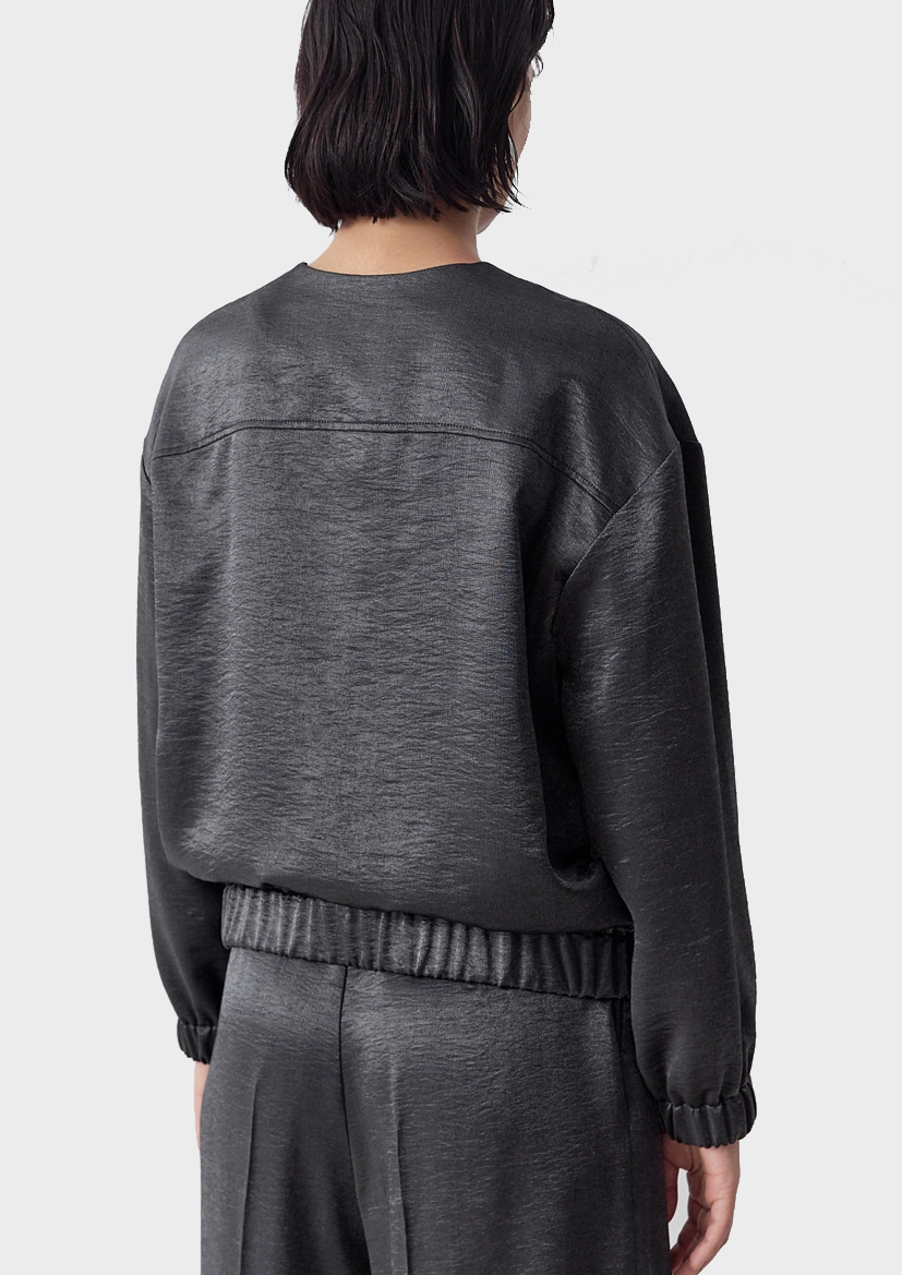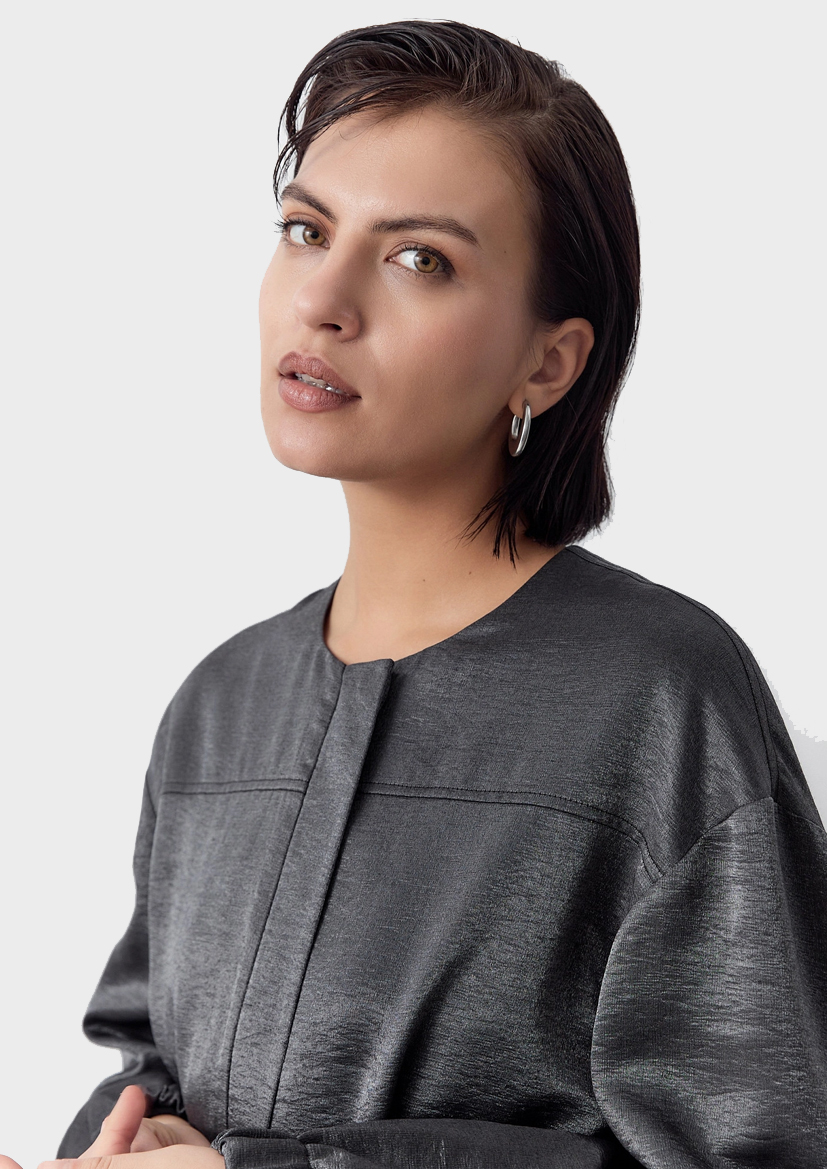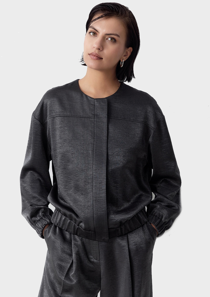 Жакет из вискозной костюмной ткани с круглой горловиной на тракторной молнии прикрытой планкой. Жакет по низу на резинке, рукава широкие на резинке по форме "балон".